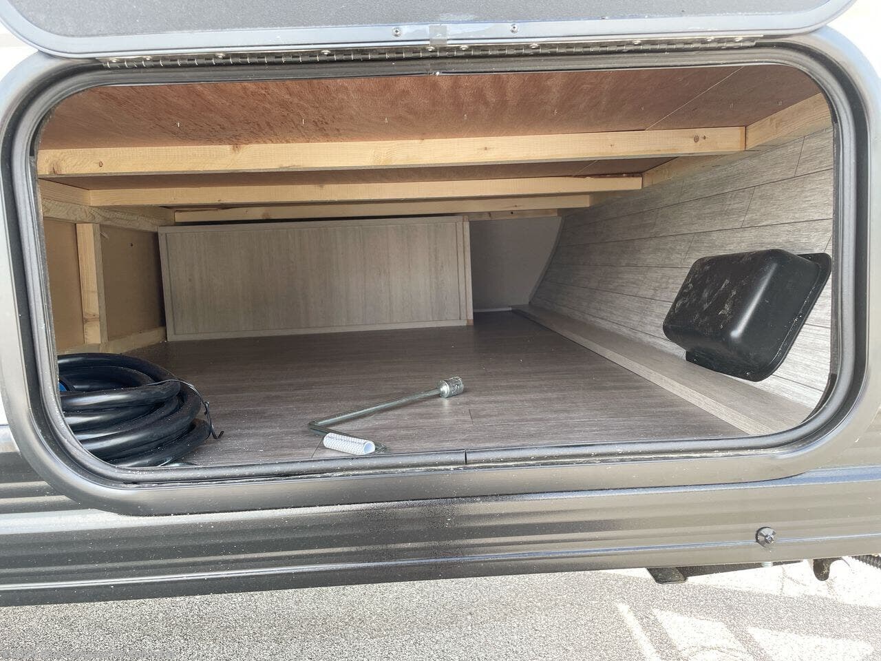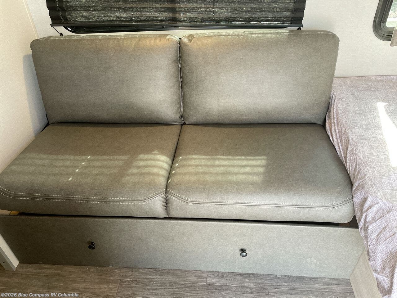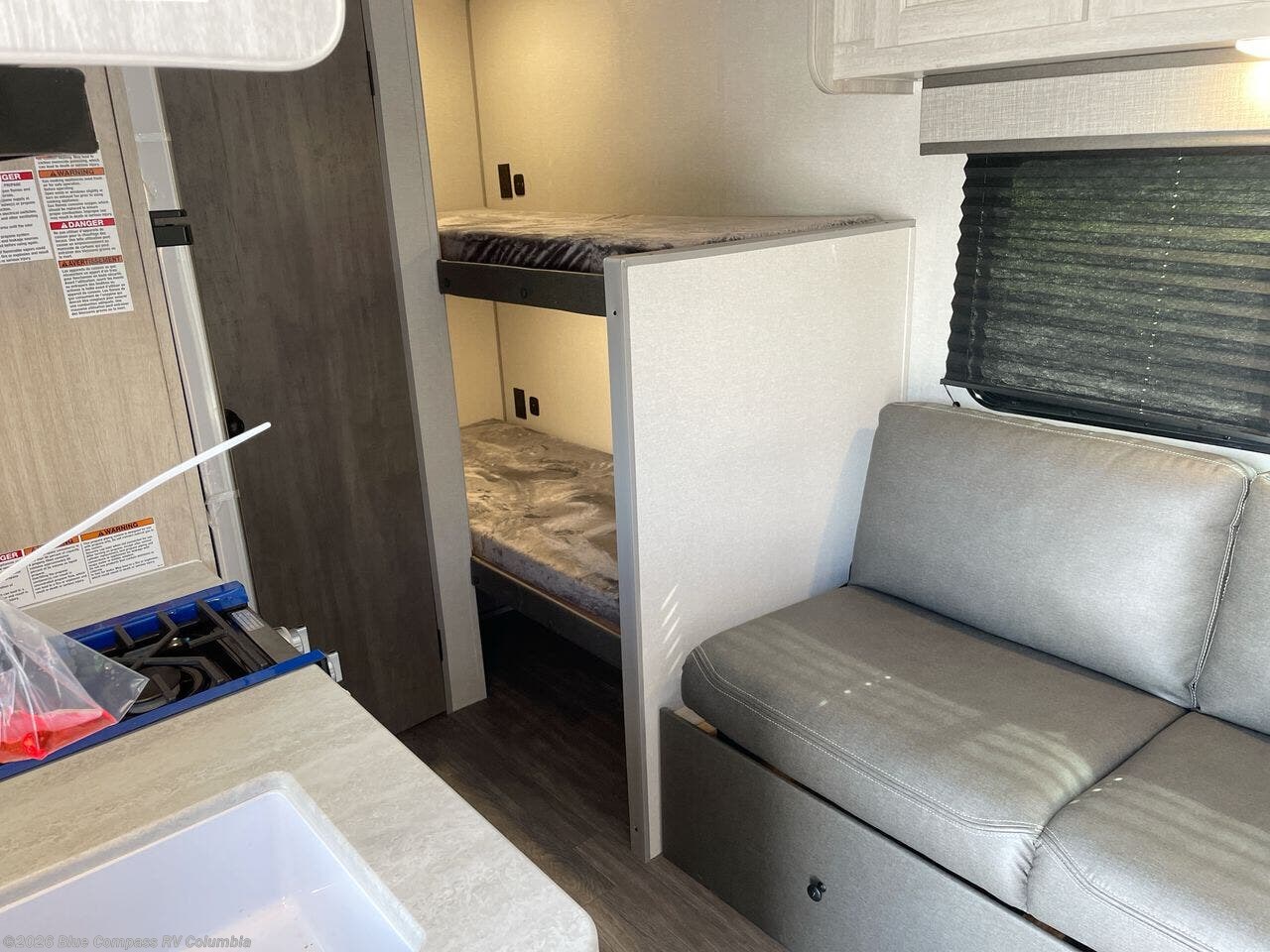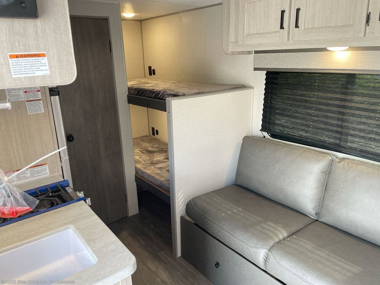 This cozy travel trailer can sleep five, so pack up and head out! You will have a queen bed up front to sleep on each night instead of an air mattress, and the little ones can take the 28" x 70" bunk beds! There is also a 60" sofa here that can sleep an additional guest and is perfect for relaxing during the day. The two burner cooktop and microwave oven means you won't have to cook over a campfire, and the private toilet and shower lets you clean up after a day outdoors. This model includes plenty of storage space, including bedroom storage, an exterior pass-through, plus additional outside storage beneath the bunks for hiking gear!