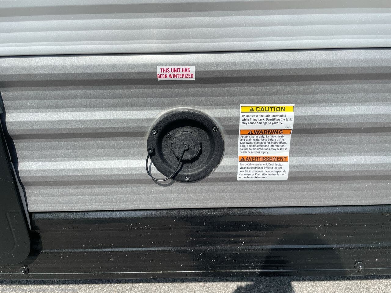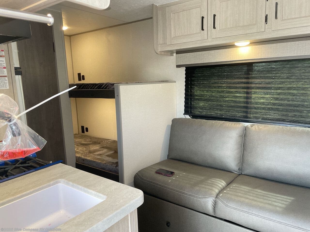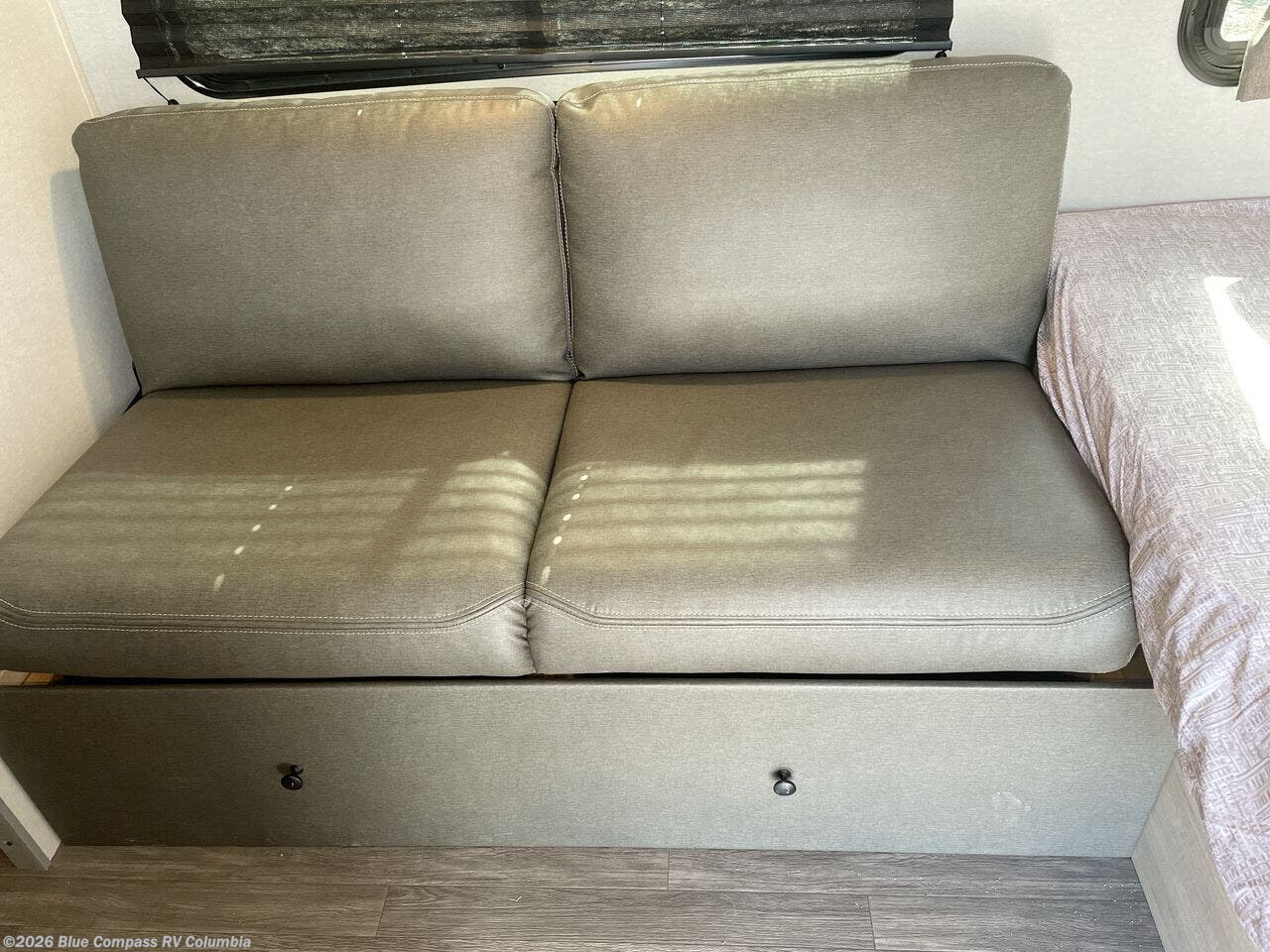 This cozy travel trailer can sleep five, so pack up and head out! You will have a queen bed up front to sleep on each night instead of an air mattress, and the little ones can take the 28" x 70" bunk beds! There is also a 60" sofa here that can sleep an additional guest and is perfect for relaxing during the day. The two burner cooktop and microwave oven means you won't have to cook over a campfire, and the private toilet and shower lets you clean up after a day outdoors. This model includes plenty of storage space, including bedroom storage, an exterior pass-through, plus additional outside storage beneath the bunks for hiking gear!