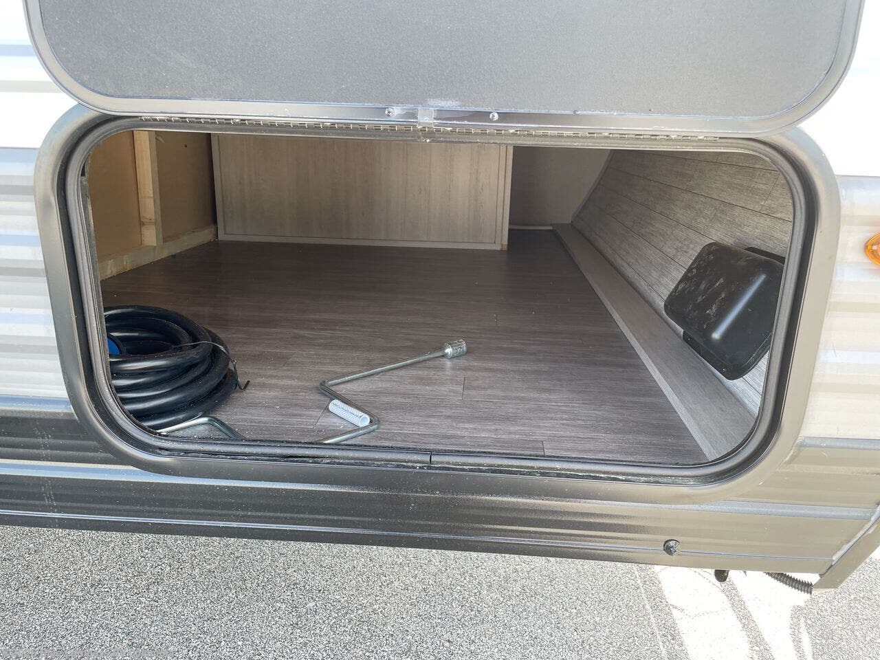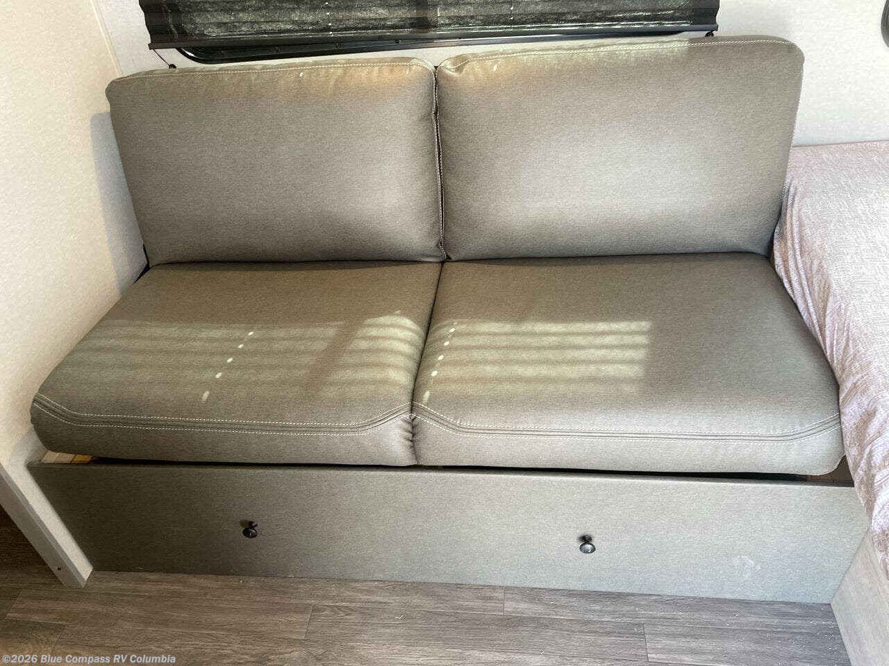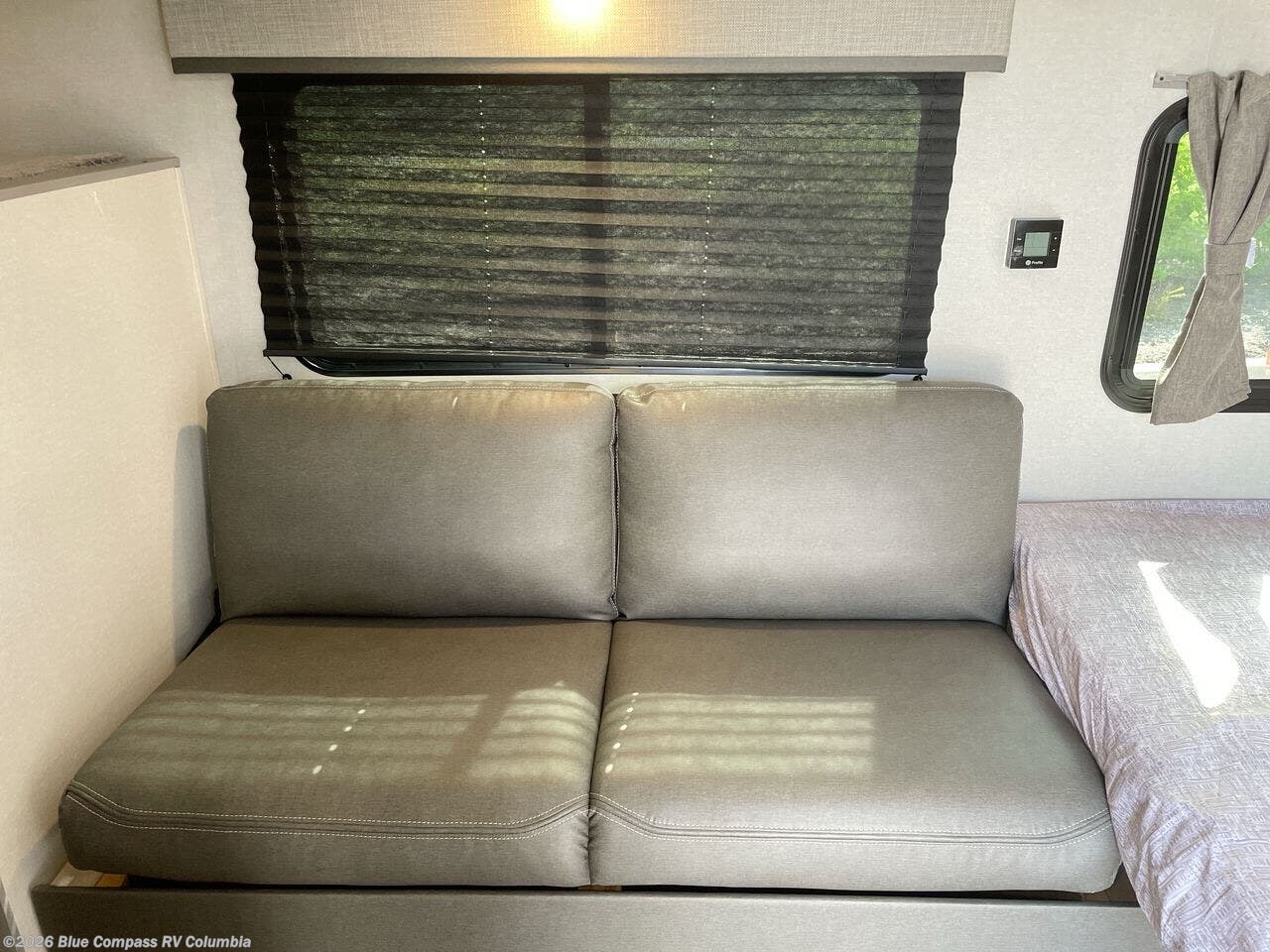 This cozy travel trailer can sleep five, so pack up and head out! You will have a queen bed up front to sleep on each night instead of an air mattress, and the little ones can take the 28" x 70" bunk beds! There is also a 60" sofa here that can sleep an additional guest and is perfect for relaxing during the day. The two burner cooktop and microwave oven means you won't have to cook over a campfire, and the private toilet and shower lets you clean up after a day outdoors. This model includes plenty of storage space, including bedroom storage, an exterior pass-through, plus additional outside storage beneath the bunks for hiking gear!