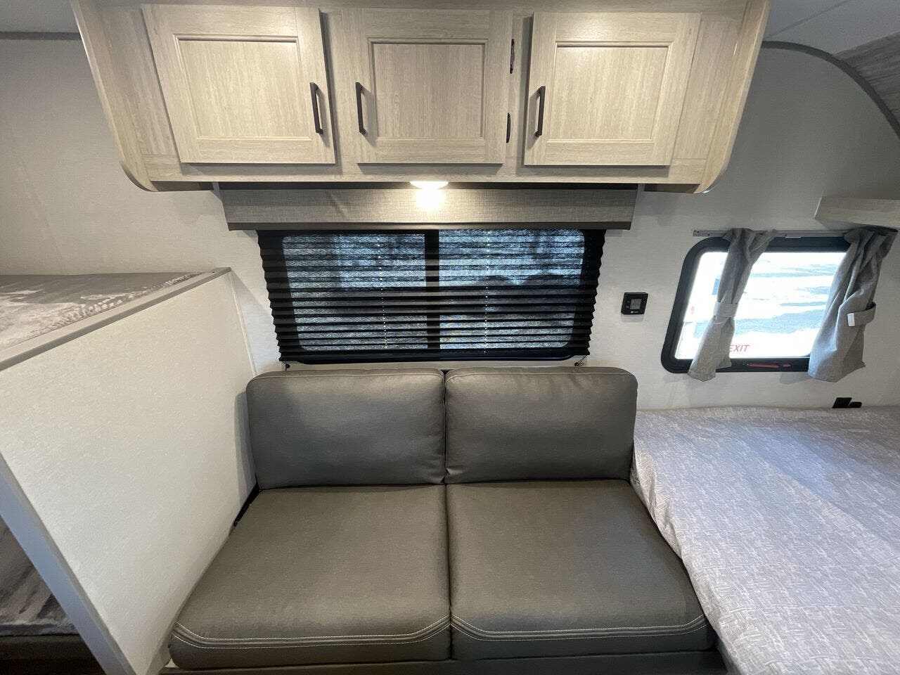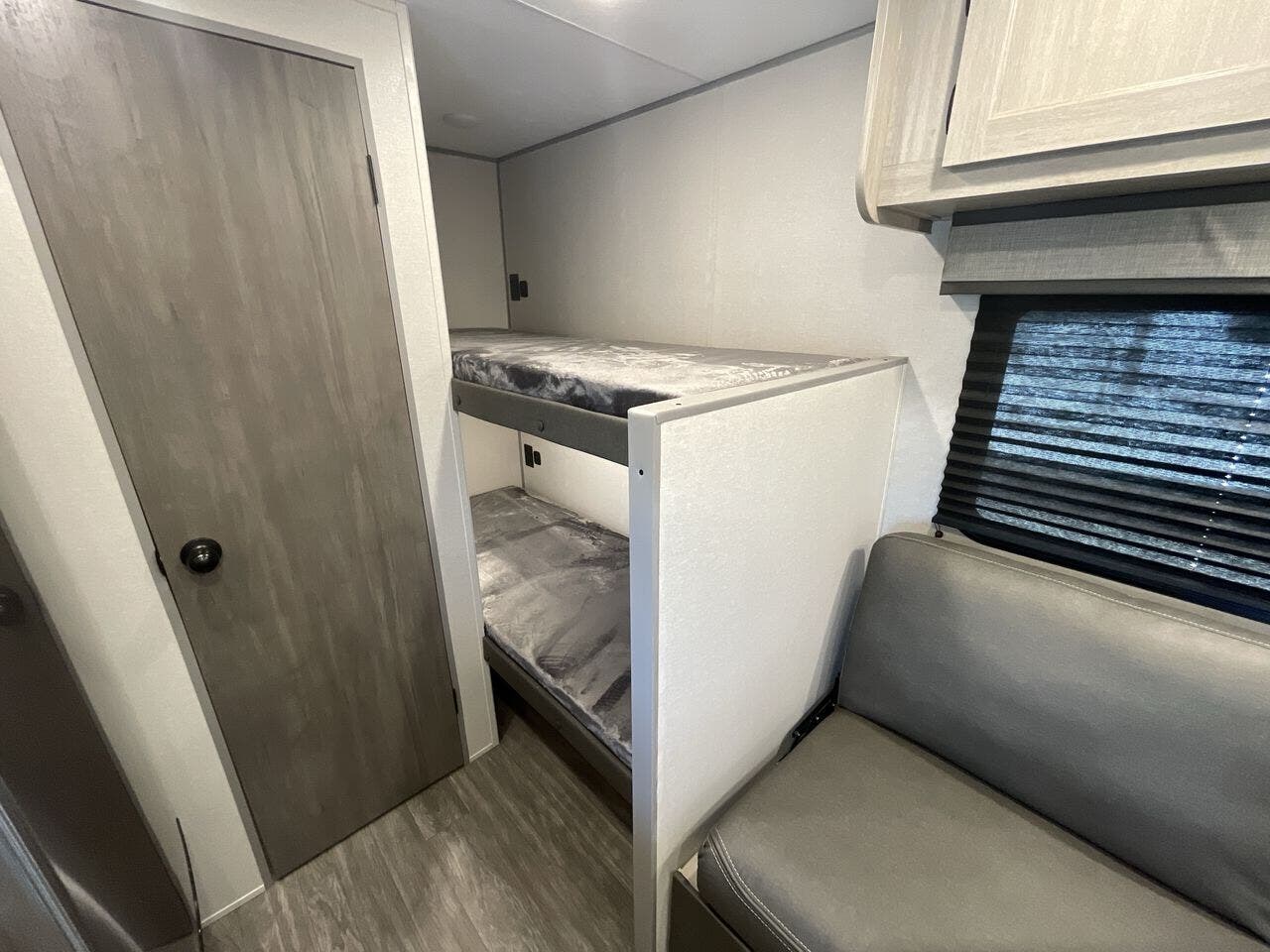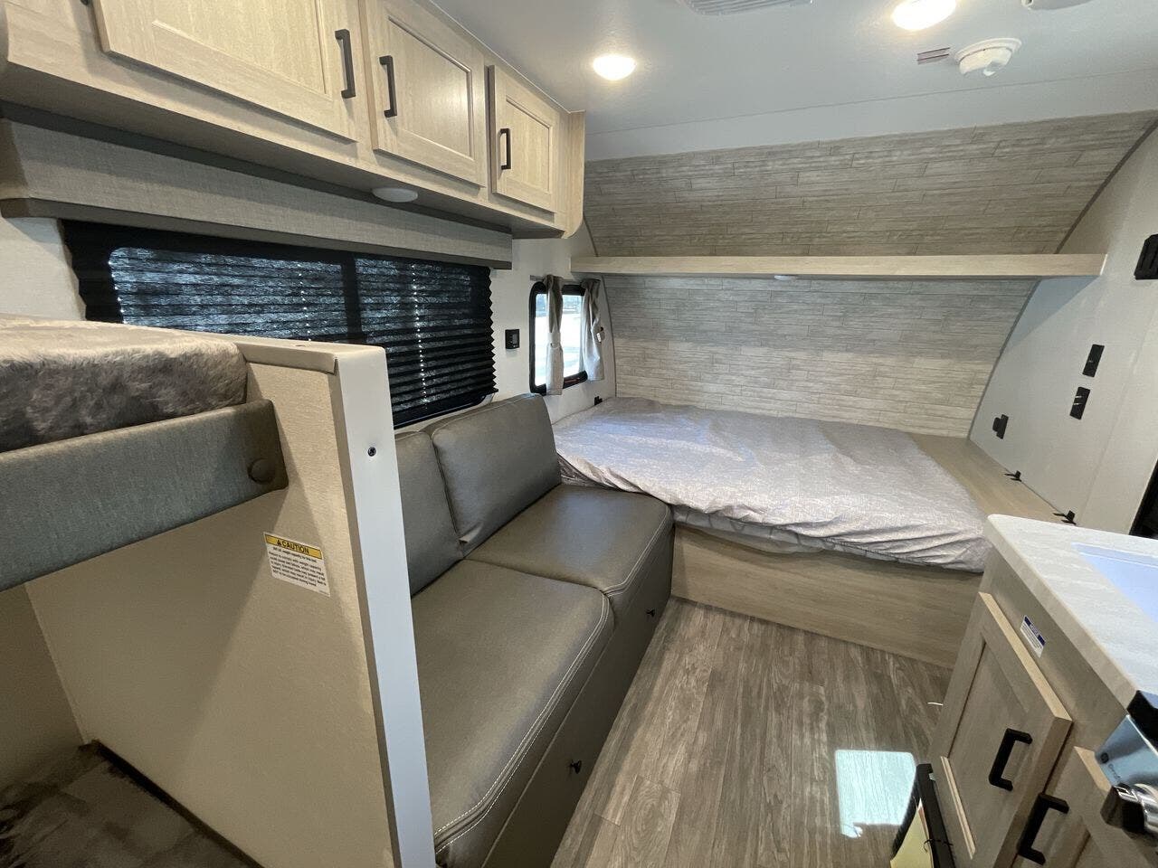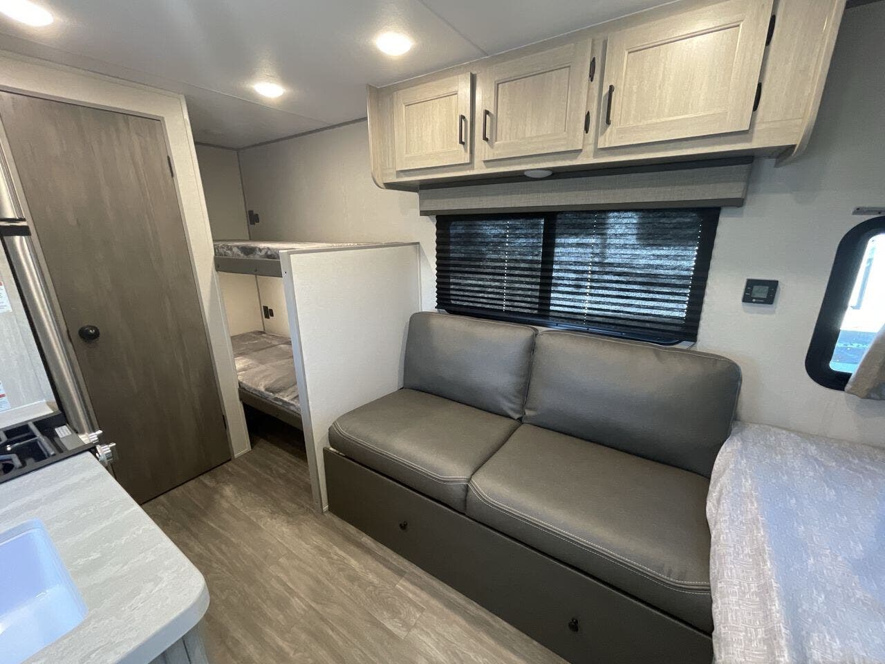 This cozy travel trailer can sleep five, so pack up and head out! You will have a queen bed up front to sleep on each night instead of an air mattress, and the little ones can take the 28" x 70" bunk beds! There is also a 60" sofa here that can sleep an additional guest and is perfect for relaxing during the day. The two burner cooktop and microwave oven means you won't have to cook over a campfire, and the private toilet and shower lets you clean up after a day outdoors. This model includes plenty of storage space, including bedroom storage, an exterior pass-through, plus additional outside storage beneath the bunks for hiking gear!