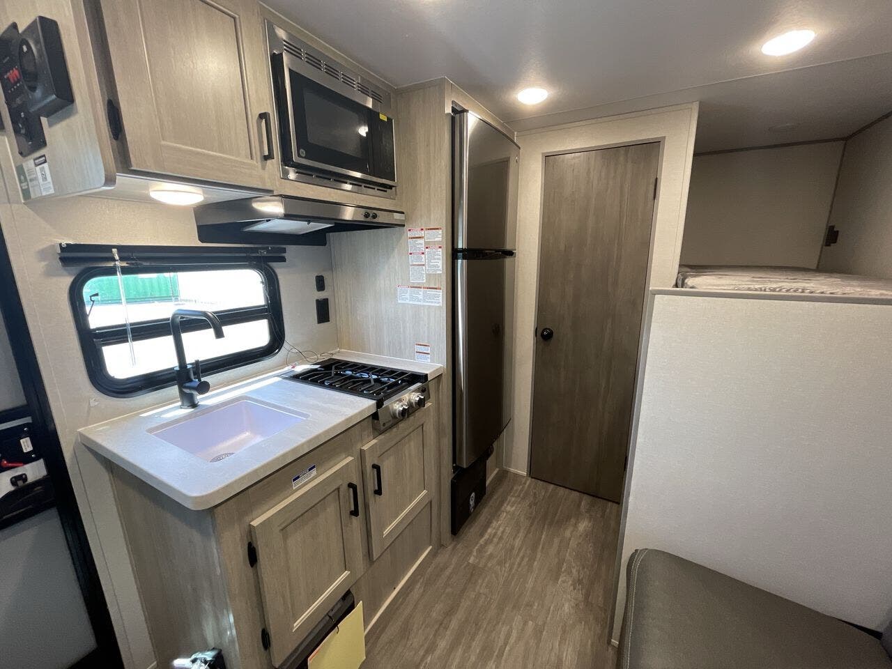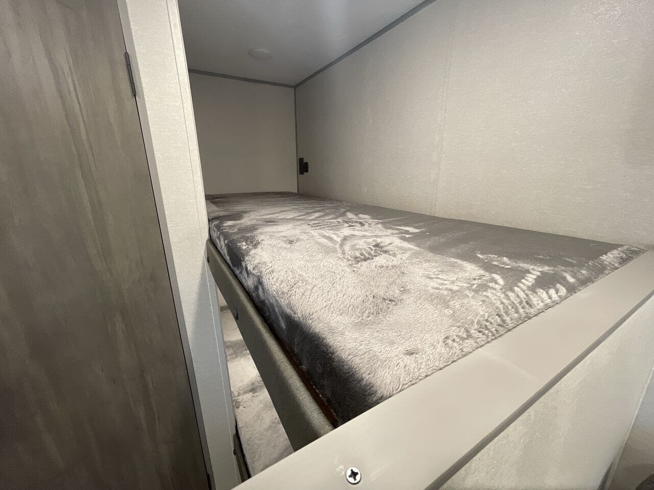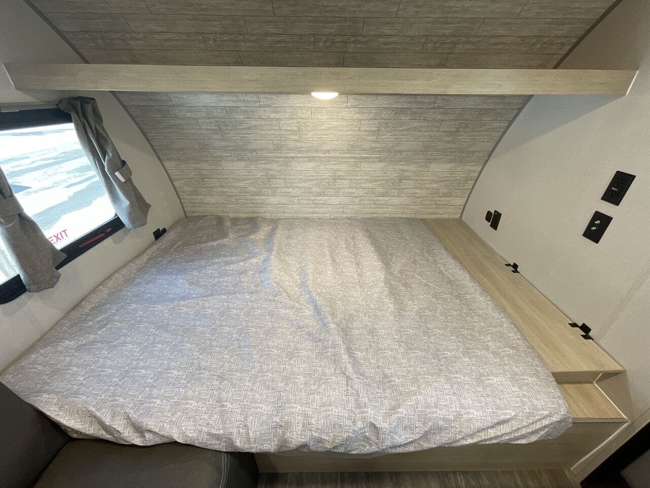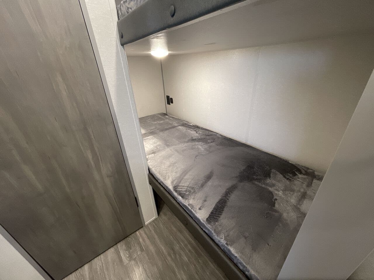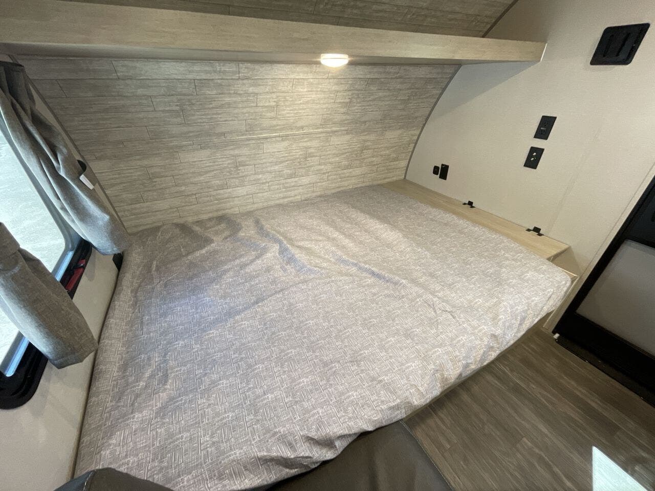 This cozy travel trailer can sleep five, so pack up and head out! You will have a queen bed up front to sleep on each night instead of an air mattress, and the little ones can take the 28" x 70" bunk beds! There is also a 60" sofa here that can sleep an additional guest and is perfect for relaxing during the day. The two burner cooktop and microwave oven means you won't have to cook over a campfire, and the private toilet and shower lets you clean up after a day outdoors. This model includes plenty of storage space, including bedroom storage, an exterior pass-through, plus additional outside storage beneath the bunks for hiking gear!