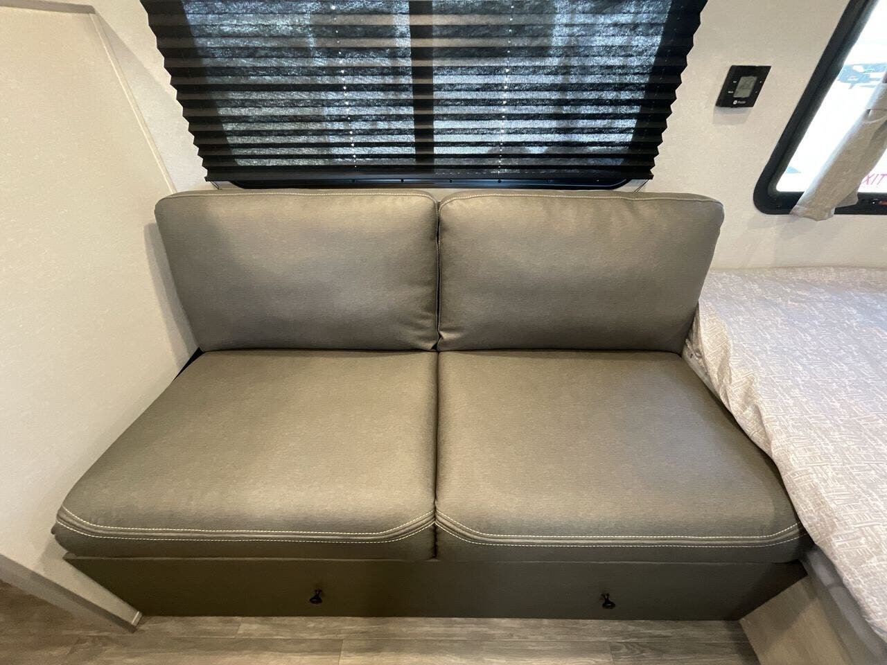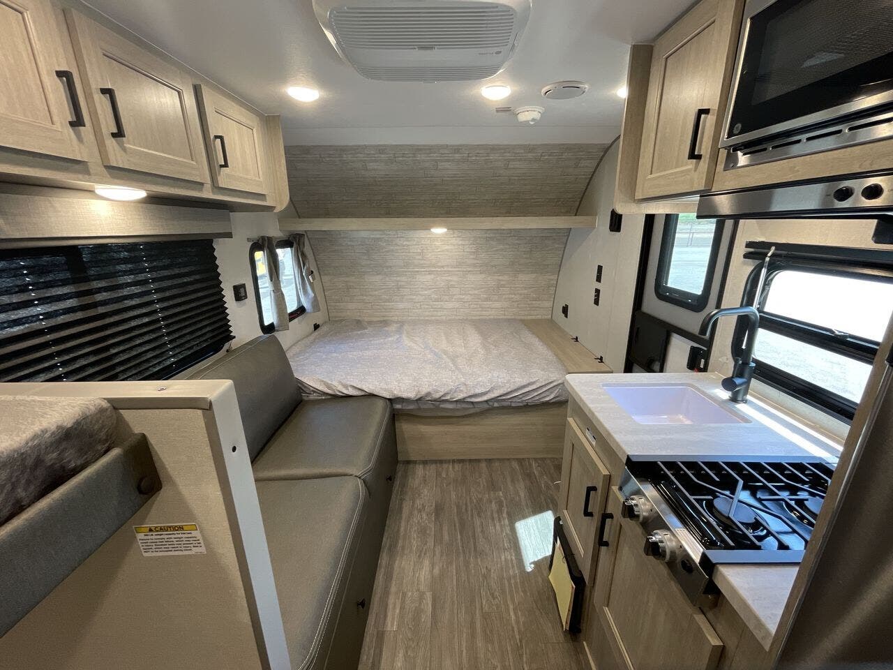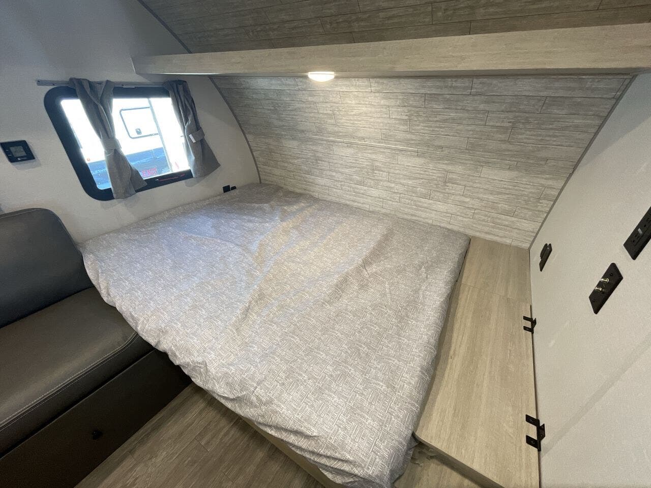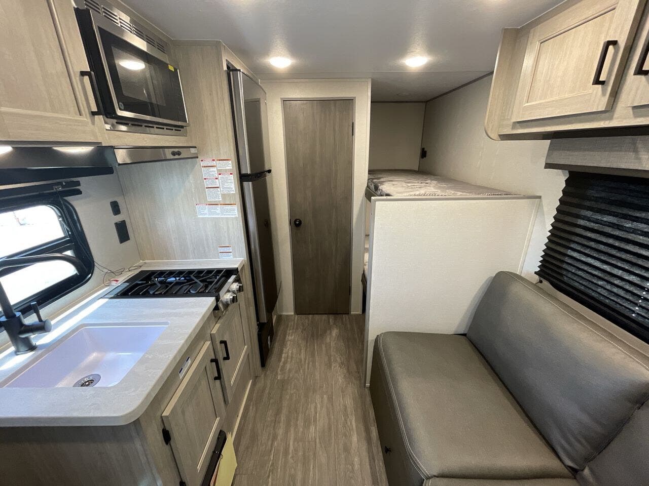 This cozy travel trailer can sleep five, so pack up and head out! You will have a queen bed up front to sleep on each night instead of an air mattress, and the little ones can take the 28" x 70" bunk beds! There is also a 60" sofa here that can sleep an additional guest and is perfect for relaxing during the day. The two burner cooktop and microwave oven means you won't have to cook over a campfire, and the private toilet and shower lets you clean up after a day outdoors. This model includes plenty of storage space, including bedroom storage, an exterior pass-through, plus additional outside storage beneath the bunks for hiking gear!