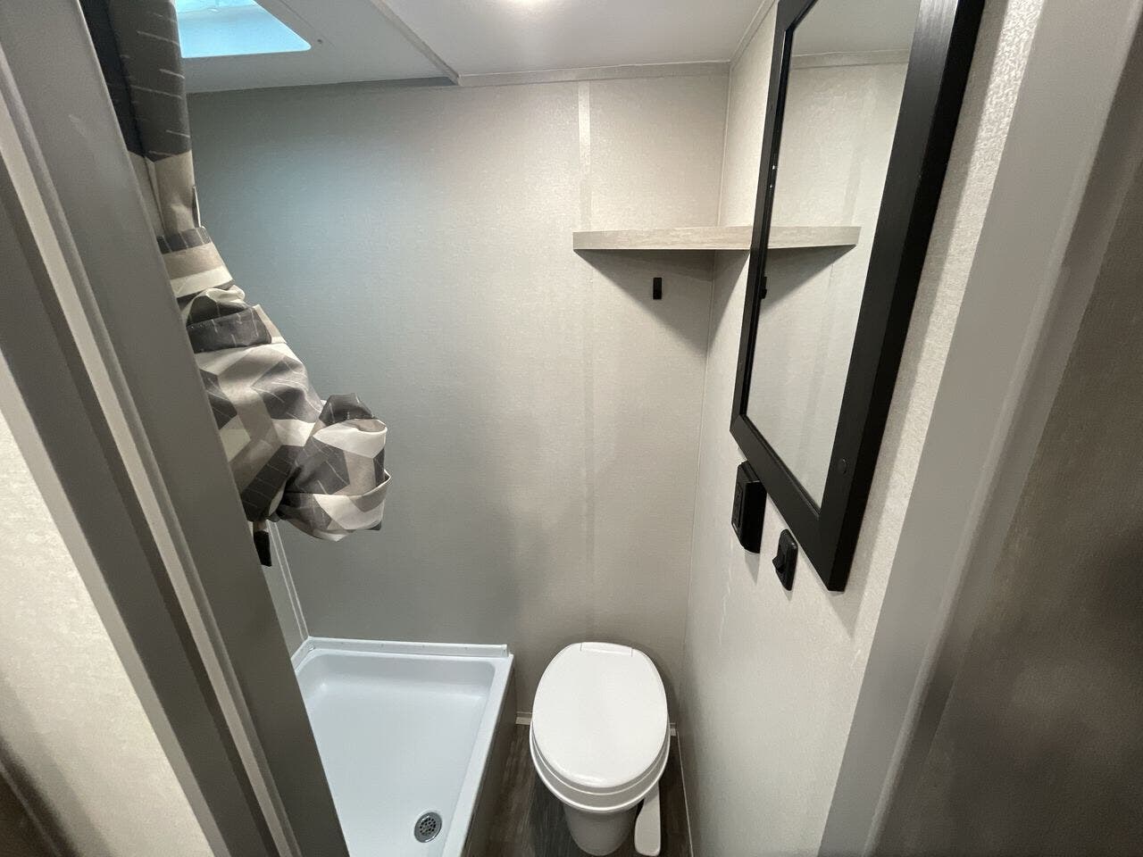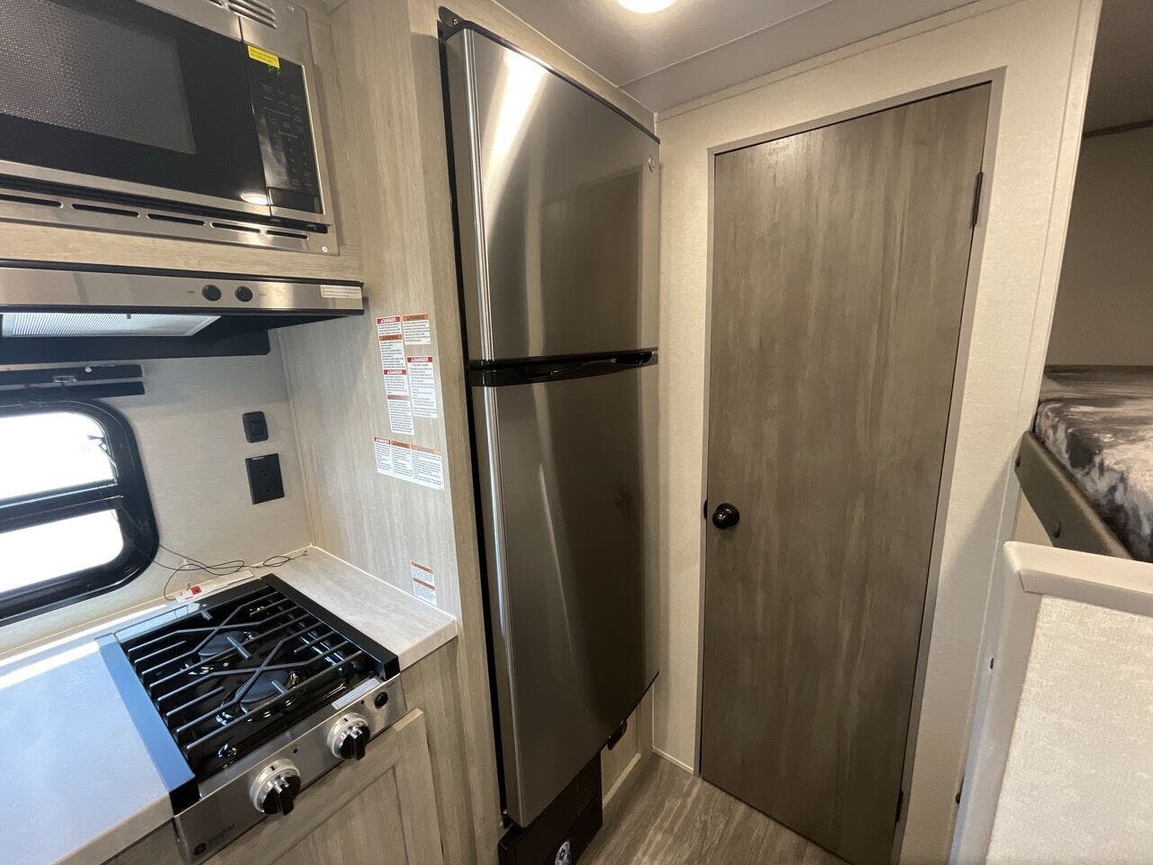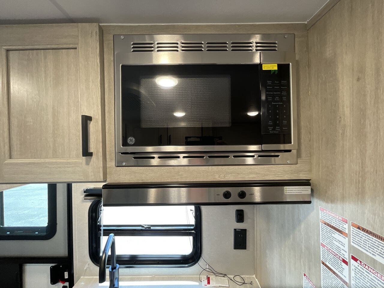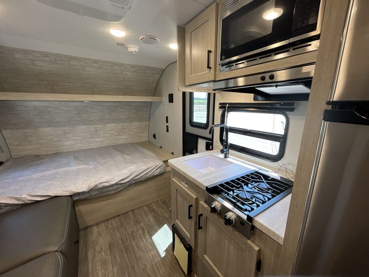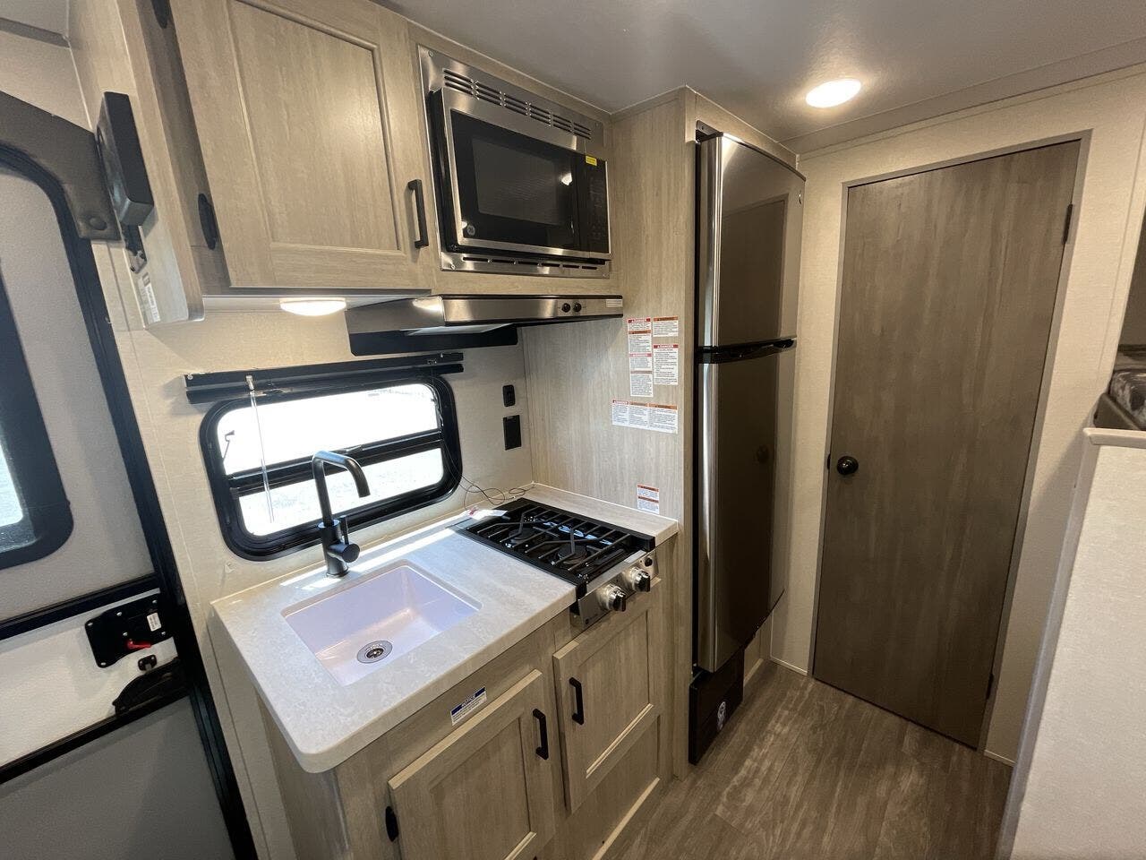 This cozy travel trailer can sleep five, so pack up and head out! You will have a queen bed up front to sleep on each night instead of an air mattress, and the little ones can take the 28" x 70" bunk beds! There is also a 60" sofa here that can sleep an additional guest and is perfect for relaxing during the day. The two burner cooktop and microwave oven means you won't have to cook over a campfire, and the private toilet and shower lets you clean up after a day outdoors. This model includes plenty of storage space, including bedroom storage, an exterior pass-through, plus additional outside storage beneath the bunks for hiking gear!
