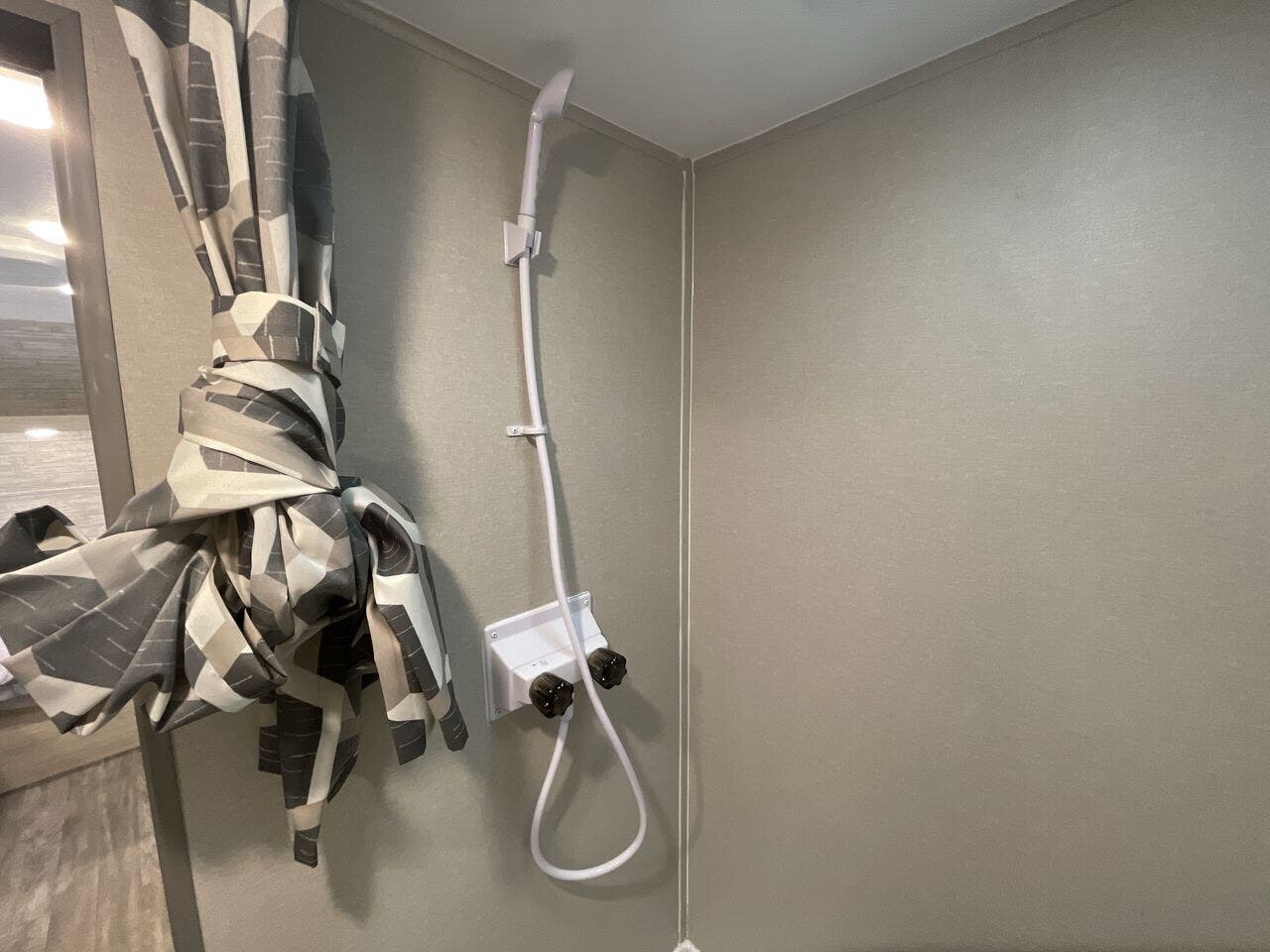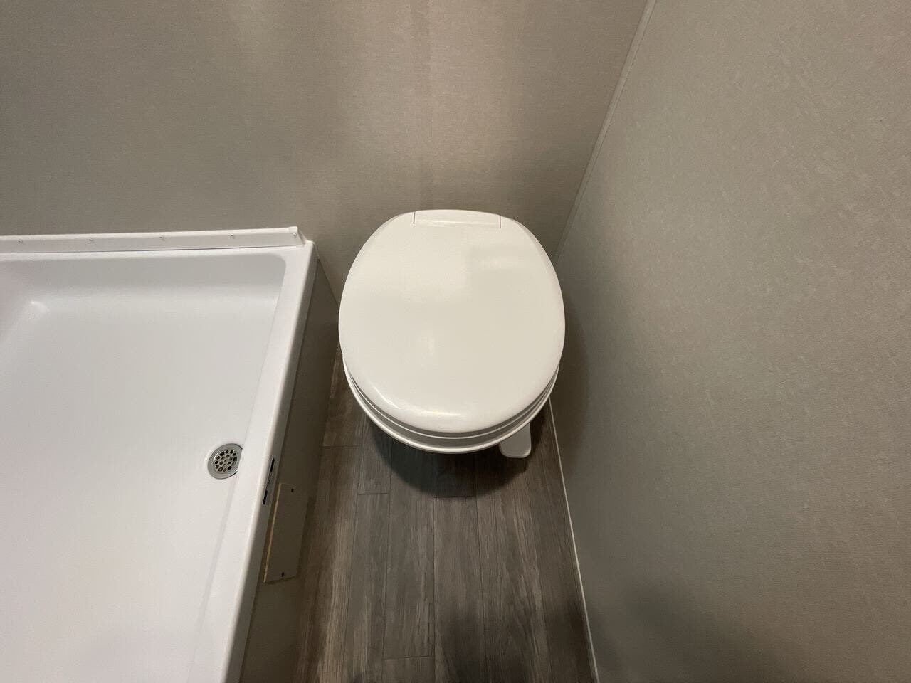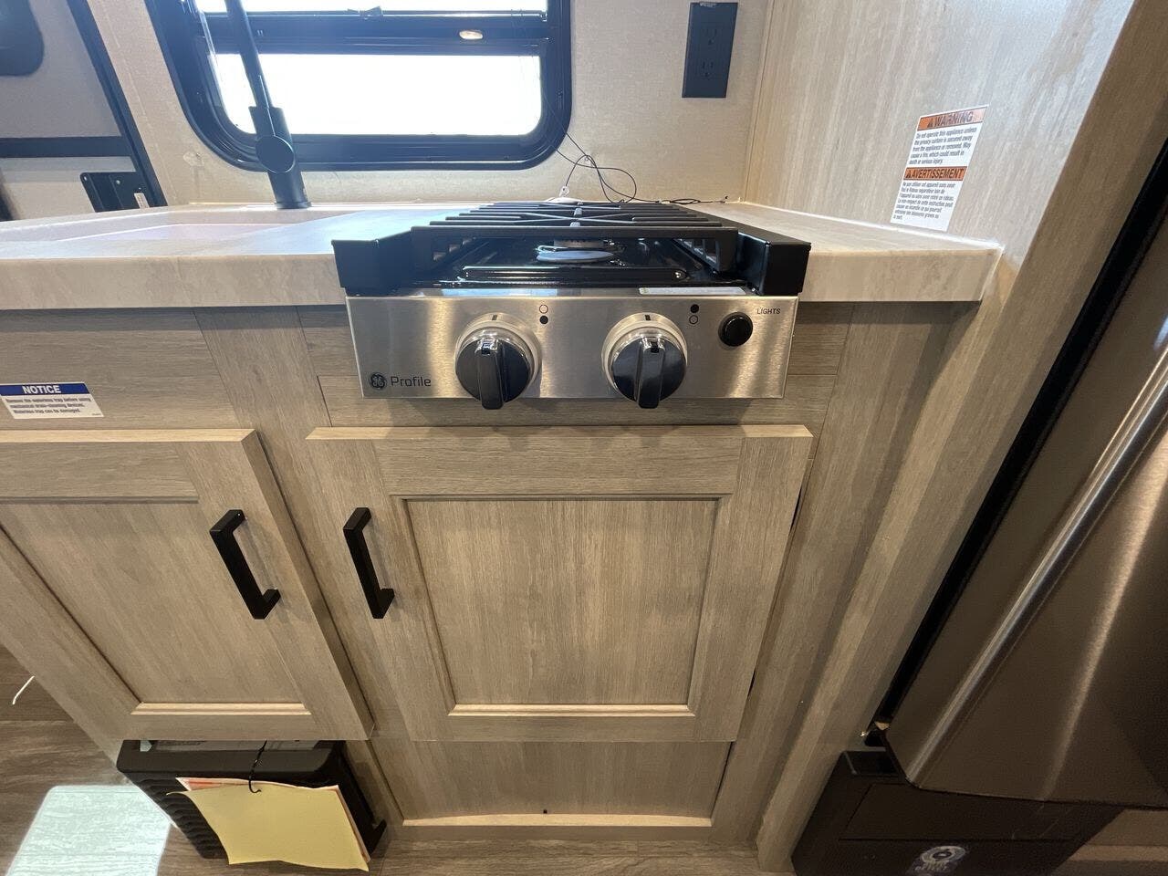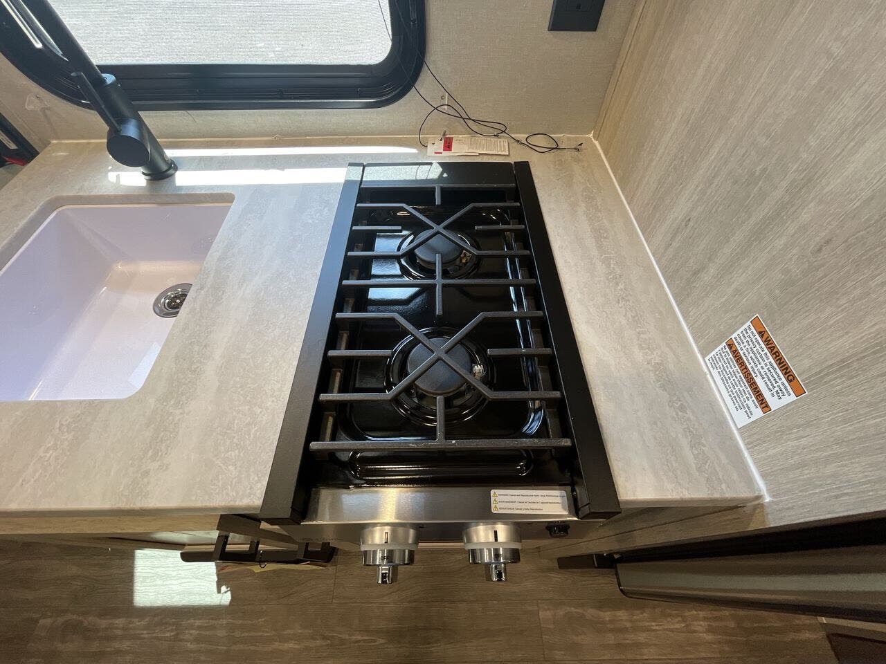 This cozy travel trailer can sleep five, so pack up and head out! You will have a queen bed up front to sleep on each night instead of an air mattress, and the little ones can take the 28" x 70" bunk beds! There is also a 60" sofa here that can sleep an additional guest and is perfect for relaxing during the day. The two burner cooktop and microwave oven means you won't have to cook over a campfire, and the private toilet and shower lets you clean up after a day outdoors. This model includes plenty of storage space, including bedroom storage, an exterior pass-through, plus additional outside storage beneath the bunks for hiking gear!