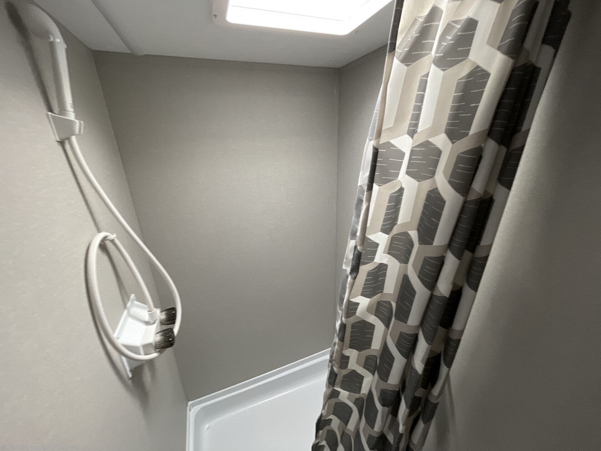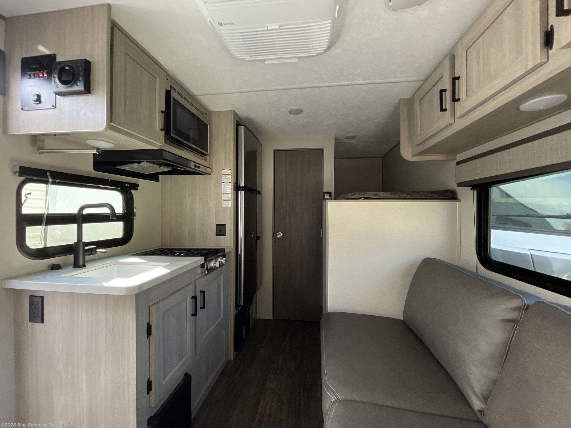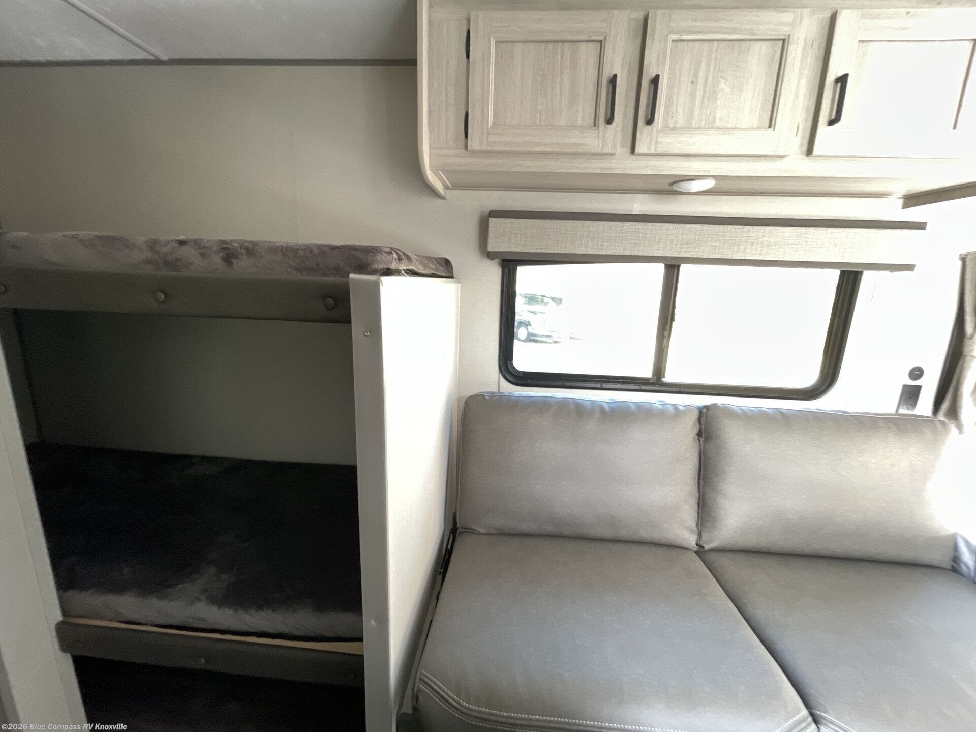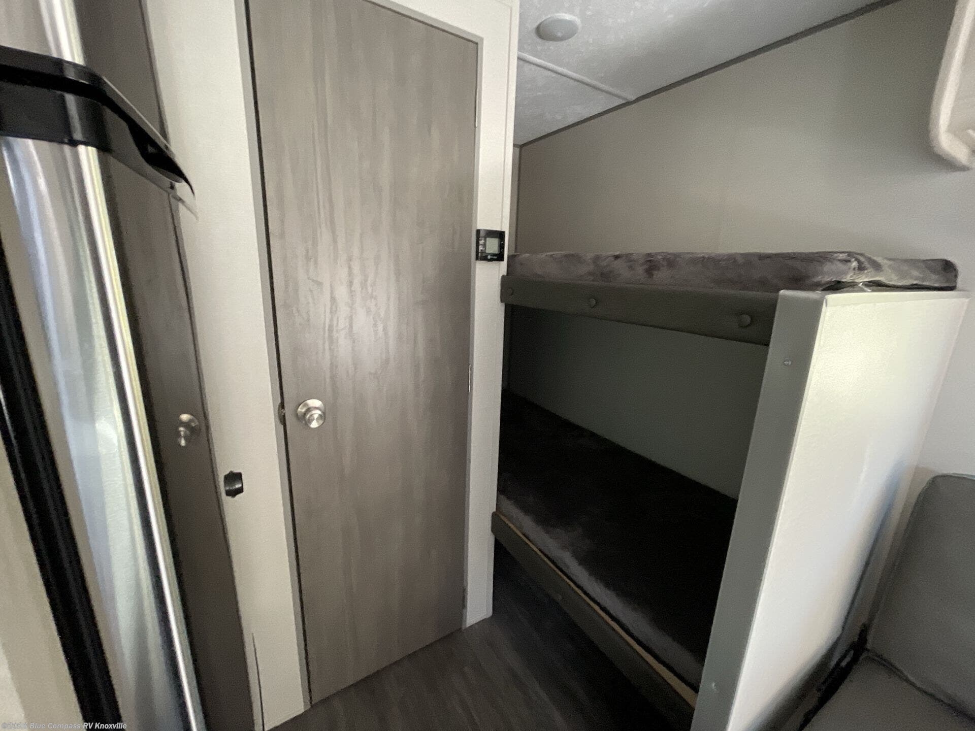 This cozy travel trailer can sleep five, so pack up and head out! You will have a queen bed up front to sleep on each night instead of an air mattress, and the little ones can take the 28" x 70" bunk beds! There is also a 60" sofa here that can sleep an additional guest and is perfect for relaxing during the day. The two burner cooktop and microwave oven means you won't have to cook over a campfire, and the private toilet and shower lets you clean up after a day outdoors. This model includes plenty of storage space, including bedroom storage, an exterior pass-through, plus additional outside storage beneath the bunks for hiking gear!