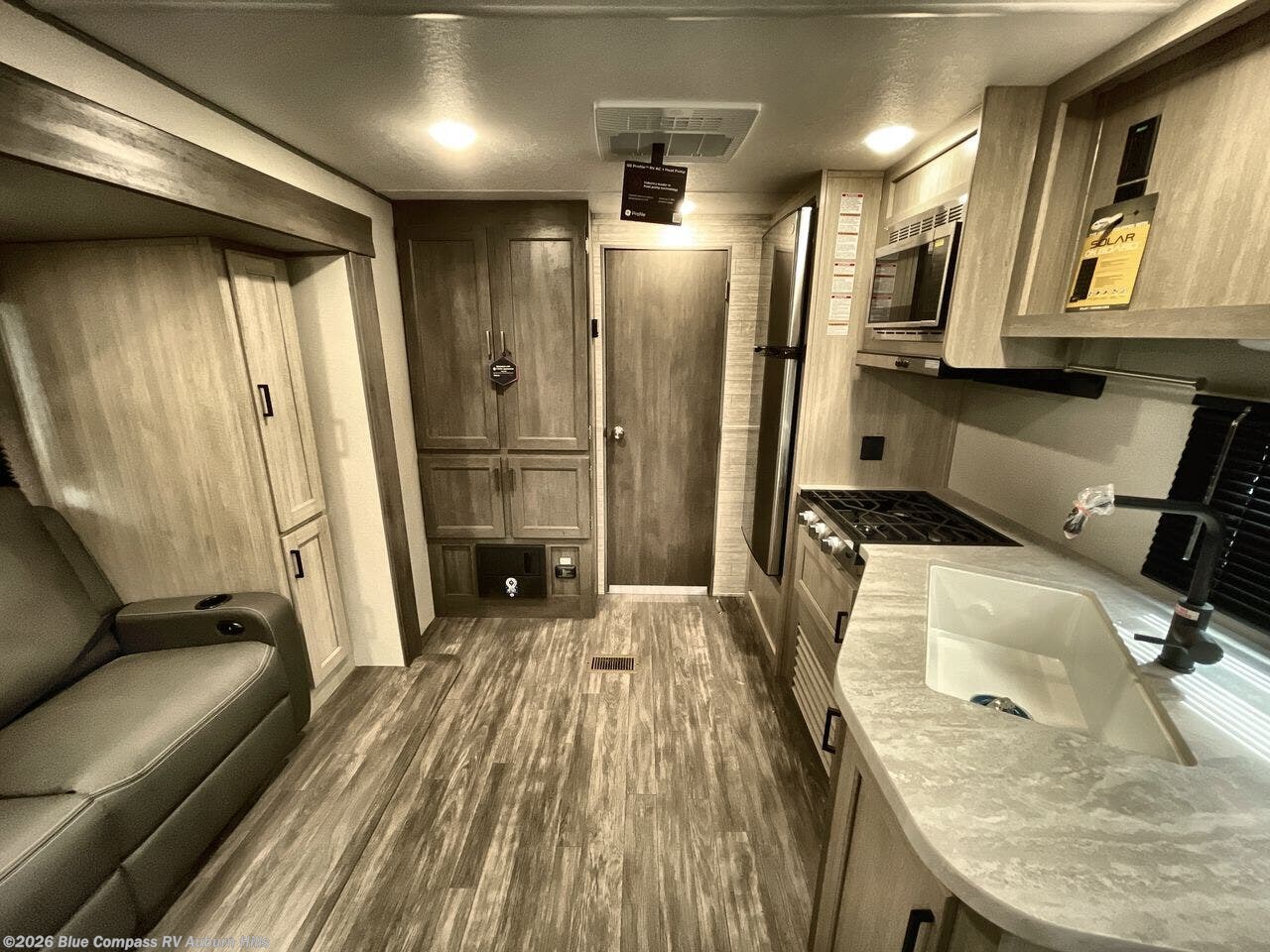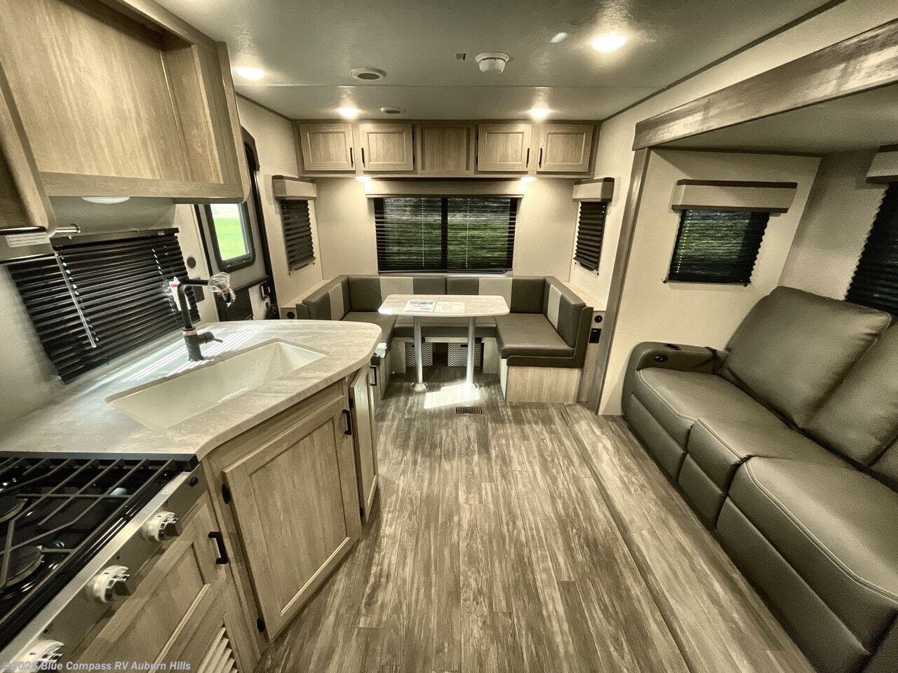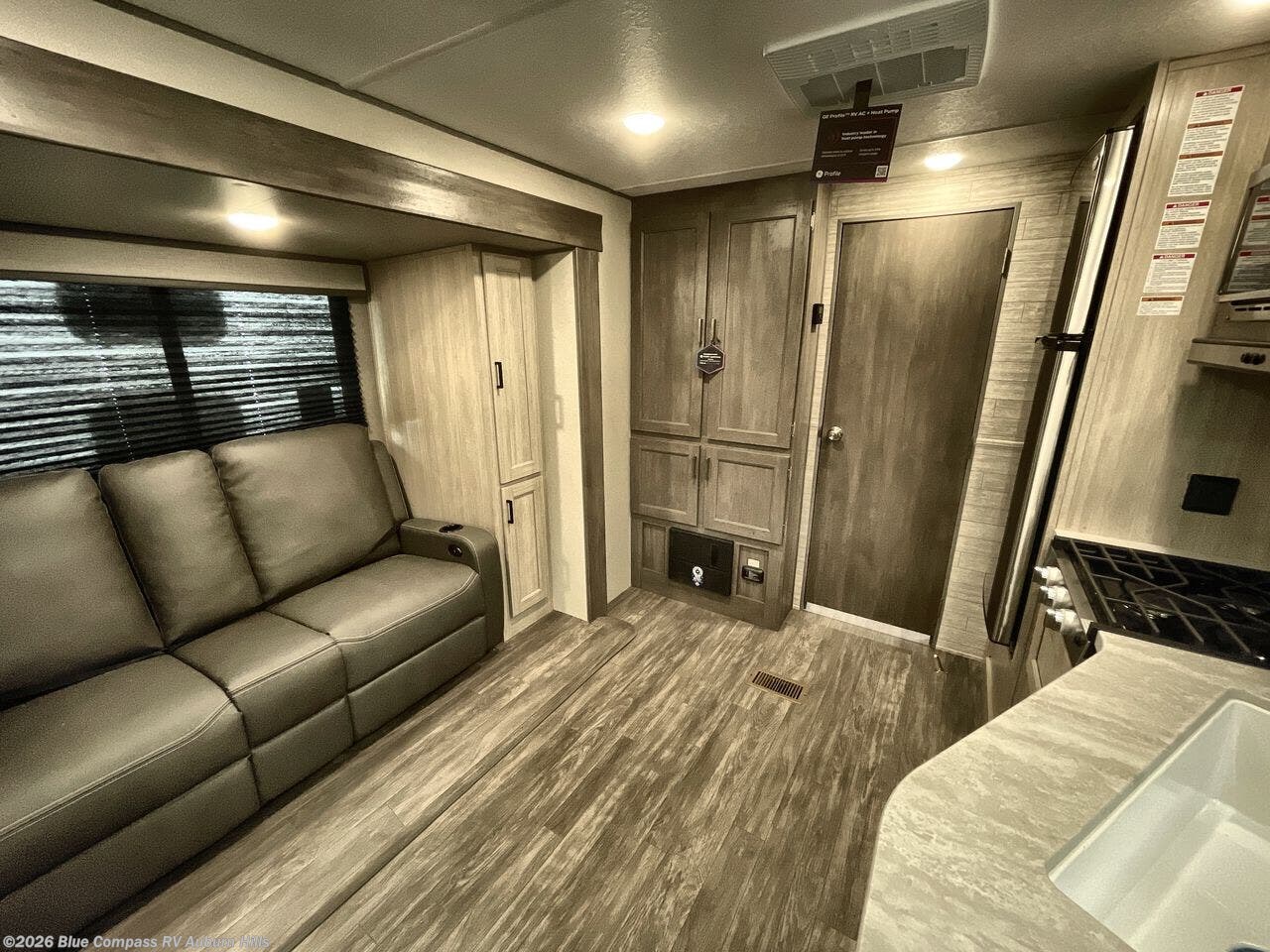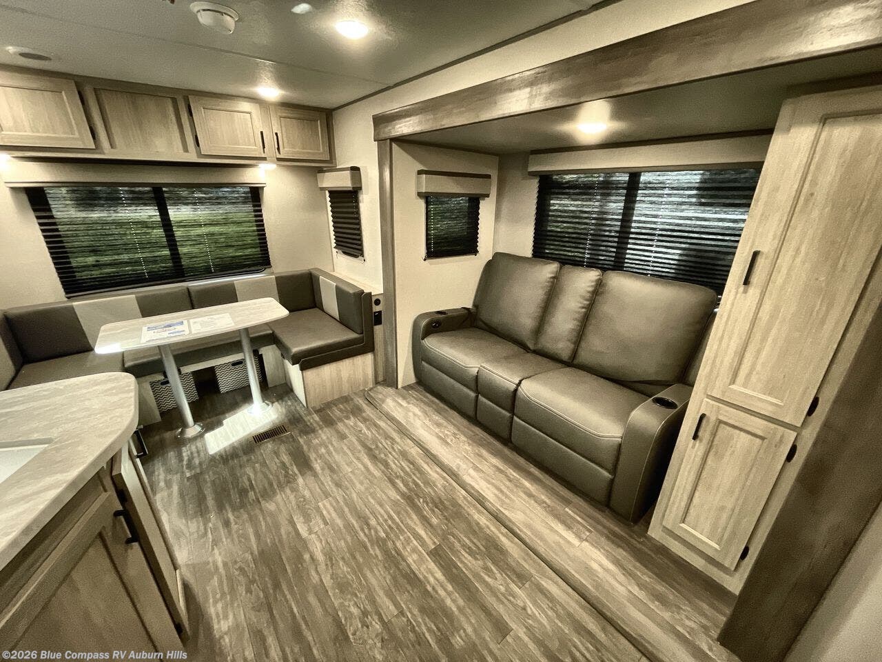 Pack your bags and head to your favorite camping spot with this travel trailer in tow! You can relax on the theater seating slide, dine around the rear U-shaped dinette, or visit outdoors under the 18' power awning. There is also a pass-thru storage outside to bring along fishing poles, camp chairs, and yard games. A full kitchen includes a three burner gas range and microwave oven, along with a 10.7 cu. ft. 12V refrigerator and pantry for food storage. The walk-thru bath will create a front master bedroom you are sure to love, especially with its queen bed, dual bedside wardrobes and an overhead shelf for storage!