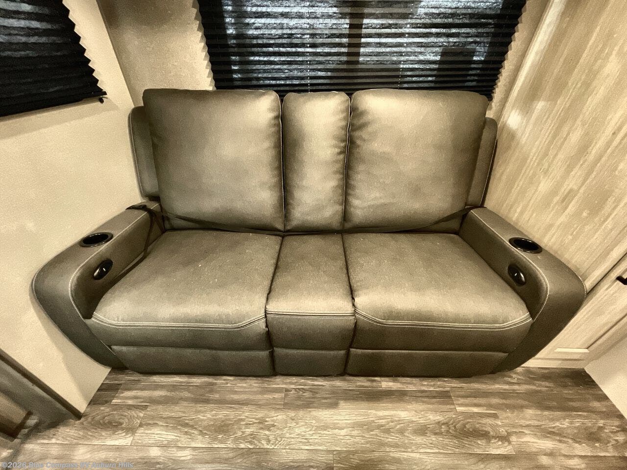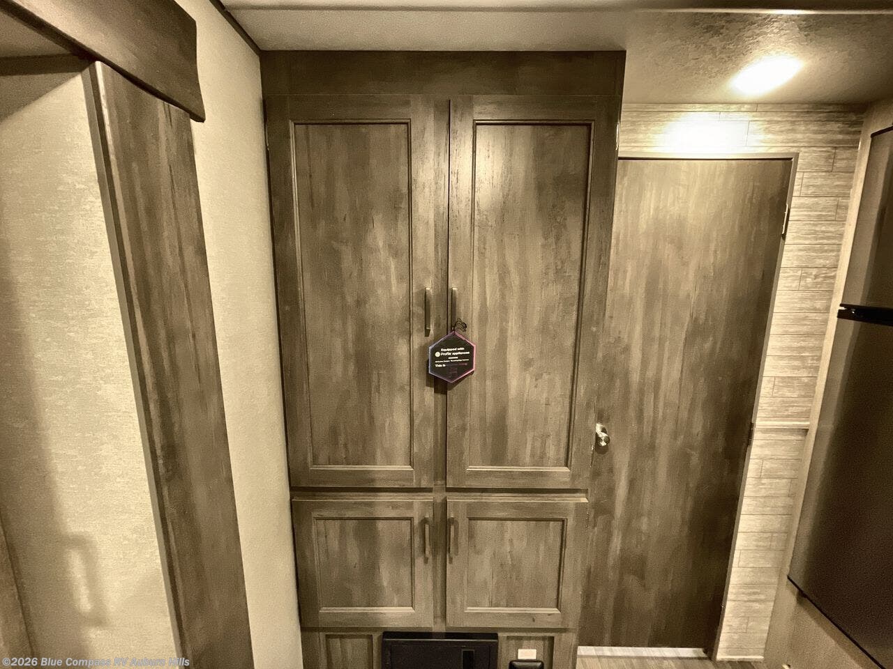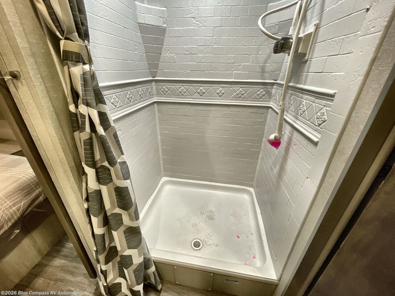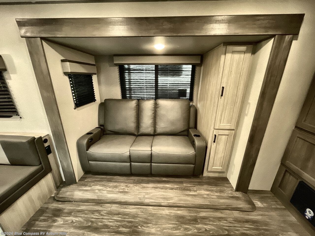 Pack your bags and head to your favorite camping spot with this travel trailer in tow! You can relax on the theater seating slide, dine around the rear U-shaped dinette, or visit outdoors under the 18' power awning. There is also a pass-thru storage outside to bring along fishing poles, camp chairs, and yard games. A full kitchen includes a three burner gas range and microwave oven, along with a 10.7 cu. ft. 12V refrigerator and pantry for food storage. The walk-thru bath will create a front master bedroom you are sure to love, especially with its queen bed, dual bedside wardrobes and an overhead shelf for storage!