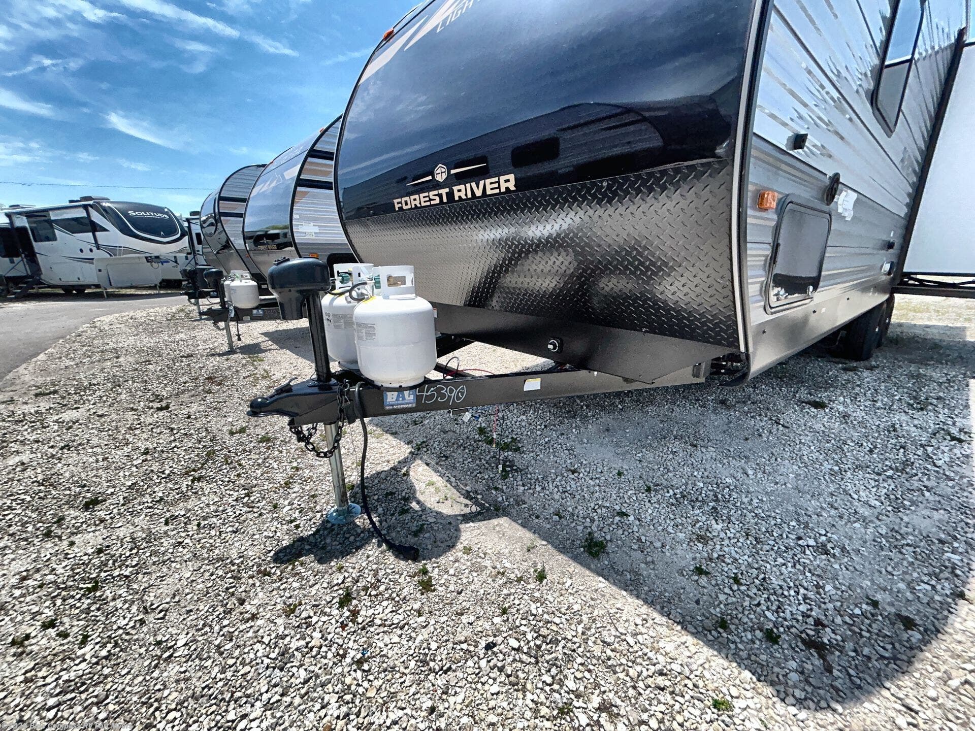 Comfortability, usability, and quality is what you will find in each one of these Forest River Aurora Light travel trailers! They are designed with a superior build and packed full with industry leading, functional, and distinctive standard features. SolidStep entrance steps and a Safe-T rail door assist on main entry door to help you safely enter and exit the unit. The diamond plate rock guard will protect your unit from road debris and the nitrogen filled radial tires, which keep their pressure longer, offer better fuel economy. You will also find upgraded JBL Elite exterior speaker outside, an electric awning with multicolor lights and remote, plus flush mount baggage doors for easy packing. The interiors are beautifully designed with matte black kitchen and bath faucets, black nightshades in the living room, and GE kitchen appliances!