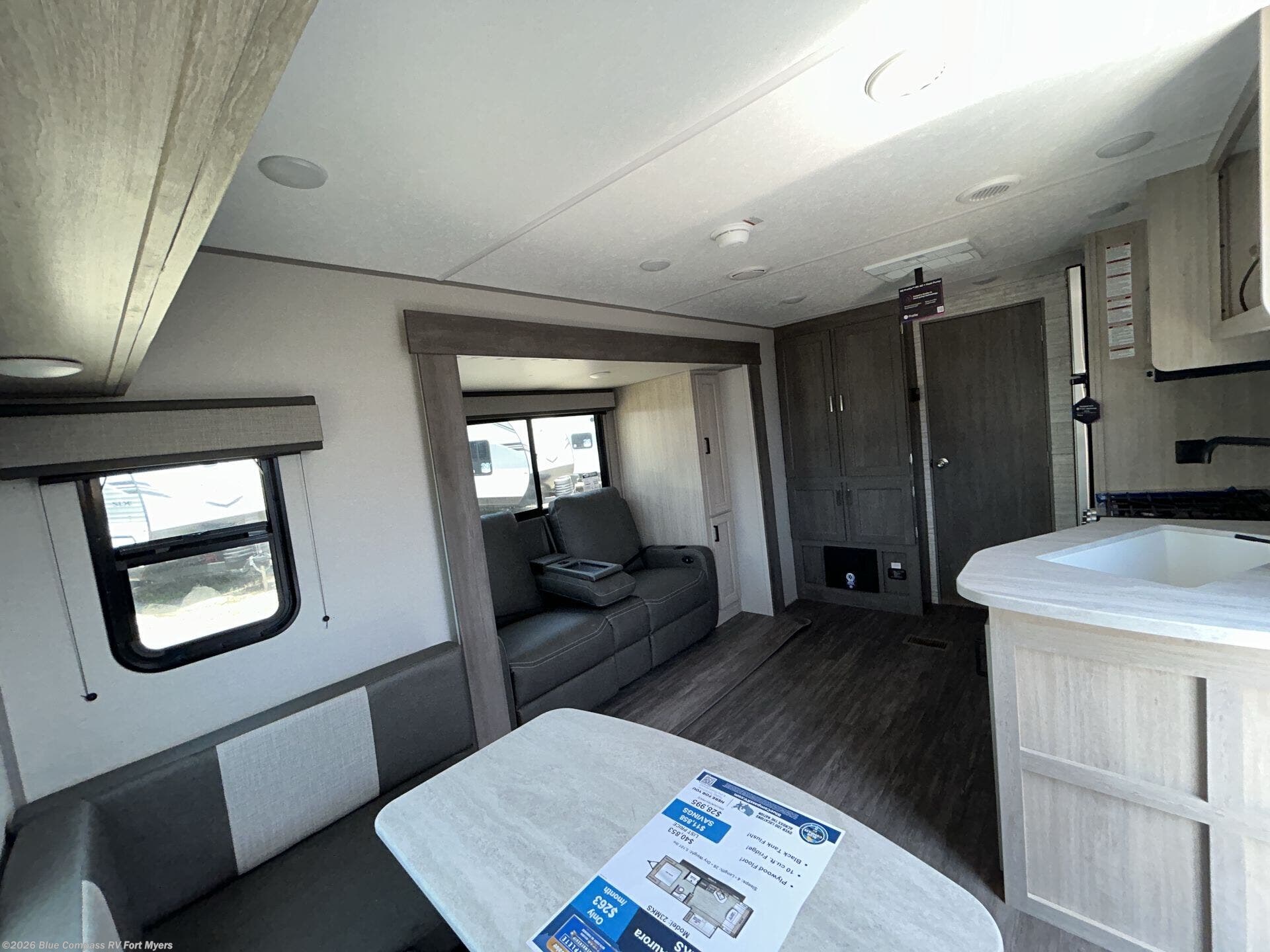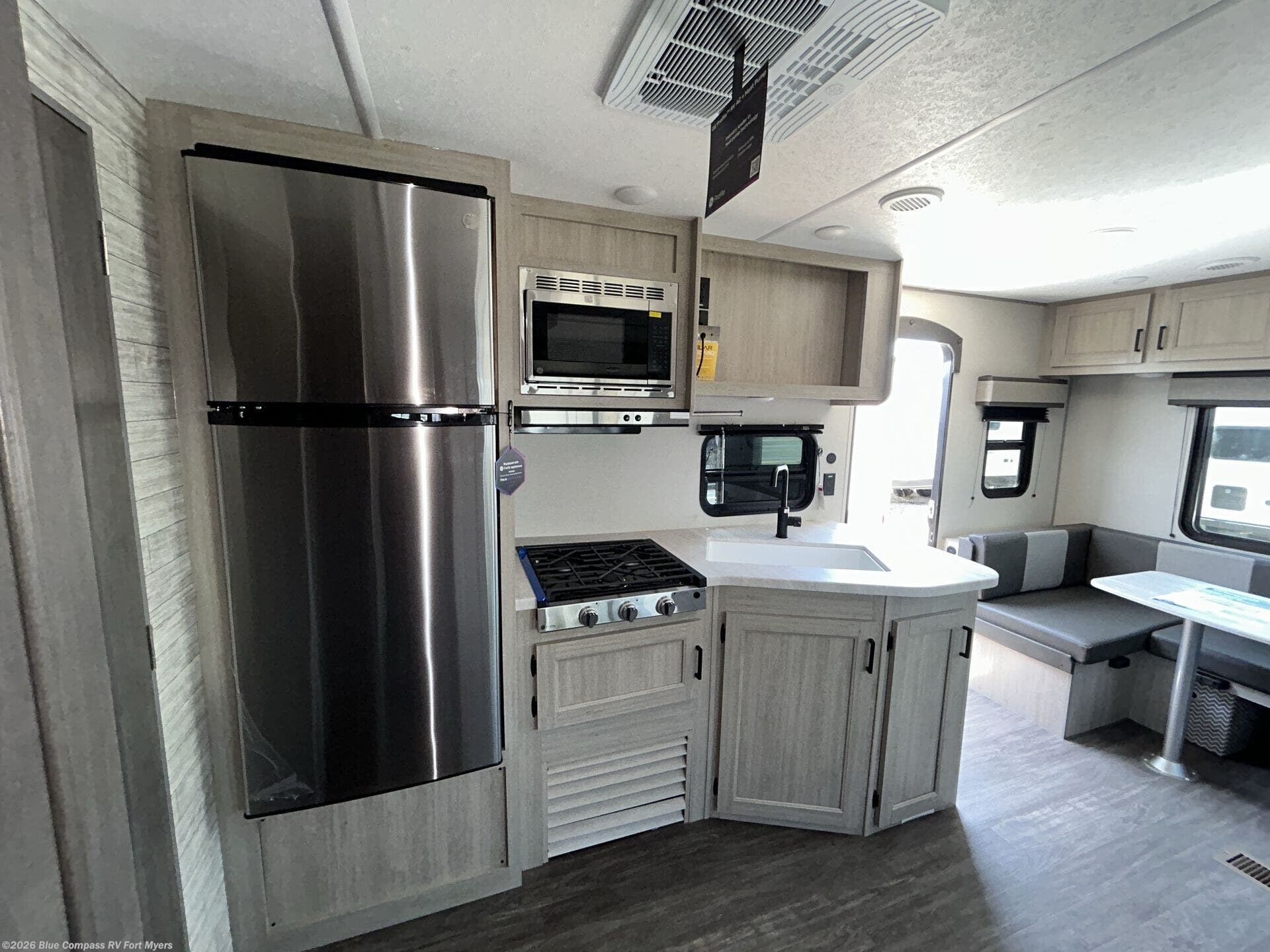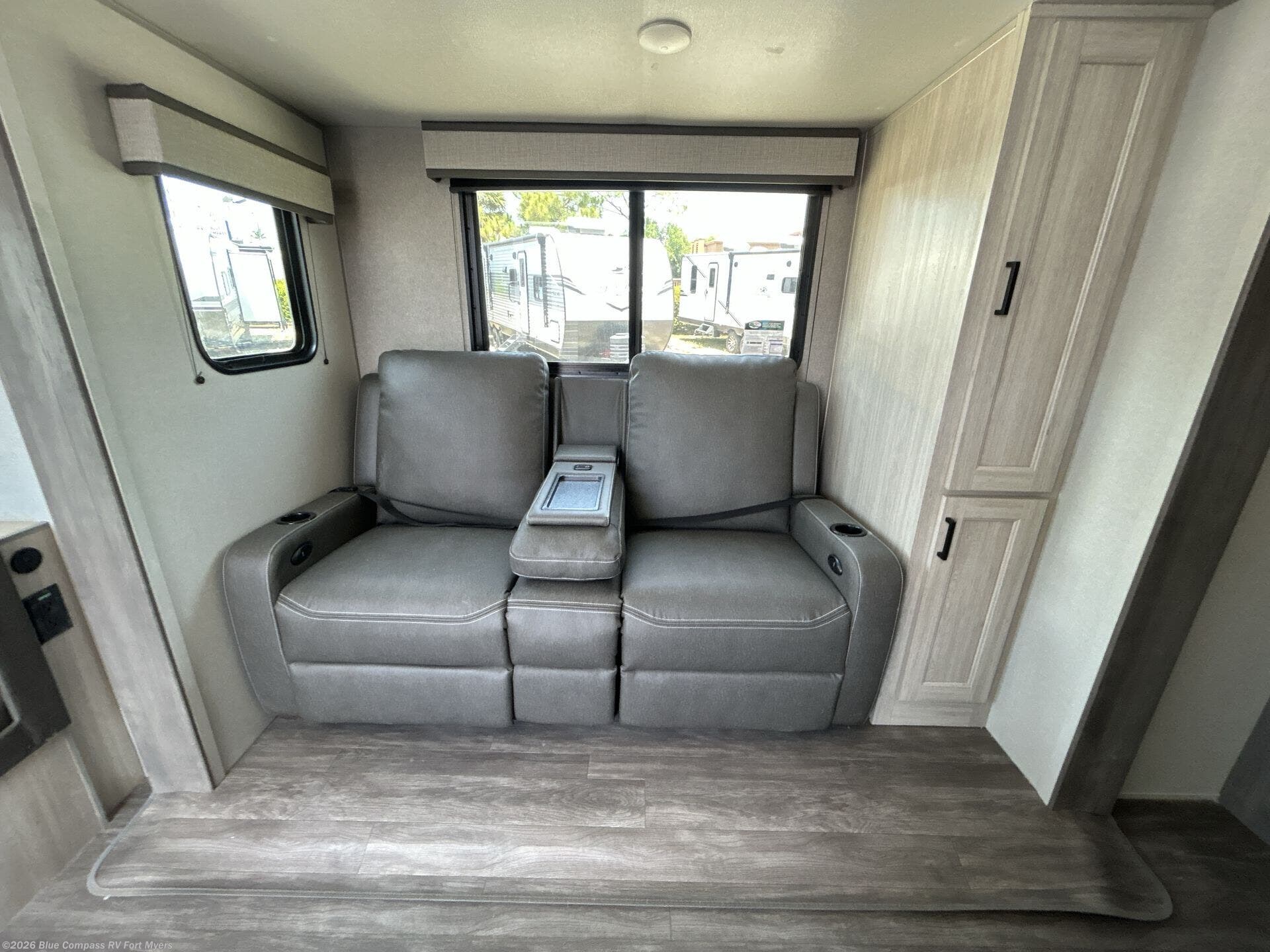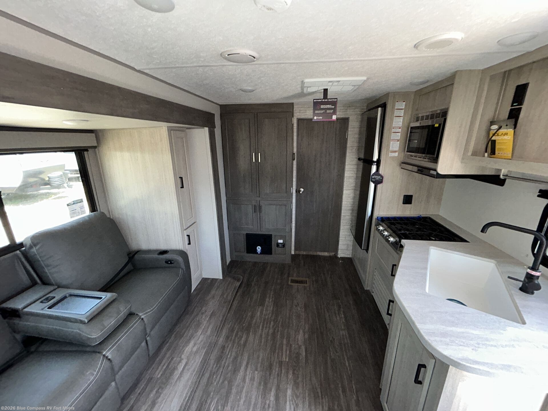 Pack your bags and head to your favorite camping spot with this travel trailer in tow! You can relax on the theater seating slide, dine around the rear U-shaped dinette, or visit outdoors under the 18' power awning. There is also a pass-thru storage outside to bring along fishing poles, camp chairs, and yard games. A full kitchen includes a three burner gas range and microwave oven, along with a 10.7 cu. ft. 12V refrigerator and pantry for food storage. The walk-thru bath will create a front master bedroom you are sure to love, especially with its queen bed, dual bedside wardrobes and an overhead shelf for storage!