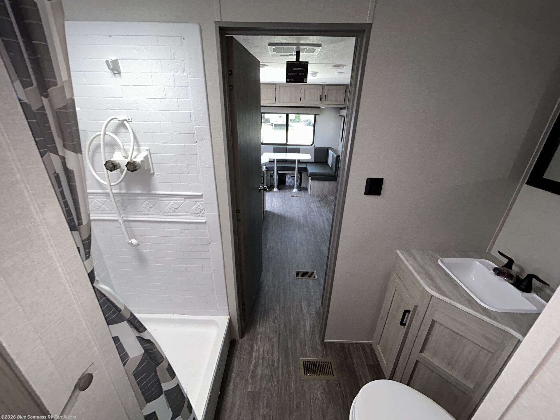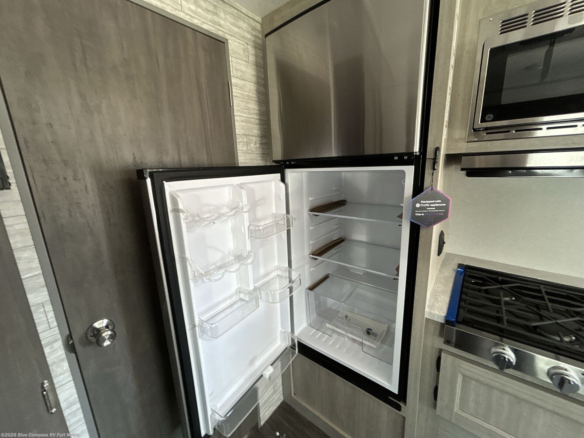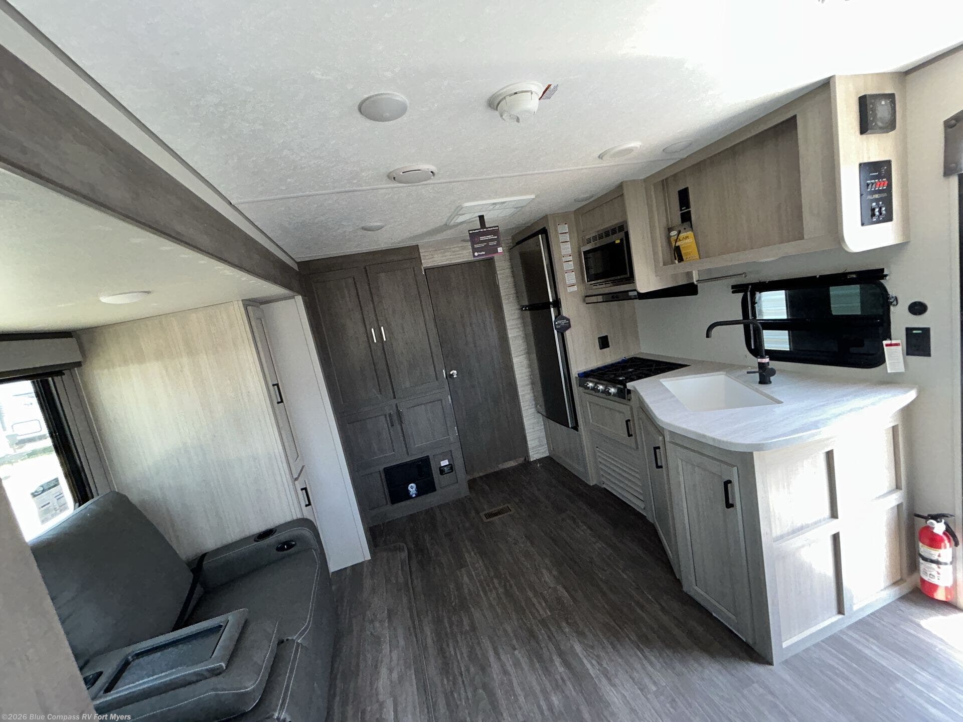 Pack your bags and head to your favorite camping spot with this travel trailer in tow! You can relax on the theater seating slide, dine around the rear U-shaped dinette, or visit outdoors under the 18' power awning. There is also a pass-thru storage outside to bring along fishing poles, camp chairs, and yard games. A full kitchen includes a three burner gas range and microwave oven, along with a 10.7 cu. ft. 12V refrigerator and pantry for food storage. The walk-thru bath will create a front master bedroom you are sure to love, especially with its queen bed, dual bedside wardrobes and an overhead shelf for storage!
