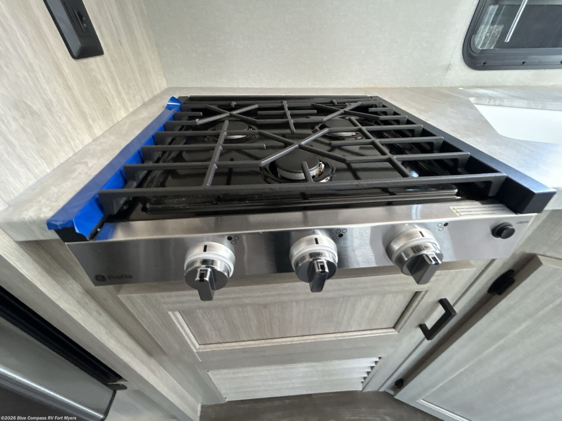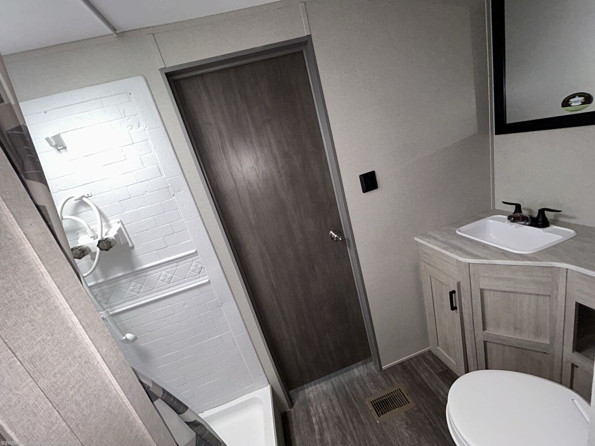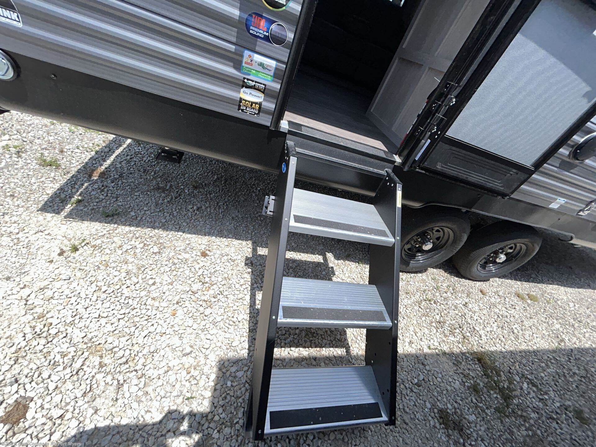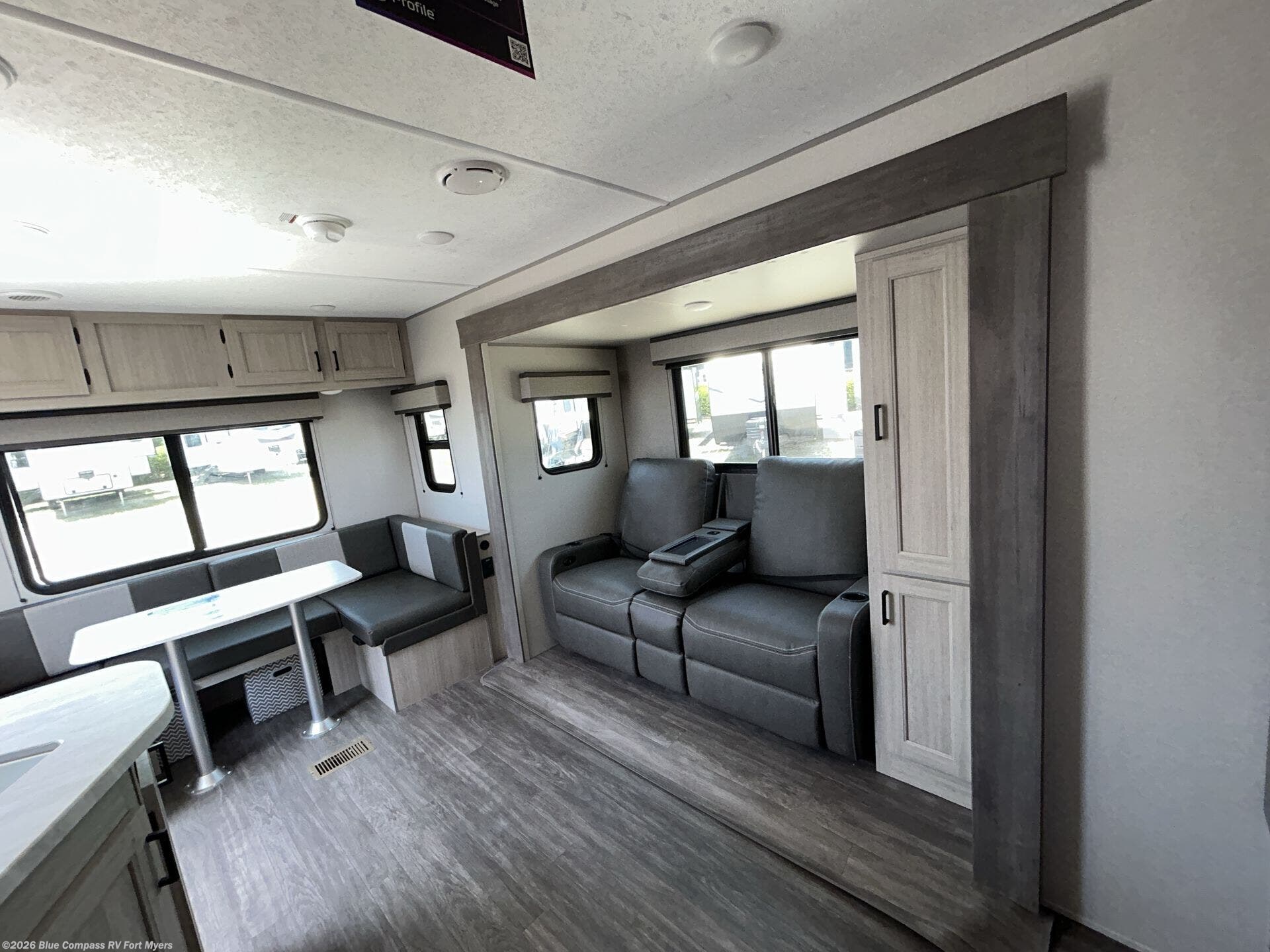 Pack your bags and head to your favorite camping spot with this travel trailer in tow! You can relax on the theater seating slide, dine around the rear U-shaped dinette, or visit outdoors under the 18' power awning. There is also a pass-thru storage outside to bring along fishing poles, camp chairs, and yard games. A full kitchen includes a three burner gas range and microwave oven, along with a 10.7 cu. ft. 12V refrigerator and pantry for food storage. The walk-thru bath will create a front master bedroom you are sure to love, especially with its queen bed, dual bedside wardrobes and an overhead shelf for storage!
