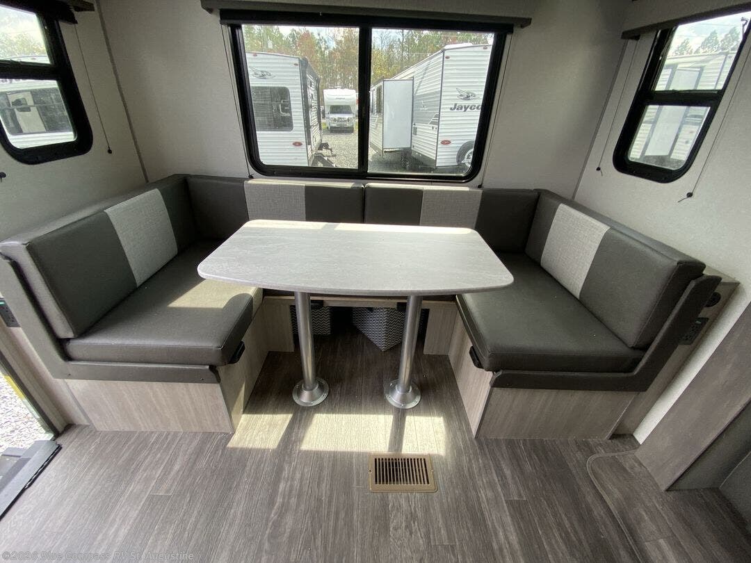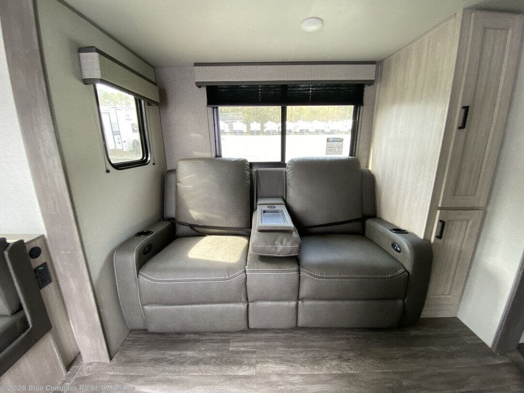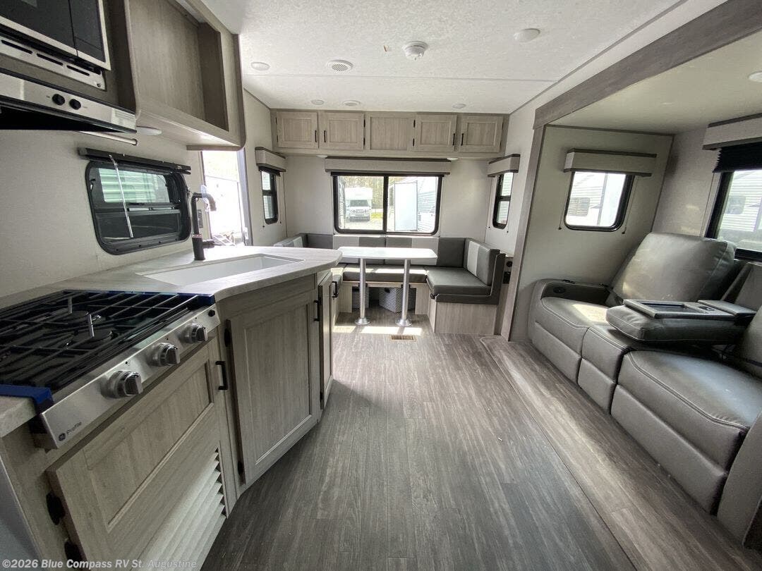 Pack your bags and head to your favorite camping spot with this travel trailer in tow! You can relax on the theater seating slide, dine around the rear U-shaped dinette, or visit outdoors under the 18' power awning. There is also a pass-thru storage outside to bring along fishing poles, camp chairs, and yard games. A full kitchen includes a three burner gas range and microwave oven, along with a 10.7 cu. ft. 12V refrigerator and pantry for food storage. The walk-thru bath will create a front master bedroom you are sure to love, especially with its queen bed, dual bedside wardrobes and an overhead shelf for storage!