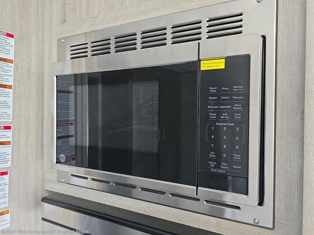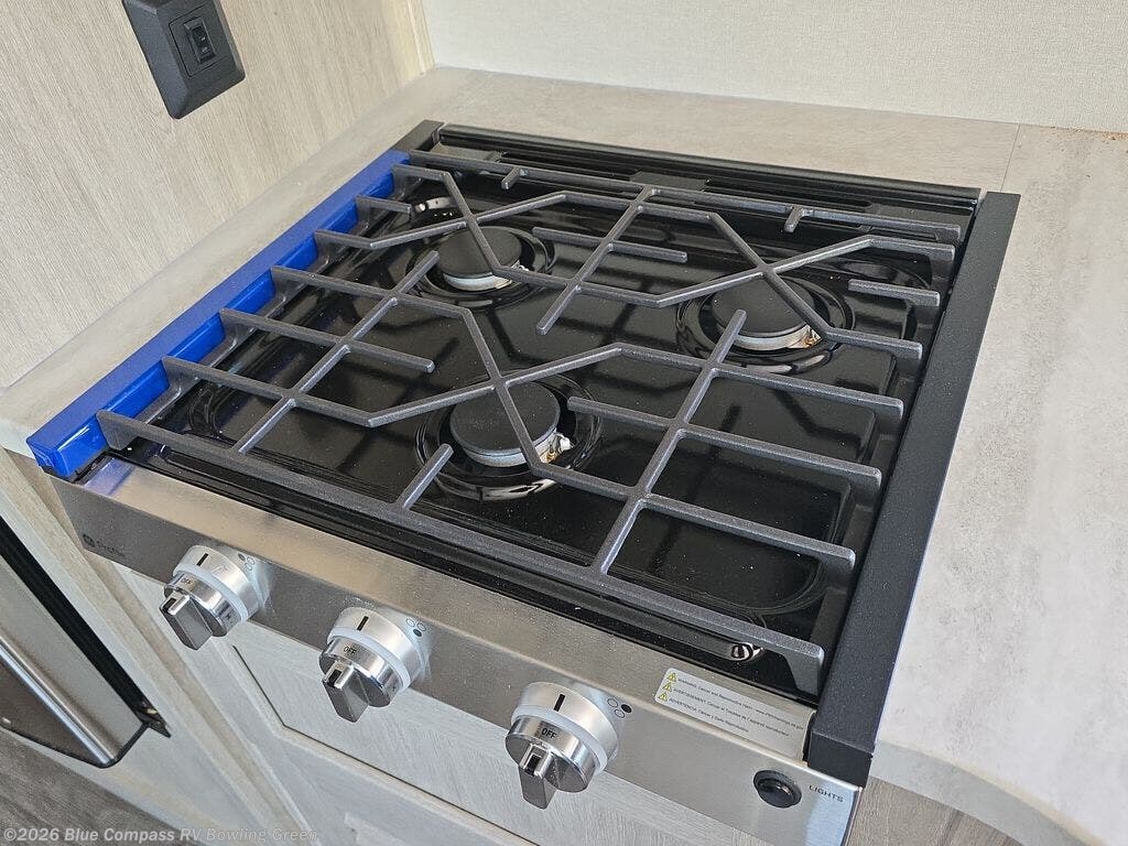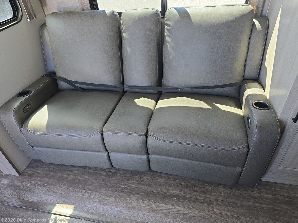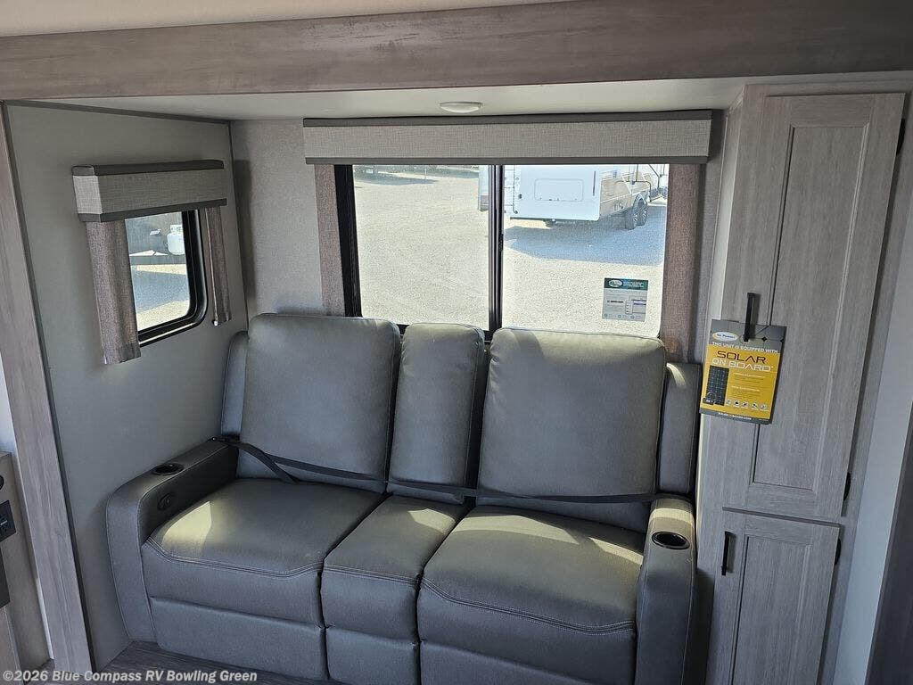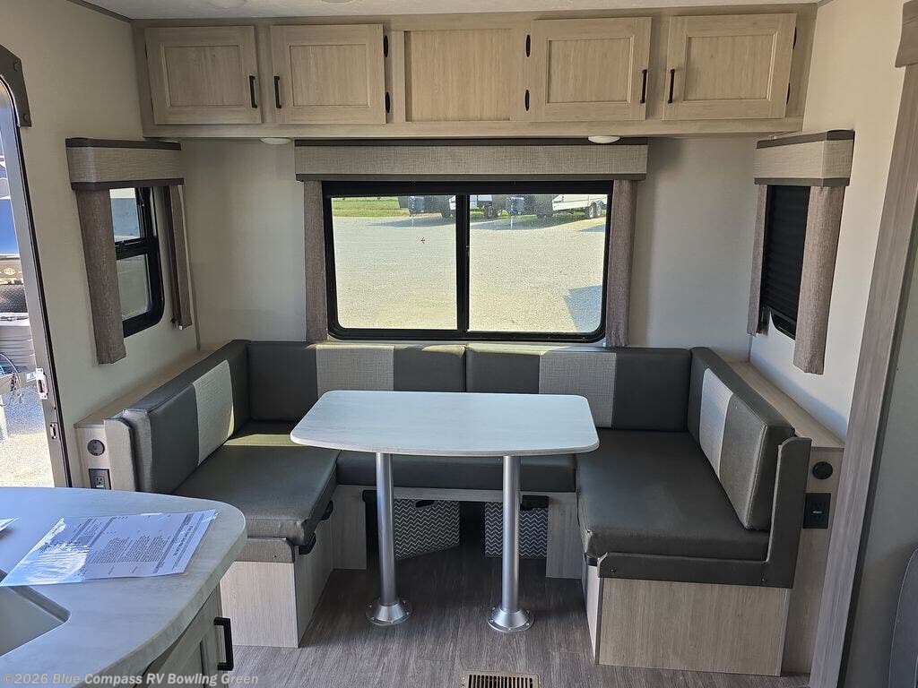Pack your bags and head to your favorite camping spot with this travel trailer in tow! You can relax on the theater seating slide, dine around the rear U-shaped dinette, or visit outdoors under the 18' power awning. There is also a pass-thru storage outside to bring along fishing poles, camp chairs, and yard games. A full kitchen includes a three burner gas range and microwave oven, along with a 10.7 cu. ft. 12V refrigerator and pantry for food storage. The walk-thru bath will create a front master bedroom you are sure to love, especially with its queen bed, dual bedside wardrobes and an overhead shelf for storage!