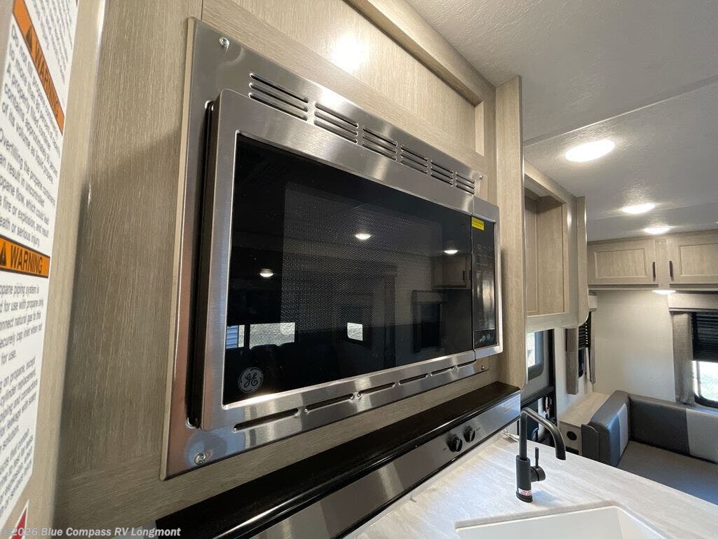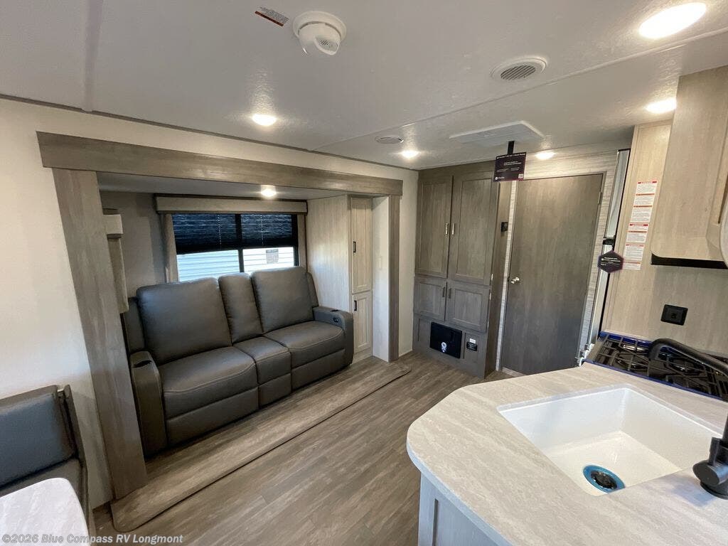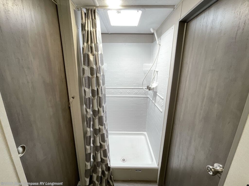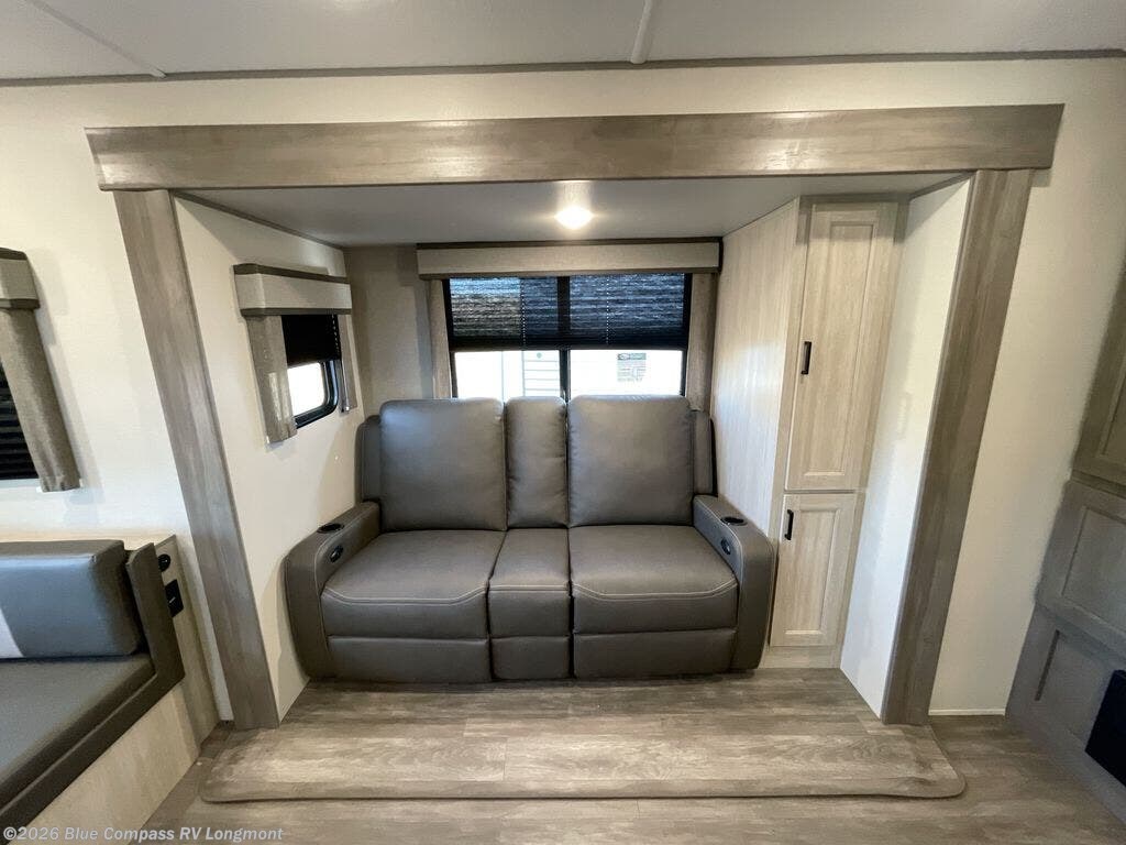 Pack your bags and head to your favorite camping spot with this travel trailer in tow! You can relax on the theater seating slide, dine around the rear U-shaped dinette, or visit outdoors under the 18' power awning. There is also a pass-thru storage outside to bring along fishing poles, camp chairs, and yard games. A full kitchen includes a three burner gas range and microwave oven, along with a 10.7 cu. ft. 12V refrigerator and pantry for food storage. The walk-thru bath will create a front master bedroom you are sure to love, especially with its queen bed, dual bedside wardrobes and an overhead shelf for storage!