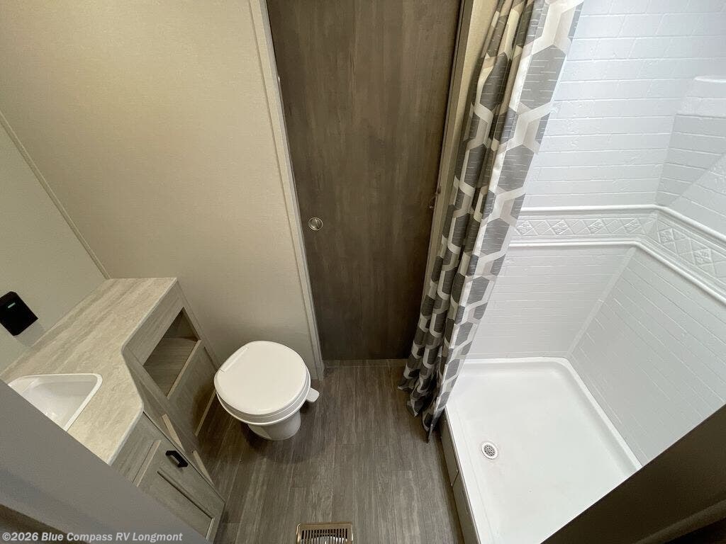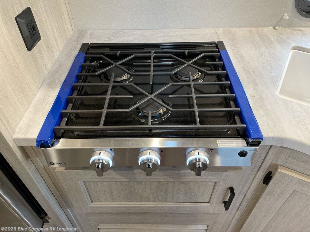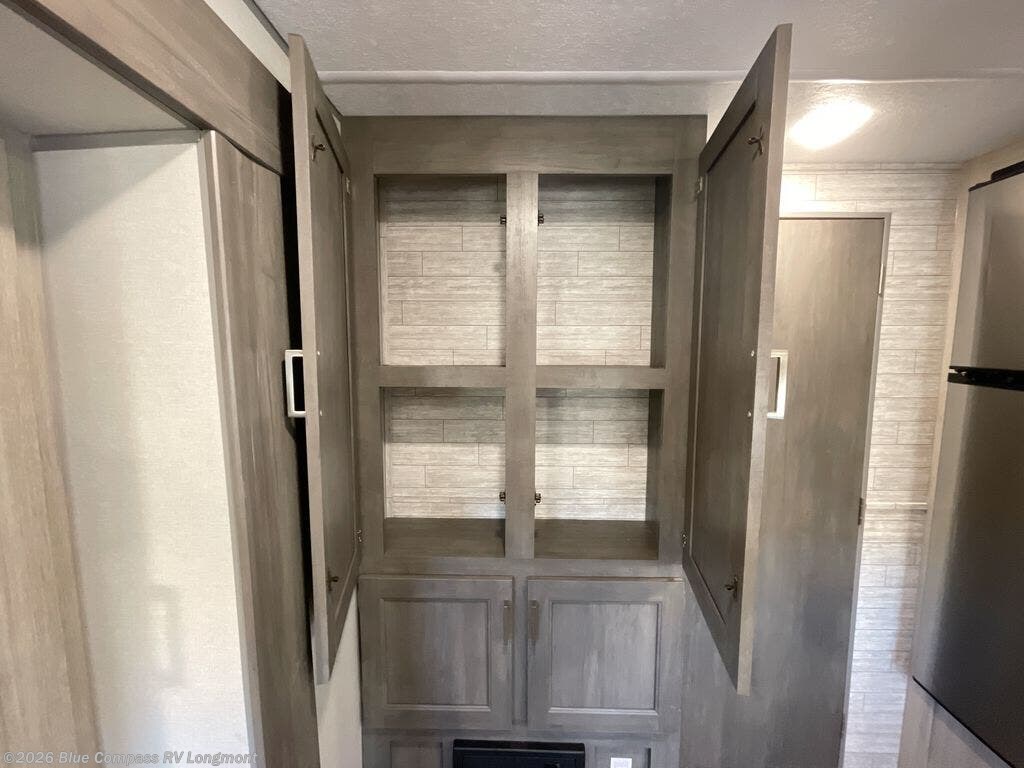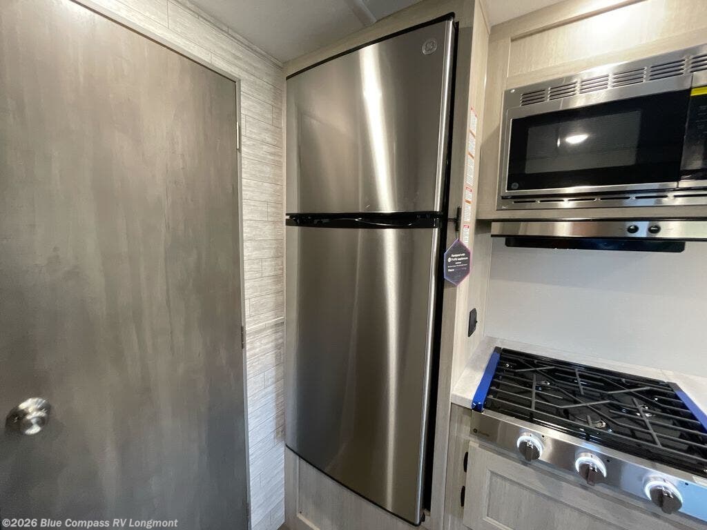 Pack your bags and head to your favorite camping spot with this travel trailer in tow! You can relax on the theater seating slide, dine around the rear U-shaped dinette, or visit outdoors under the 18' power awning. There is also a pass-thru storage outside to bring along fishing poles, camp chairs, and yard games. A full kitchen includes a three burner gas range and microwave oven, along with a 10.7 cu. ft. 12V refrigerator and pantry for food storage. The walk-thru bath will create a front master bedroom you are sure to love, especially with its queen bed, dual bedside wardrobes and an overhead shelf for storage!