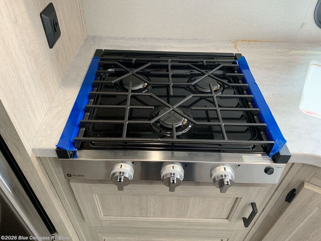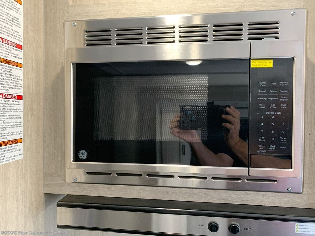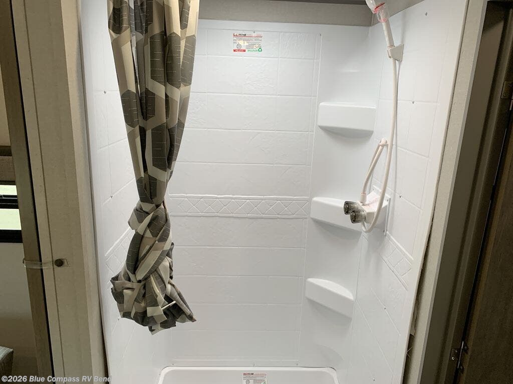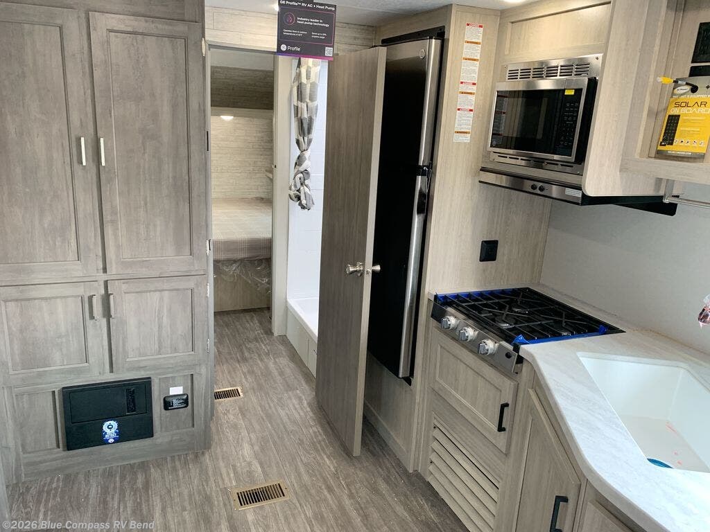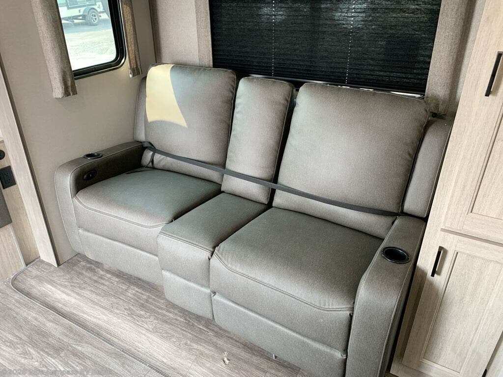 Pack your bags and head to your favorite camping spot with this travel trailer in tow! You can relax on the theater seating slide, dine around the rear U-shaped dinette, or visit outdoors under the 18' power awning. There is also a pass-thru storage outside to bring along fishing poles, camp chairs, and yard games. A full kitchen includes a three burner gas range and microwave oven, along with a 10.7 cu. ft. 12V refrigerator and pantry for food storage. The walk-thru bath will create a front master bedroom you are sure to love, especially with its queen bed, dual bedside wardrobes and an overhead shelf for storage!