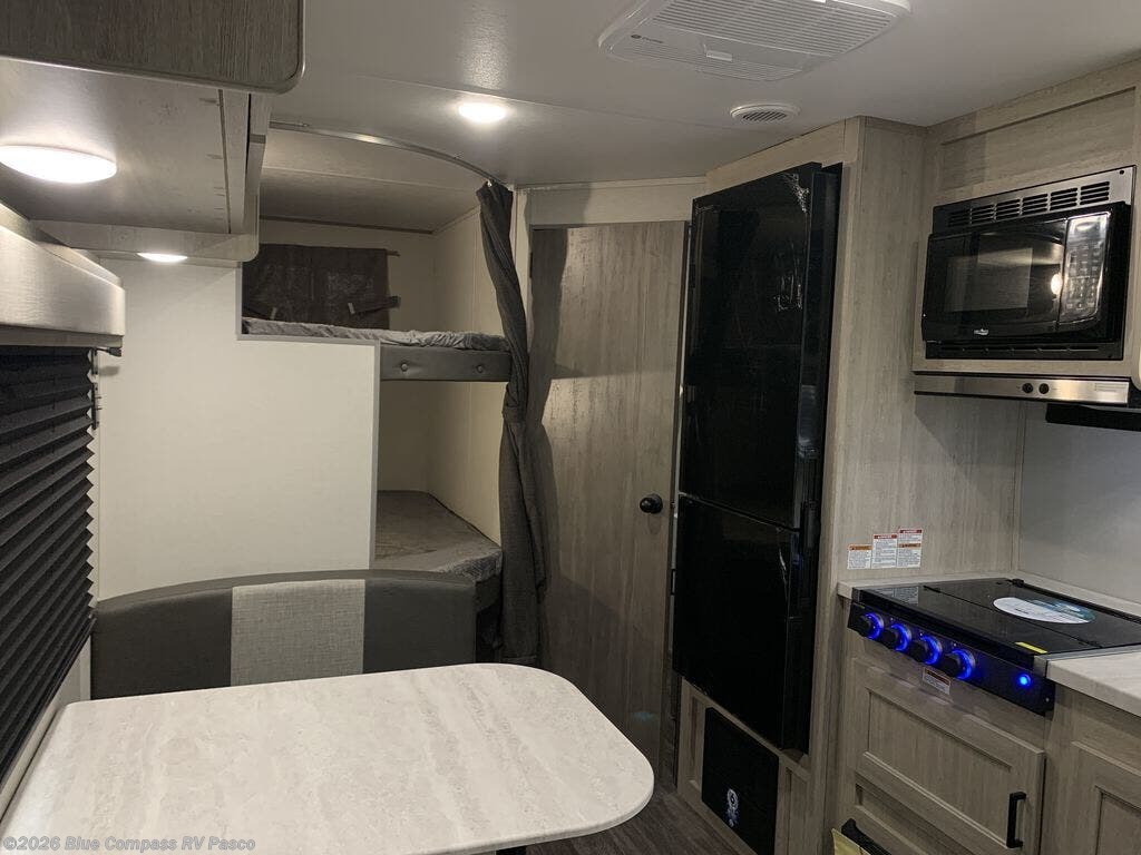Pack your bags and head out on a fun weekend camping trip with this travel trailer! Whether you have a small family or a few guests wanting to come along, there will be enough sleeping spaces between the double-size bunk beds, the 60" x 74" queen bed in the front semi-private bedroom, and even the booth dinette. The chef can prepare meals indoors using the three burner cooktop or microwave oven, and there is a 12V 10.7 cu. ft. refrigerator for perishables. There is plenty of storage throughout with the overhead cabinets and wardrobes, as well as outside with the front pass-through storage area!