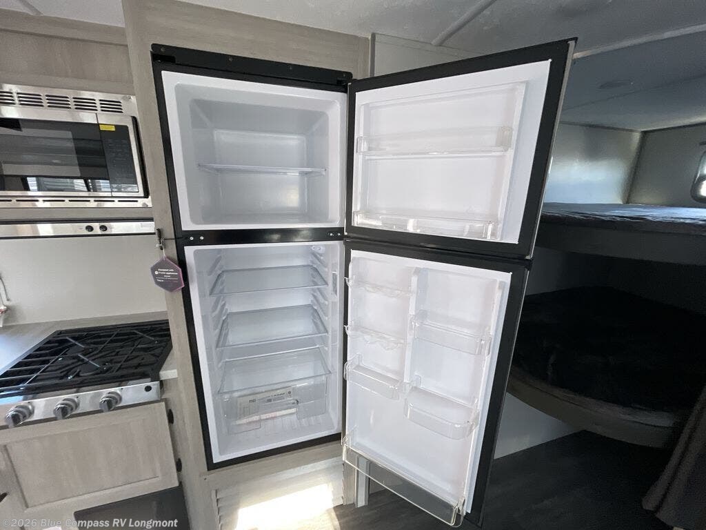 Pack your bags and head out on a fun weekend camping trip with this travel trailer! Whether you have a small family or a few guests wanting to come along, there will be enough sleeping spaces between the double sized bunk beds, the 60" x 74" queen bed in the front semi-private bedroom, the sofa when you don't have the arm rest/cupholders down, and even the booth dinette. The chef can prepare meals indoors using the three burner cooktop or microwave oven, and there is a 12V 10.7 cu. ft. refrigerator for perishables . There is plenty of storage throughout with the overhead cabinets and wardrobes, as well as outside with the front pass-through storage area!