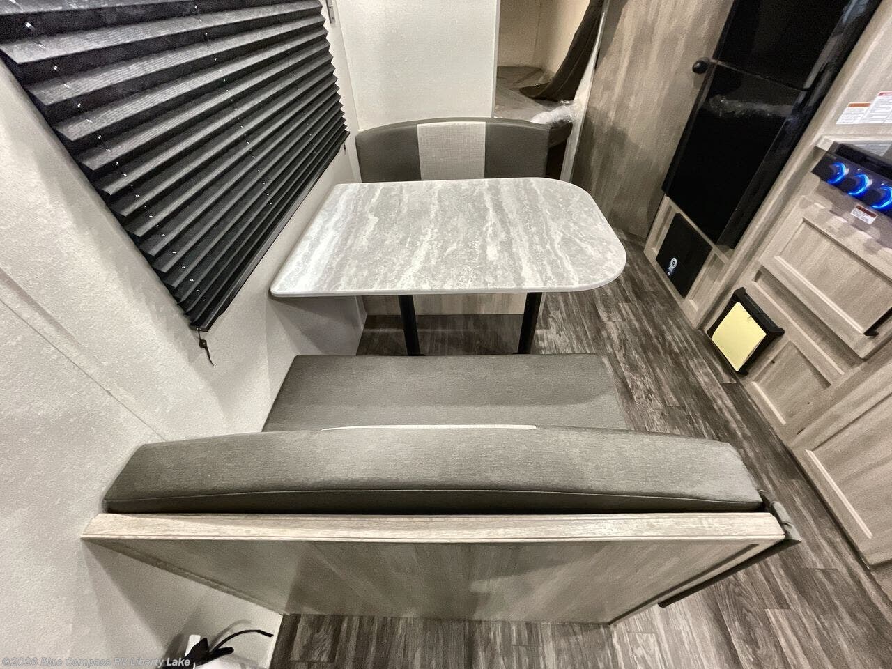 Pack your bags and head out on a fun weekend camping trip with this travel trailer! Whether you have a small family or a few guests wanting to come along, there will be enough sleeping spaces between the double-size bunk beds, the 60" x 74" queen bed in the front semi-private bedroom, and even the booth dinette. The chef can prepare meals indoors using the three burner cooktop or microwave oven, and there is a 12V 10.7 cu. ft. refrigerator for perishables. There is plenty of storage throughout with the overhead cabinets and wardrobes, as well as outside with the front pass-through storage area!
