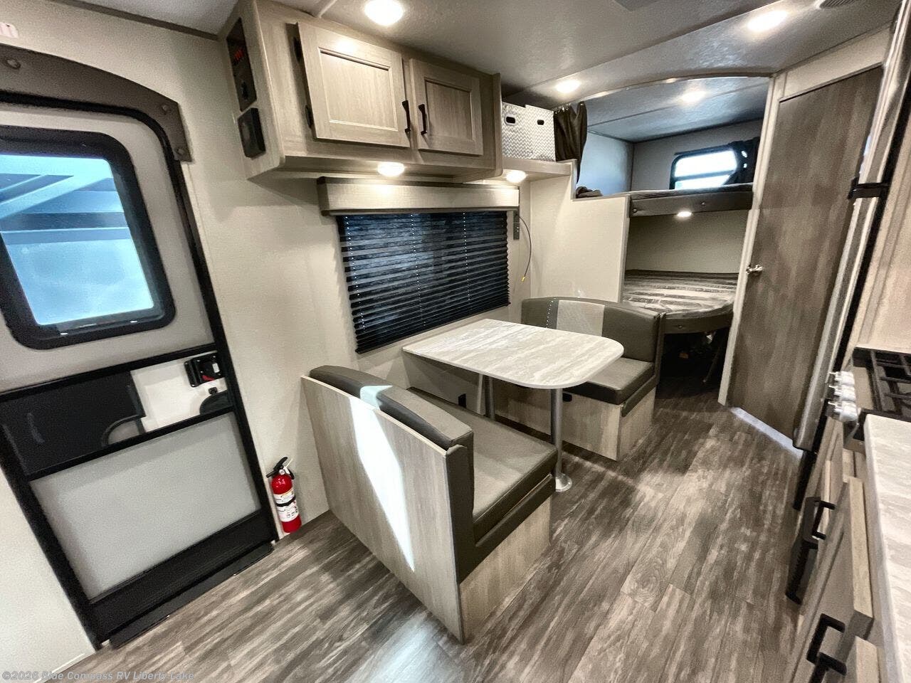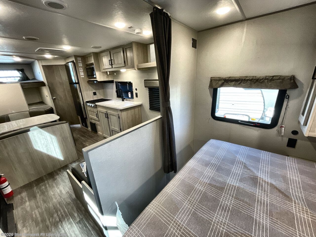 Pack your bags and head out on a fun weekend camping trip with this travel trailer! Whether you have a small family or a few guests wanting to come along, there will be enough sleeping spaces between the double-size bunk beds, the 60" x 74" queen bed in the front semi-private bedroom, and even the booth dinette. The chef can prepare meals indoors using the three burner cooktop or microwave oven, and there is a 12V 10.7 cu. ft. refrigerator for perishables. There is plenty of storage throughout with the overhead cabinets and wardrobes, as well as outside with the front pass-through storage area!