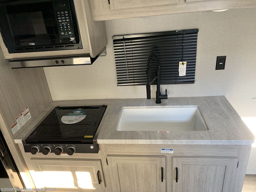 Pack your bags and head out on a fun weekend camping trip with this travel trailer! Whether you have a small family or a few guests wanting to come along, there will be enough sleeping spaces between the double-size bunk beds, the 60" x 74" queen bed in the front semi-private bedroom, and even the booth dinette. The chef can prepare meals indoors using the three burner cooktop or microwave oven, and there is a 12V 10.7 cu. ft. refrigerator for perishables. There is plenty of storage throughout with the overhead cabinets and wardrobes, as well as outside with the front pass-through storage area!