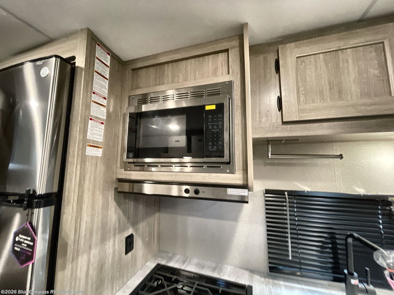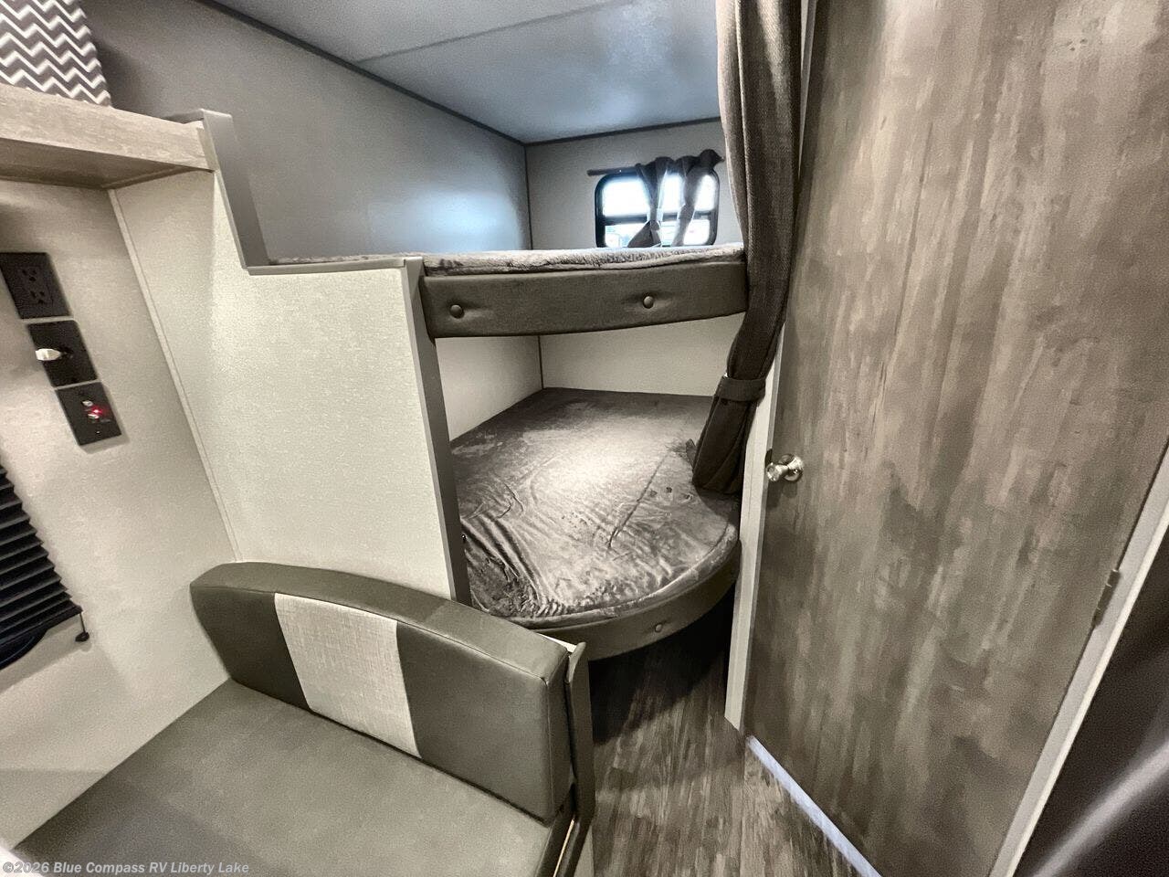 Pack your bags and head out on a fun weekend camping trip with this travel trailer! Whether you have a small family or a few guests wanting to come along, there will be enough sleeping spaces between the double-size bunk beds, the 60" x 74" queen bed in the front semi-private bedroom, and even the booth dinette. The chef can prepare meals indoors using the three burner cooktop or microwave oven, and there is a 12V 10.7 cu. ft. refrigerator for perishables. There is plenty of storage throughout with the overhead cabinets and wardrobes, as well as outside with the front pass-through storage area!