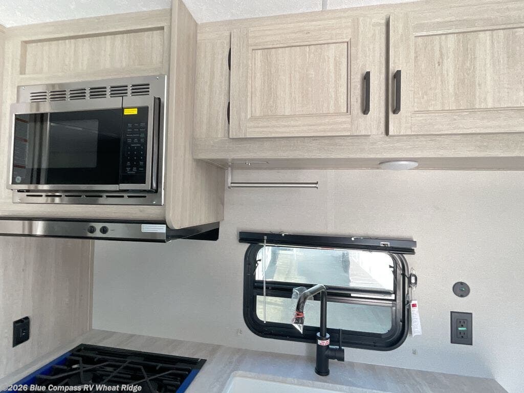 Pack your bags and head out on a fun weekend camping trip with this travel trailer! Whether you have a small family or a few guests wanting to come along, there will be enough sleeping spaces between the double-size bunk beds, the 60" x 74" queen bed in the front semi-private bedroom, and even the booth dinette. The chef can prepare meals indoors using the three burner cooktop or microwave oven, and there is a 12V 10.7 cu. ft. refrigerator for perishables. There is plenty of storage throughout with the overhead cabinets and wardrobes, as well as outside with the front pass-through storage area!