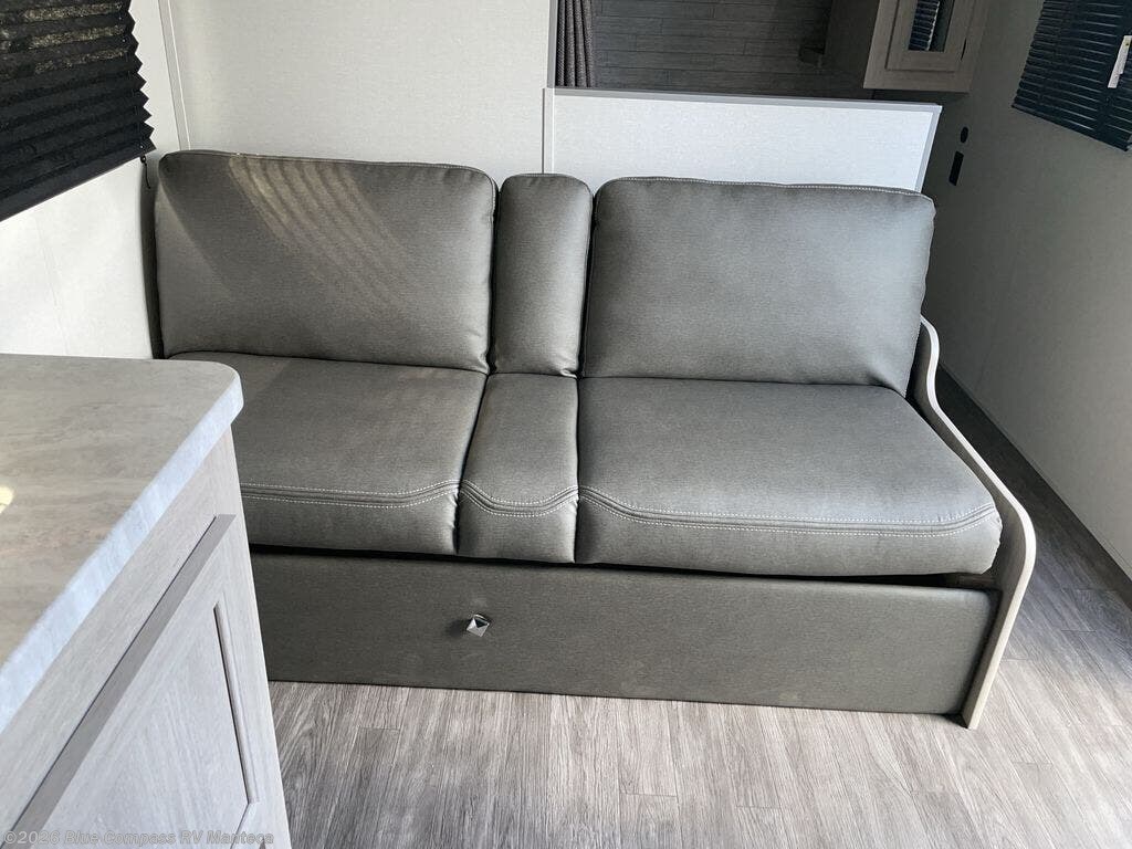 Pack your bags and head out on a fun weekend camping trip with this travel trailer! Whether you have a small family or a few guests wanting to come along, there will be enough sleeping spaces between the double-size bunk beds, the 60" x 74" queen bed in the front semi-private bedroom, and even the booth dinette. The chef can prepare meals indoors using the three burner cooktop or microwave oven, and there is a 12V 10.7 cu. ft. refrigerator for perishables. There is plenty of storage throughout with the overhead cabinets and wardrobes, as well as outside with the front pass-through storage area!