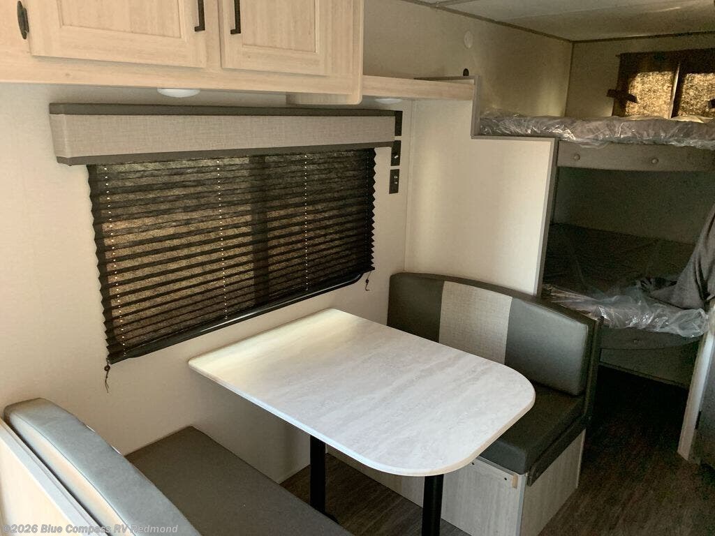 Pack your bags and head out on a fun weekend camping trip with this travel trailer! Whether you have a small family or a few guests wanting to come along, there will be enough sleeping spaces between the double-size bunk beds, the 60" x 74" queen bed in the front semi-private bedroom, and even the booth dinette. The chef can prepare meals indoors using the three burner cooktop or microwave oven, and there is a 12V 10.7 cu. ft. refrigerator for perishables. There is plenty of storage throughout with the overhead cabinets and wardrobes, as well as outside with the front pass-through storage area!