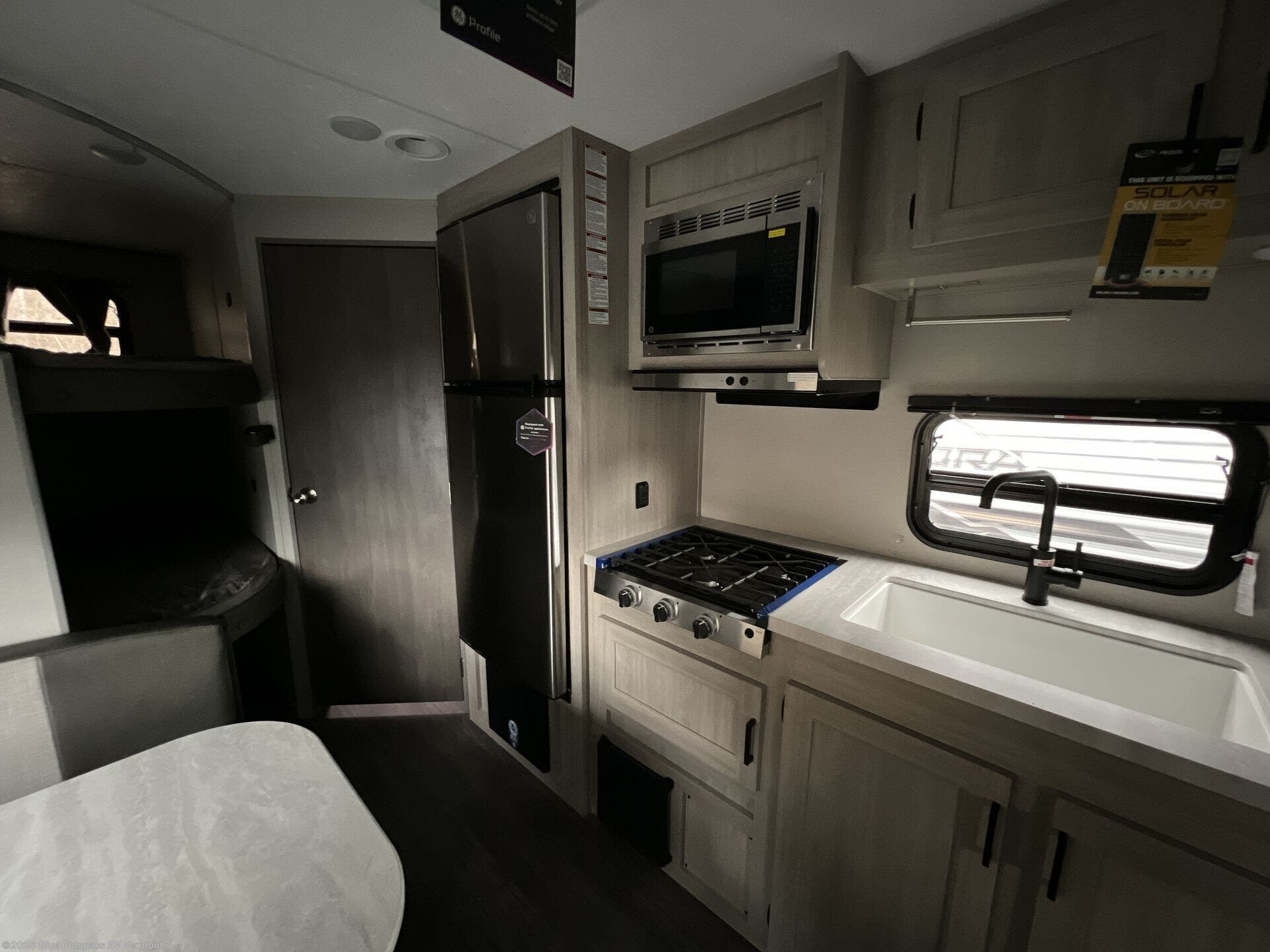 Pack your bags and head out on a fun weekend camping trip with this travel trailer! Whether you have a small family or a few guests wanting to come along, there will be enough sleeping spaces between the double-size bunk beds, the 60" x 74" queen bed in the front semi-private bedroom, and even the booth dinette. The chef can prepare meals indoors using the three burner cooktop or microwave oven, and there is a 12V 10.7 cu. ft. refrigerator for perishables. There is plenty of storage throughout with the overhead cabinets and wardrobes, as well as outside with the front pass-through storage area!