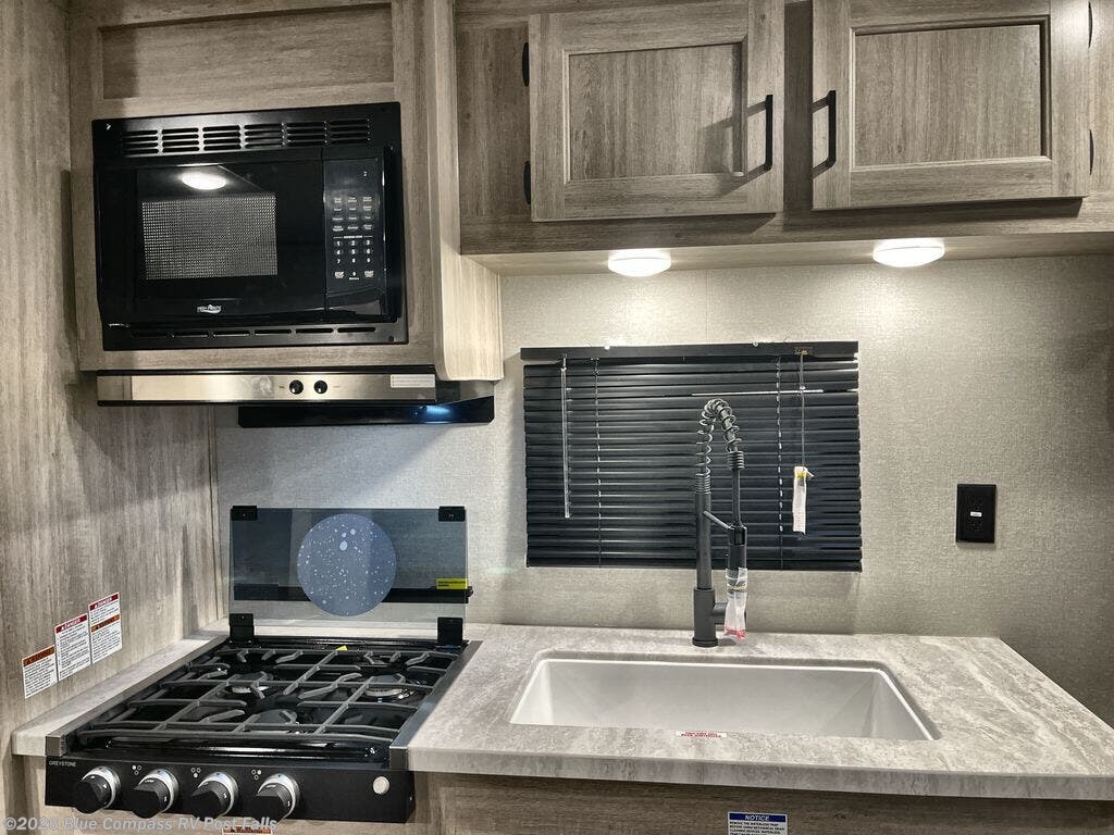 Pack your bags and head out on a fun weekend camping trip with this travel trailer! Whether you have a small family or a few guests wanting to come along, there will be enough sleeping spaces between the double-size bunk beds, the 60" x 74" queen bed in the front semi-private bedroom, and even the booth dinette. The chef can prepare meals indoors using the three burner cooktop or microwave oven, and there is a 12V 10.7 cu. ft. refrigerator for perishables. There is plenty of storage throughout with the overhead cabinets and wardrobes, as well as outside with the front pass-through storage area!