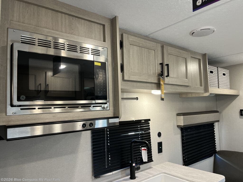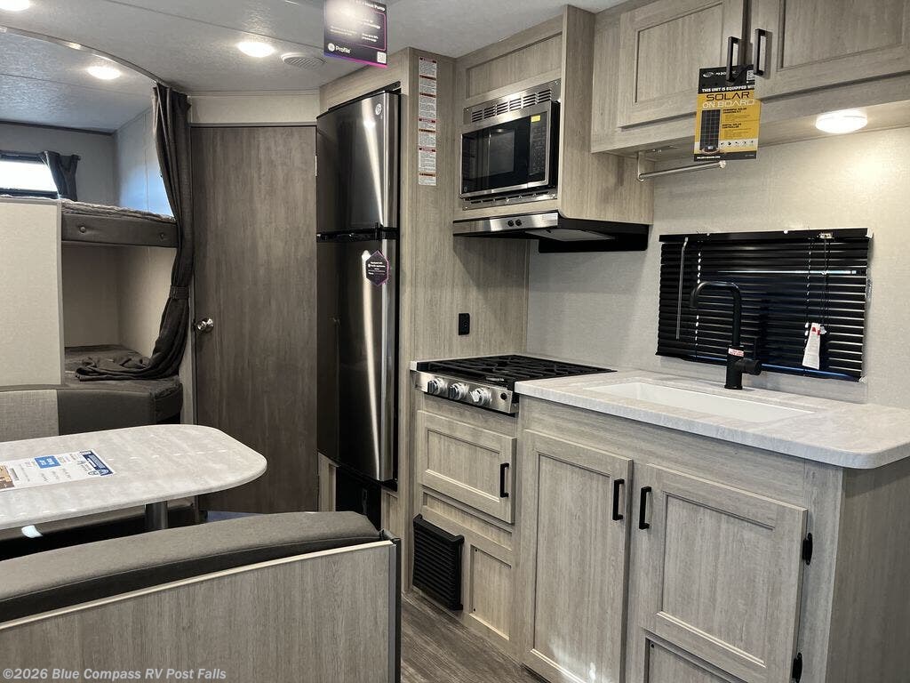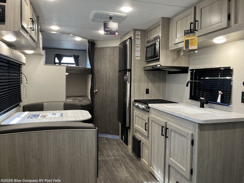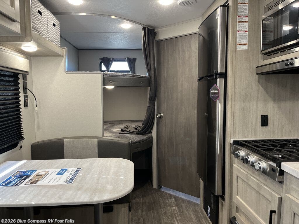 Pack your bags and head out on a fun weekend camping trip with this travel trailer! Whether you have a small family or a few guests wanting to come along, there will be enough sleeping spaces between the double-size bunk beds, the 60" x 74" queen bed in the front semi-private bedroom, and even the booth dinette. The chef can prepare meals indoors using the three burner cooktop or microwave oven, and there is a 12V 10.7 cu. ft. refrigerator for perishables. There is plenty of storage throughout with the overhead cabinets and wardrobes, as well as outside with the front pass-through storage area!