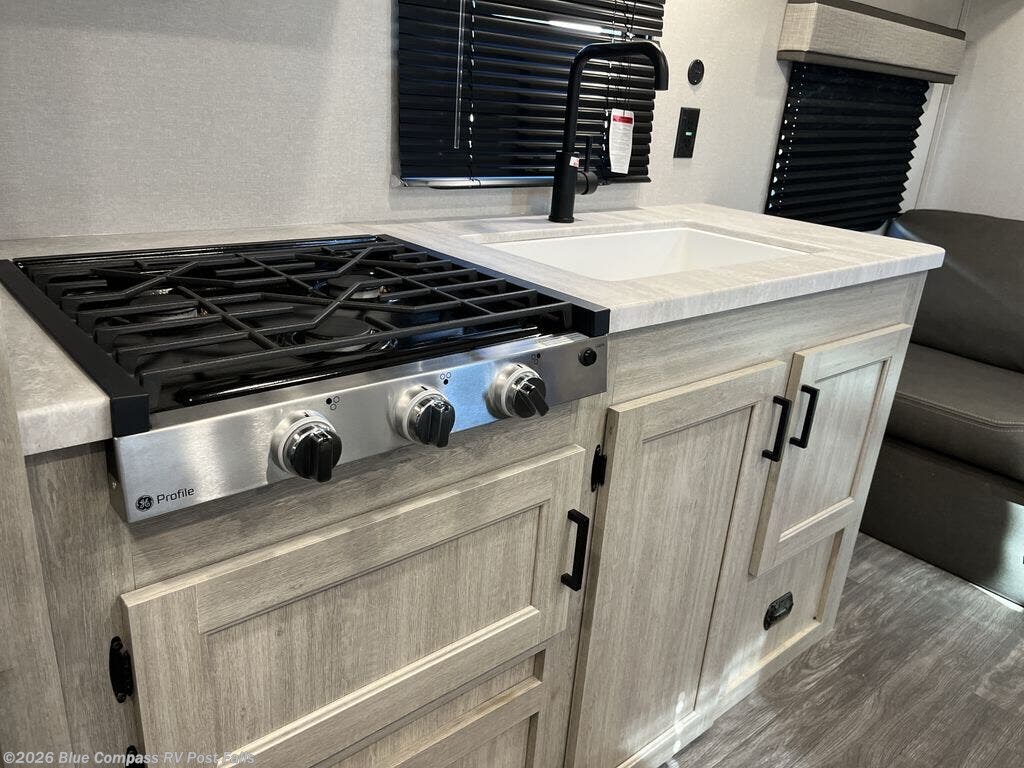 Comfortability, usability, and quality is what you will find in each one of these Forest River Aurora Light travel trailers! They are designed with a superior build and packed full with industry leading, functional, and distinctive standard features. SolidStep entrance steps and a Safe-T rail door assist on main entry door to help you safely enter and exit the unit. The diamond plate rock guard will protect your unit from road debris and the nitrogen filled radial tires, which keep their pressure longer, offer better fuel economy. You will also find upgraded JBL Elite exterior speaker outside, an electric awning with multicolor lights and remote, plus flush mount baggage doors for easy packing. The interiors are beautifully designed with matte black kitchen and bath faucets, black nightshades in the living room, and GE kitchen appliances!