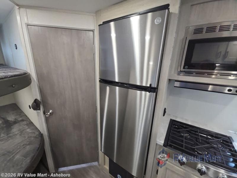 Pack your bags and head out on a fun weekend camping trip with this travel trailer! Whether you have a small family or a few guests wanting to come along, there will be enough sleeping spaces between the double-size bunk beds, the 60" x 74" queen bed in the front semi-private bedroom, and even the booth dinette. The chef can prepare meals indoors using the three burner cooktop or microwave oven, and there is a 12V 10.7 cu. ft. refrigerator for perishables. There is plenty of storage throughout with the overhead cabinets and wardrobes, as well as outside with the front pass-through storage area!