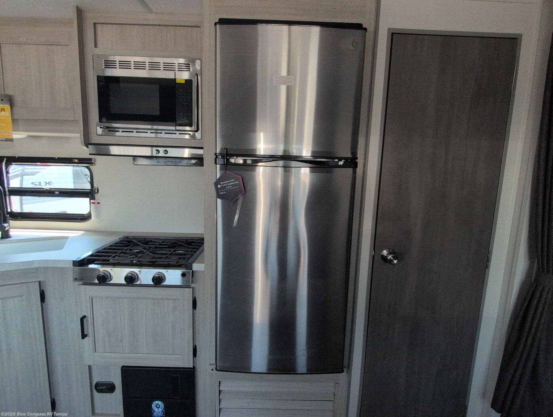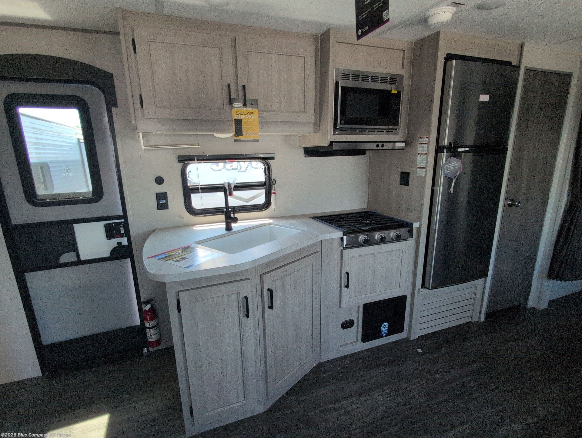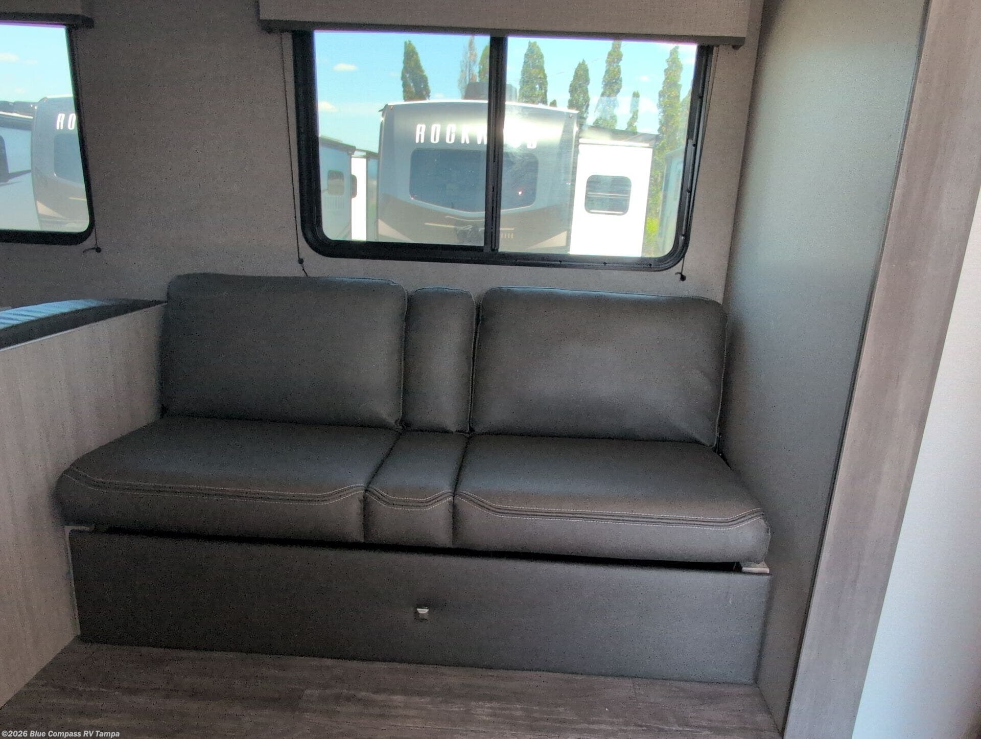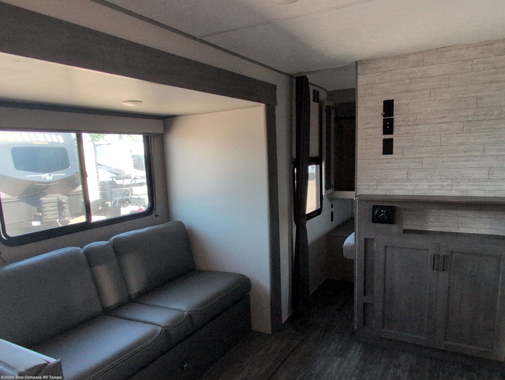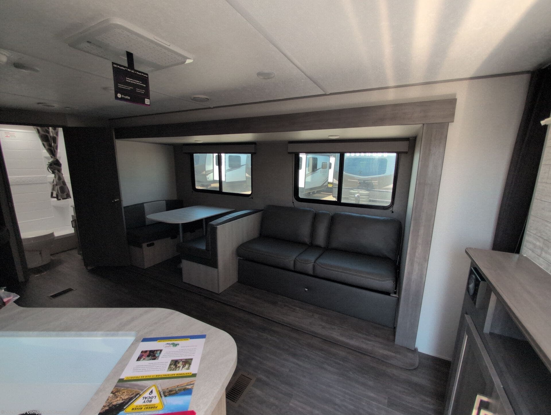 Everyone will have a comfortable time camping in this travel trailer! It features a set of double sized bunk beds for the kids or guests to sleep on and are conveniently next to the rear corner bathroom which has a tub/shower with a skylight above for added natural lighting. The booth dinette and sofa slide opens up the kitchen area so you have more space to prepare your best meals with the three burner cooktop. When you're ready to wind down your nights, grab a snack from the large pantry, a beverage from the 10.7 cu. ft. refrigerator, and place your drink in the cupholder/arm rest of the sofa while you watch a movie at the entertainment center!