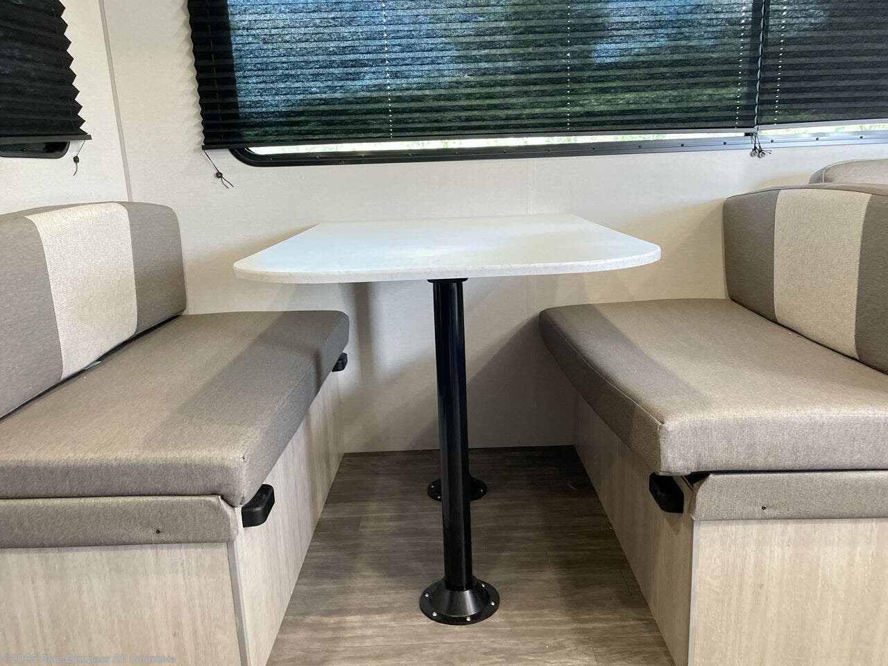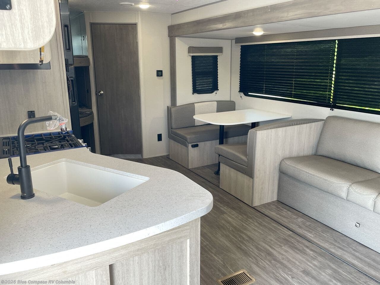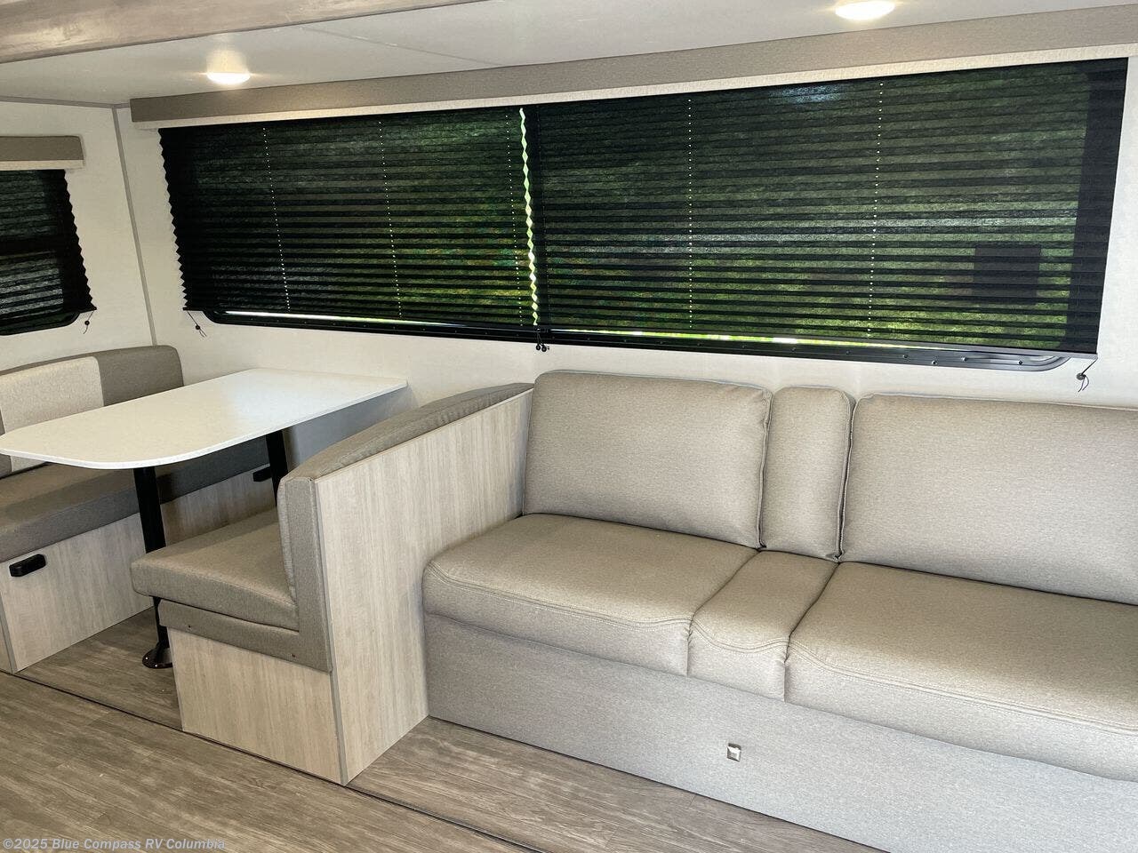 Everyone will have a comfortable time camping in this travel trailer! It features a set of double sized bunk beds for the kids or guests to sleep on and are conveniently next to the rear corner bathroom which has a tub/shower with a skylight above for added natural lighting. The booth dinette and sofa slide opens up the kitchen area so you have more space to prepare your best meals with the three burner cooktop. When you're ready to wind down your nights, grab a snack from the large pantry, a beverage from the 10.7 cu. ft. refrigerator, and place your drink in the cupholder/arm rest of the sofa while you watch a movie at the entertainment center!