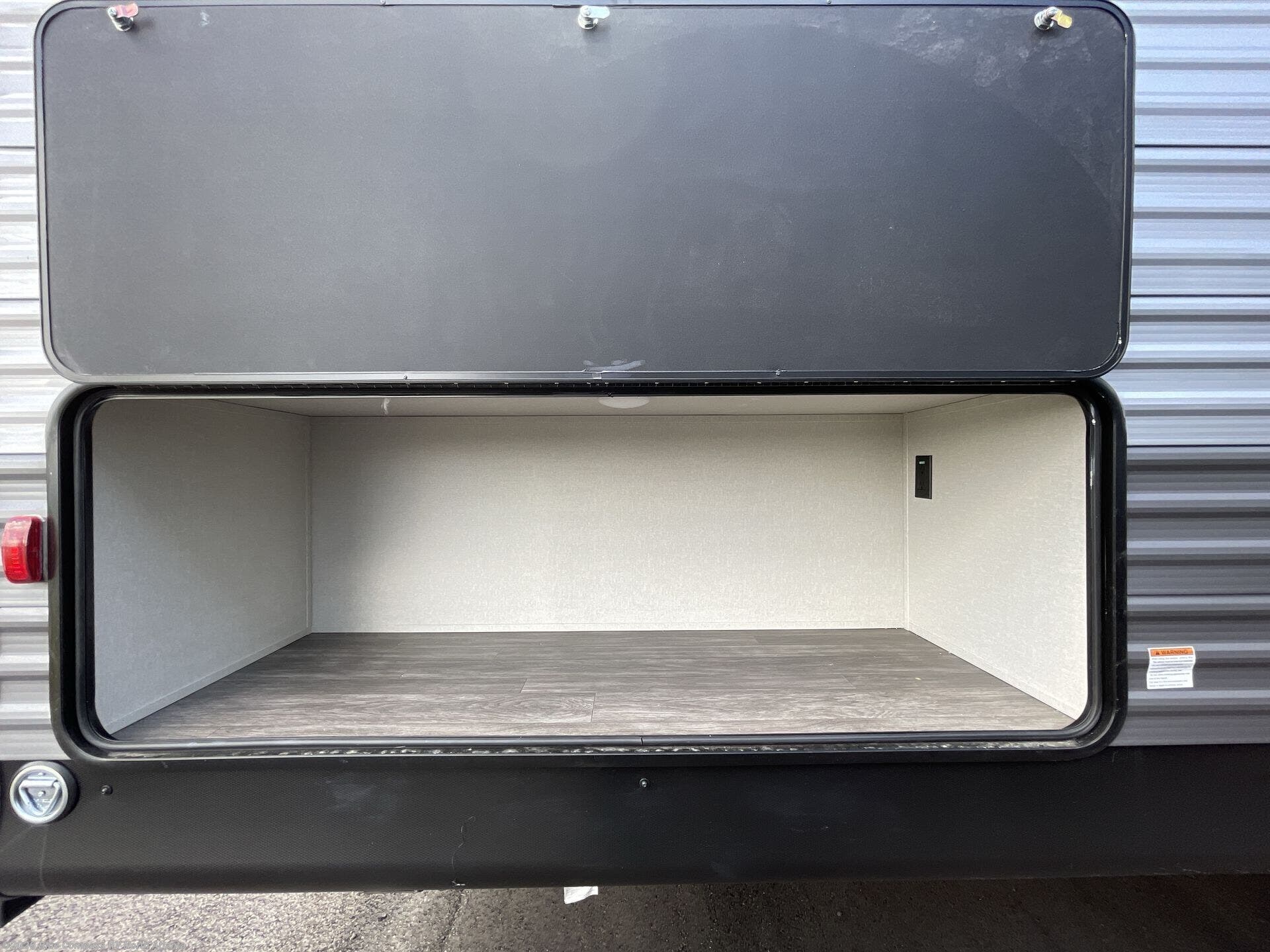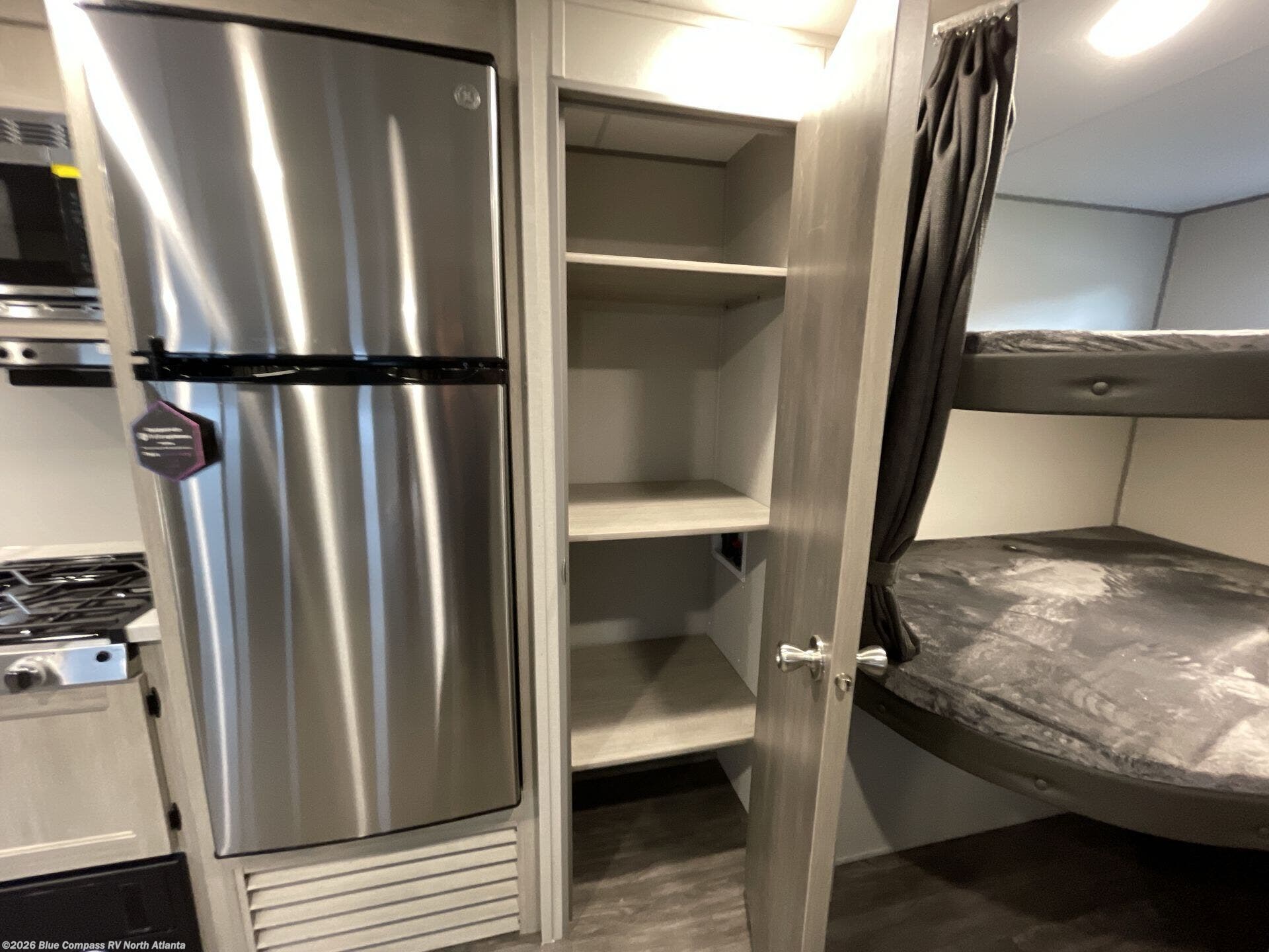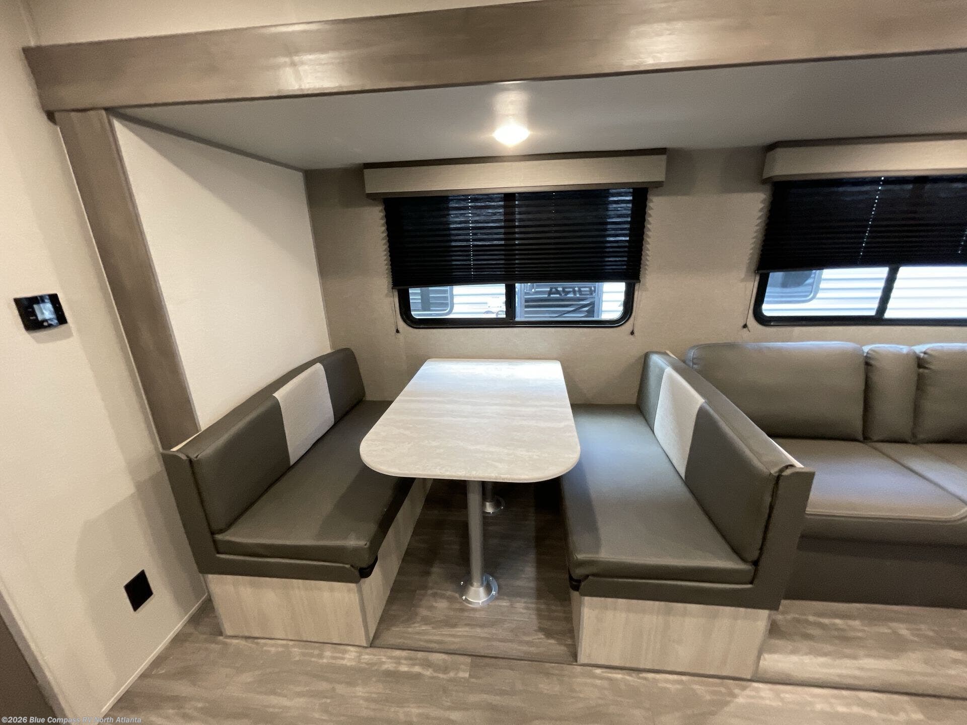 Everyone will have a comfortable time camping in this travel trailer! It features a set of double sized bunk beds for the kids or guests to sleep on and are conveniently next to the rear corner bathroom which has a tub/shower with a skylight above for added natural lighting. The booth dinette and sofa slide opens up the kitchen area so you have more space to prepare your best meals with the three burner cooktop. When you're ready to wind down your nights, grab a snack from the large pantry, a beverage from the 10.7 cu. ft. refrigerator, and place your drink in the cupholder/arm rest of the sofa while you watch a movie at the entertainment center!