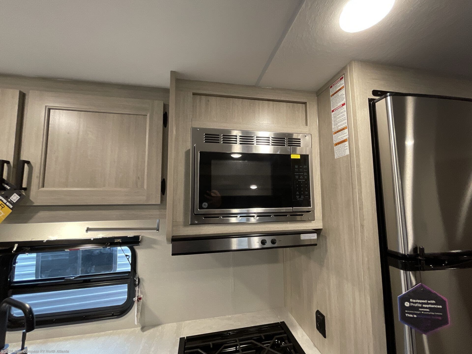 Comfortability, usability, and quality is what you will find in each one of these Forest River Aurora Light travel trailers! They are designed with a superior build and packed full with industry leading, functional, and distinctive standard features. SolidStep entrance steps and a Safe-T rail door assist on main entry door to help you safely enter and exit the unit. The diamond plate rock guard will protect your unit from road debris and the nitrogen filled radial tires, which keep their pressure longer, offer better fuel economy. You will also find upgraded JBL Elite exterior speaker outside, an electric awning with multicolor lights and remote, plus flush mount baggage doors for easy packing. The interiors are beautifully designed with matte black kitchen and bath faucets, black nightshades in the living room, and GE kitchen appliances!