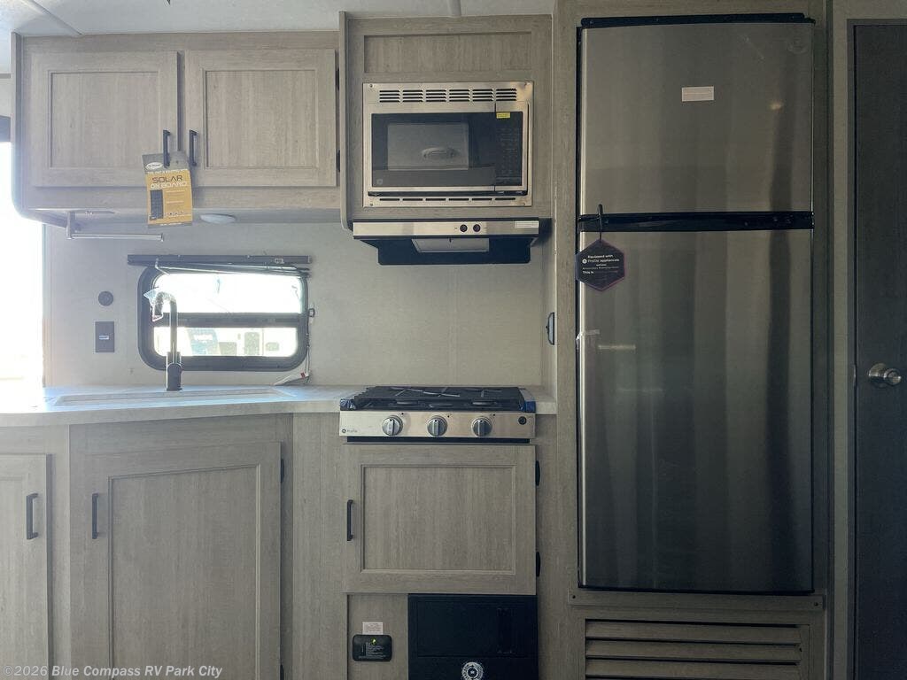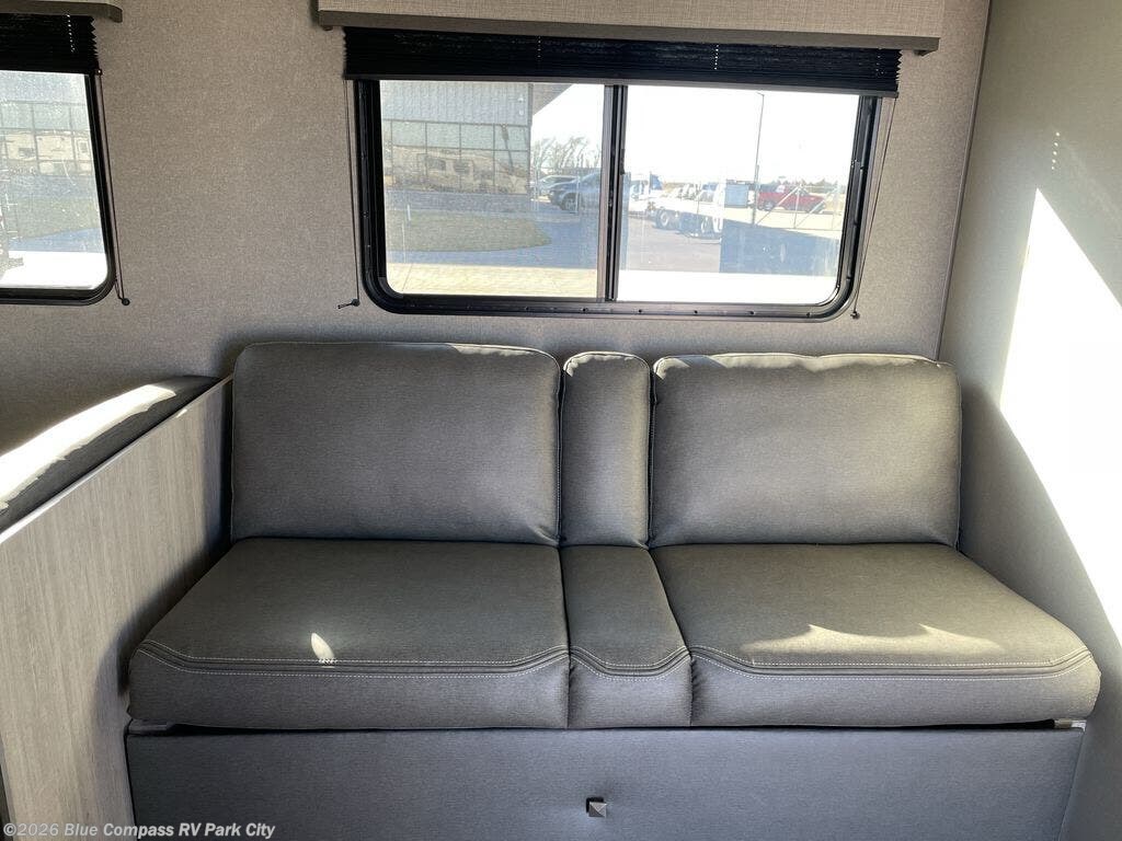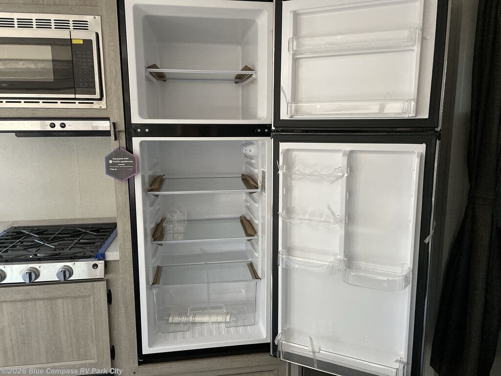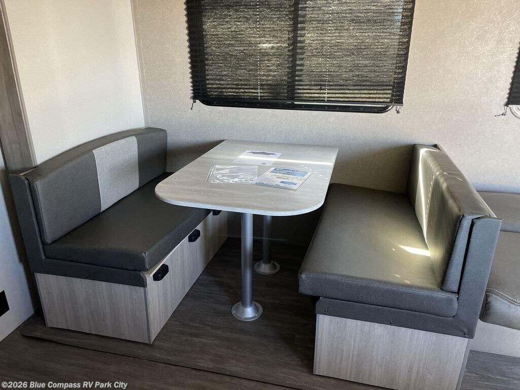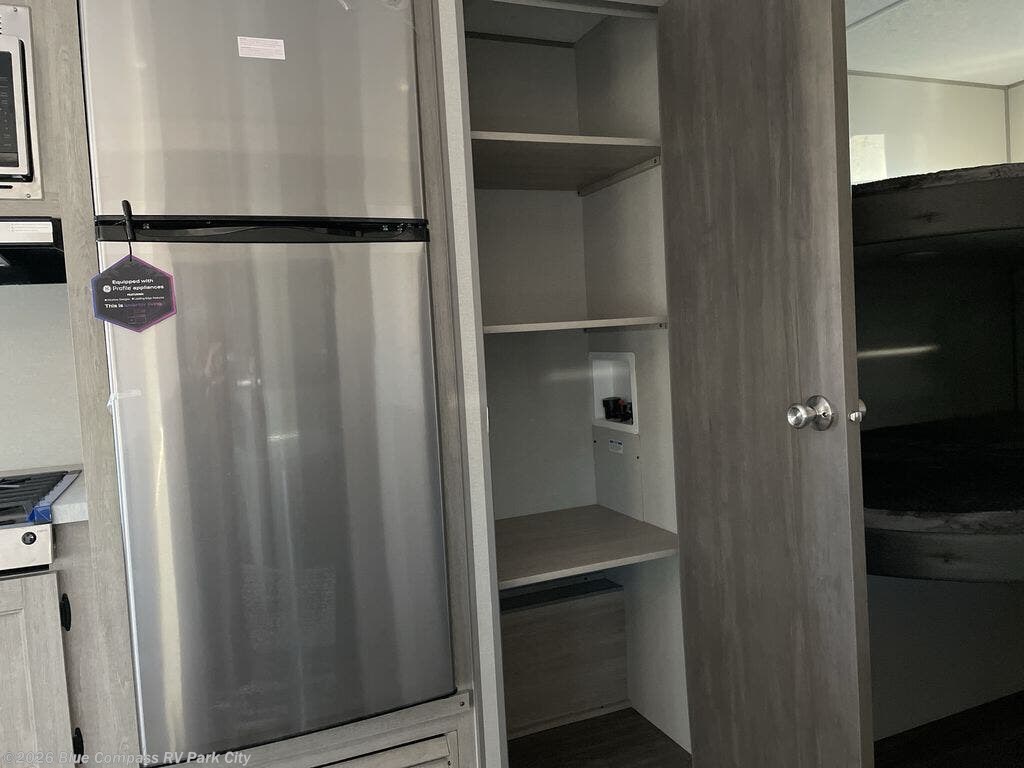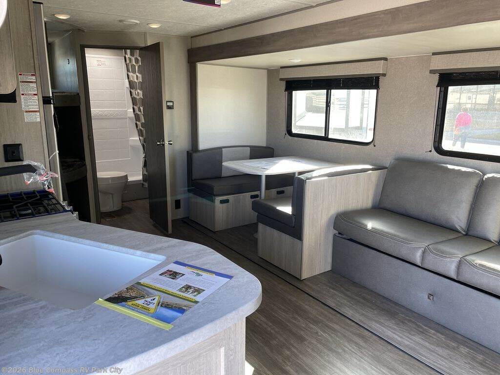 Everyone will have a comfortable time camping in this travel trailer! It features a set of double sized bunk beds for the kids or guests to sleep on and are conveniently next to the rear corner bathroom which has a tub/shower with a skylight above for added natural lighting. The booth dinette and sofa slide opens up the kitchen area so you have more space to prepare your best meals with the three burner cooktop. When you're ready to wind down your nights, grab a snack from the large pantry, a beverage from the 10.7 cu. ft. refrigerator, and place your drink in the cupholder/arm rest of the sofa while you watch a movie at the entertainment center!