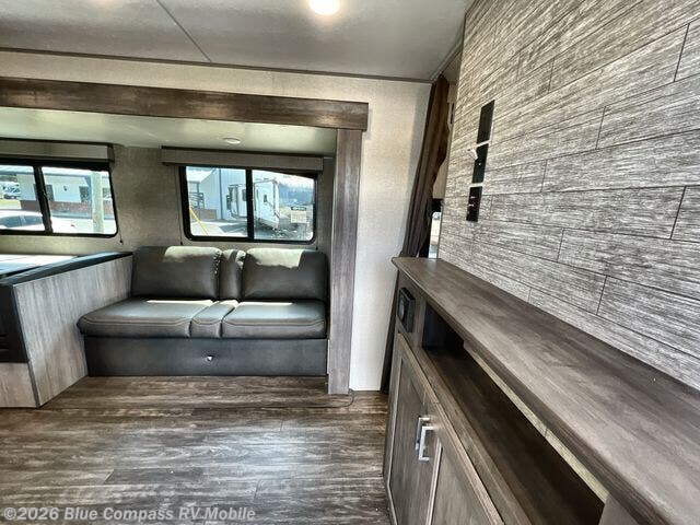 Everyone will have a comfortable time camping in this travel trailer! It features a set of double sized bunk beds for the kids or guests to sleep on and are conveniently next to the rear corner bathroom which has a tub/shower with a skylight above for added natural lighting. The booth dinette and sofa slide opens up the kitchen area so you have more space to prepare your best meals with the three burner cooktop. When you're ready to wind down your nights, grab a snack from the large pantry, a beverage from the 10.7 cu. ft. refrigerator, and place your drink in the cupholder/arm rest of the sofa while you watch a movie at the entertainment center!