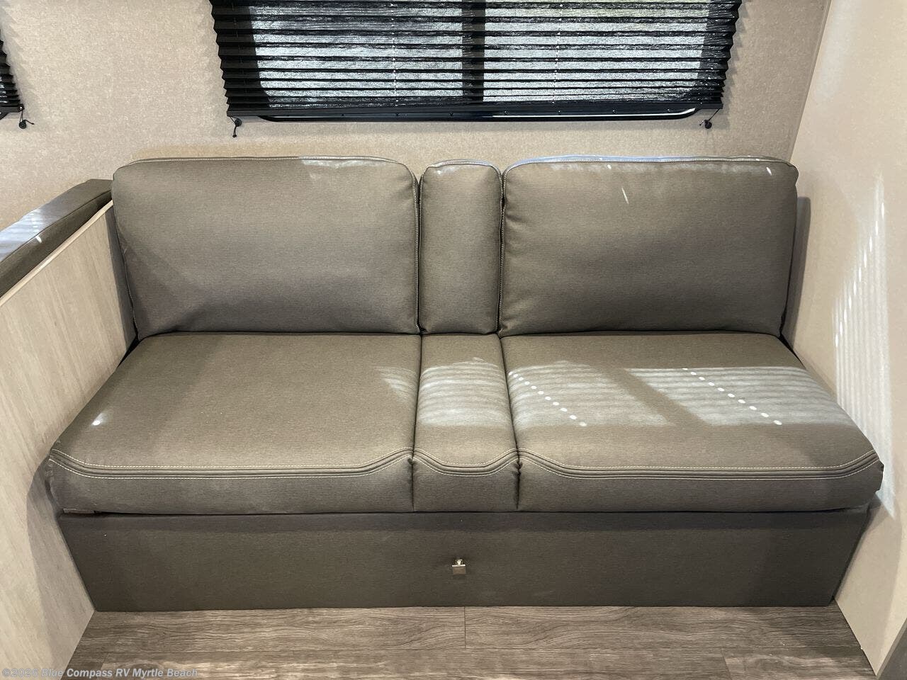 Everyone will have a comfortable time camping in this travel trailer! It features a set of double sized bunk beds for the kids or guests to sleep on and are conveniently next to the rear corner bathroom which has a tub/shower with a skylight above for added natural lighting. The booth dinette and sofa slide opens up the kitchen area so you have more space to prepare your best meals with the three burner cooktop. When you're ready to wind down your nights, grab a snack from the large pantry, a beverage from the 10.7 cu. ft. refrigerator, and place your drink in the cupholder/arm rest of the sofa while you watch a movie at the entertainment center!