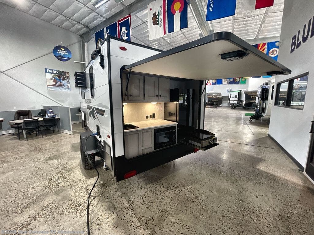 When you want to explore choose this travel trailer for your basic off-road adventure needs and a bit more by offering you a 54" X 74" flip-up bed with storage beneath, and gaucho seating that pulls out into a bed for an additional camper at night. There is front and rear overhead cabinetry for storage, and a cassette toilet for added convenience especially at night. A rear hatch camp kitchen provides a place for you to create meals and snacks while you explore. There is a slide-out griddle and grill combo cooktop, a 12-volt refrigerator for your cold items, a single sink, and a microwave cabinet for quick meals. A 9' awning creates a bit of added outdoor living space where you can set up your camp chairs. You can also add an optional roof-top tent for additional sleeping.