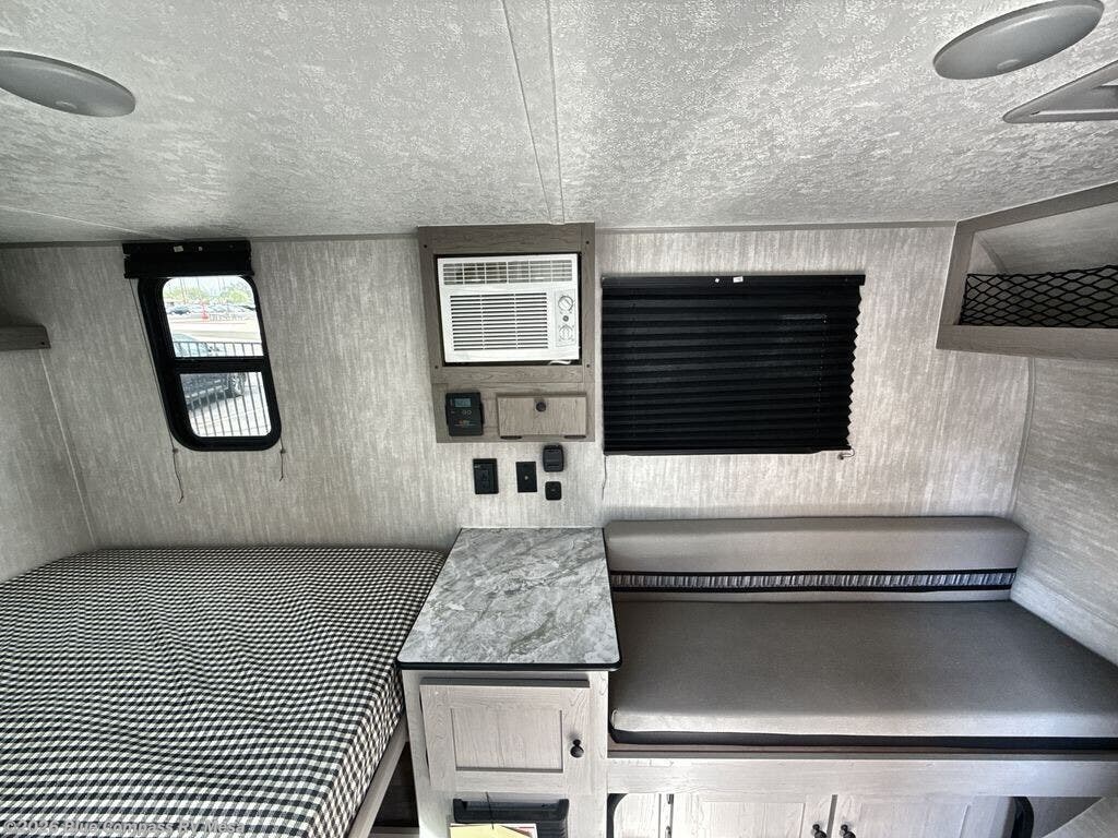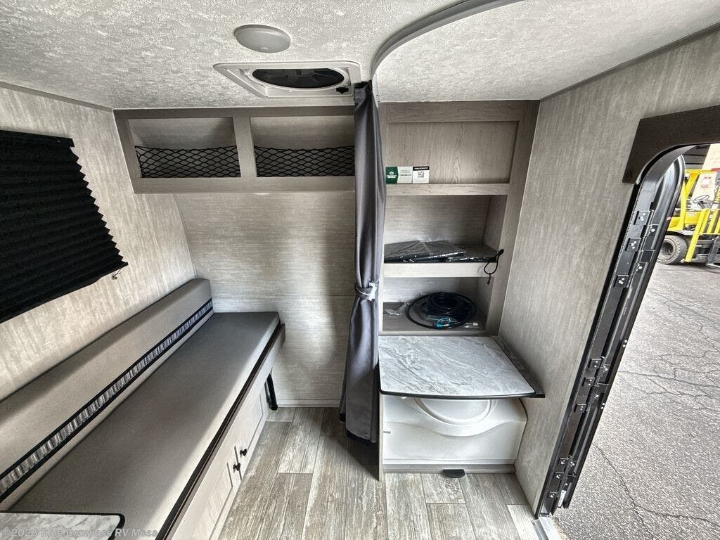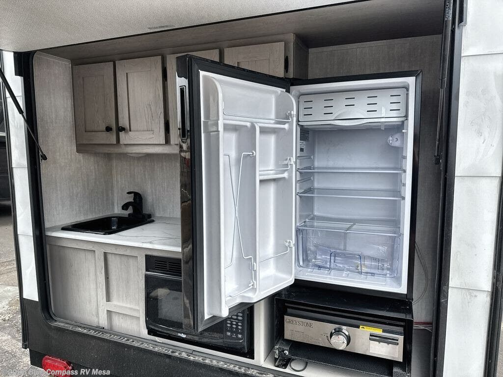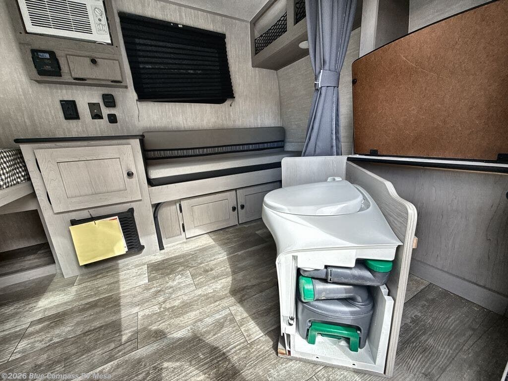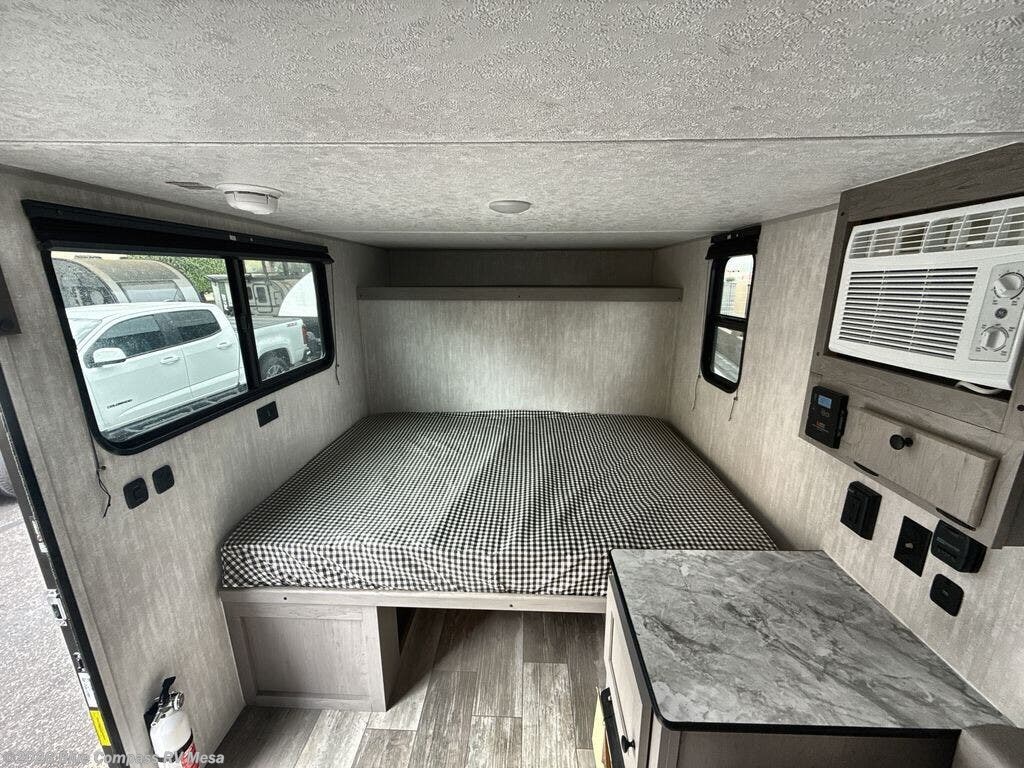 When you want to explore choose this travel trailer for your basic off-road adventure needs and a bit more by offering you a 54" X 74" flip-up bed with storage beneath, and gaucho seating that pulls out into a bed for an additional camper at night. There is front and rear overhead cabinetry for storage, and a cassette toilet for added convenience especially at night. A rear hatch camp kitchen provides a place for you to create meals and snacks while you explore. There is a slide-out griddle and grill combo cooktop, a 12-volt refrigerator for your cold items, a single sink, and a microwave cabinet for quick meals. A 9' awning creates a bit of added outdoor living space where you can set up your camp chairs. You can also add an optional roof-top tent for additional sleeping.