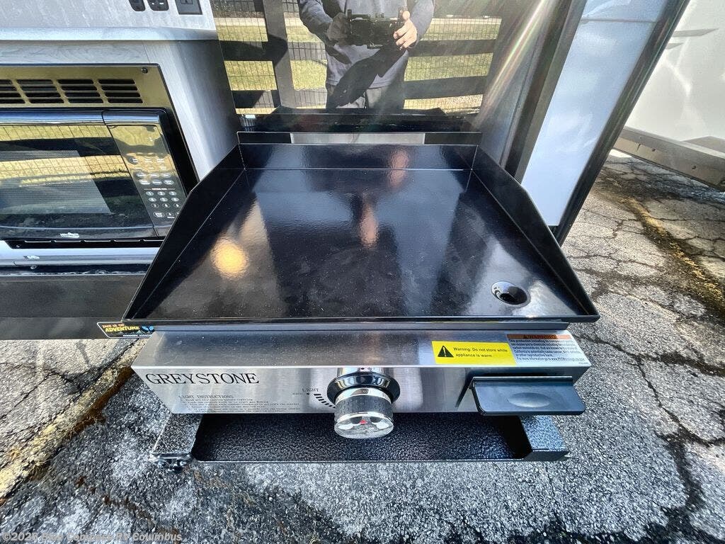 When you want to explore choose this travel trailer for your basic off-road adventure needs and a bit more by offering you a 54" X 74" flip-up bed with storage beneath, and gaucho seating that pulls out into a bed for an additional camper at night. There is front and rear overhead cabinetry for storage, and a cassette toilet for added convenience especially at night. A rear hatch camp kitchen provides a place for you to create meals and snacks while you explore. There is a slide-out griddle and grill combo cooktop, a 12-volt refrigerator for your cold items, a single sink, and a microwave cabinet for quick meals. A 9' awning creates a bit of added outdoor living space where you can set up your camp chairs. You can also add an optional roof-top tent for additional sleeping.