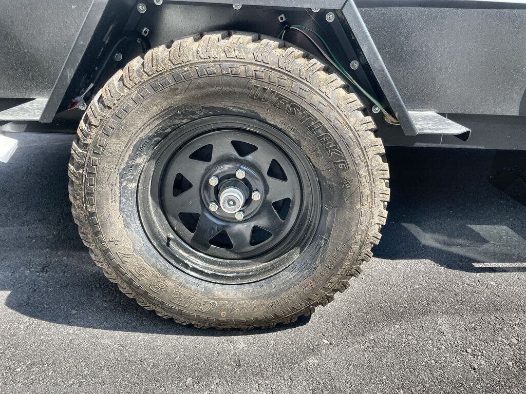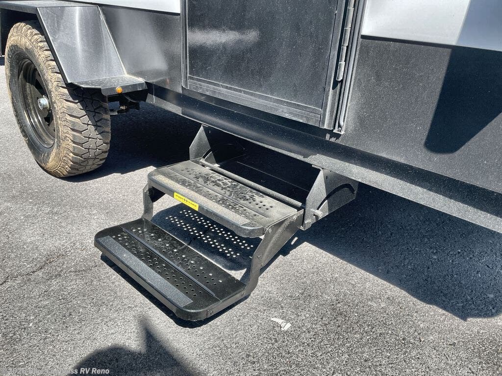 When you want to explore choose this travel trailer for your basic off-road adventure needs and a bit more by offering you a 54" X 74" flip-up bed with storage beneath, and gaucho seating that pulls out into a bed for an additional camper at night. There is front and rear overhead cabinetry for storage, and a cassette toilet for added convenience especially at night. A rear hatch camp kitchen provides a place for you to create meals and snacks while you explore. There is a slide-out griddle and grill combo cooktop, a 12-volt refrigerator for your cold items, a single sink, and a microwave cabinet for quick meals. A 9' awning creates a bit of added outdoor living space where you can set up your camp chairs. You can also add an optional roof-top tent for additional sleeping.