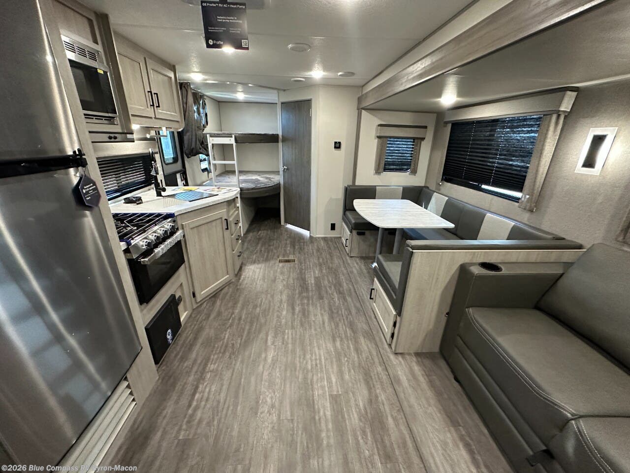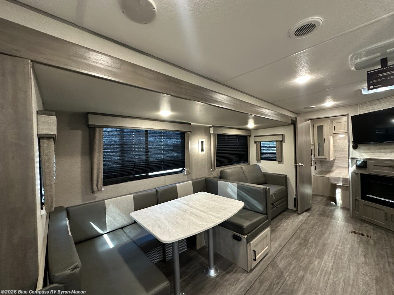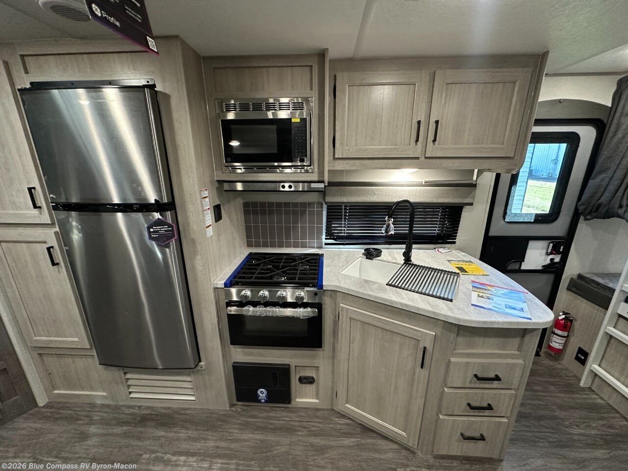 Life is easier in this travel trailer with dual entry doors! One of the entrances leads directly into the front private bedroom which features a 60" x 74" RV queen bed with wardrobes on either side to hang your clothes as well as a coat closet. The second entrance is right by the double-size bed bunks and rear corner bathroom that has a tub/shower combo with skylight above for more natural lighting. The living area has everything you need for a cozy evening indoors between the sofa with arm rests/cupholders to set your drink on while you enjoy the entertainment center, or you can play a few card games at the U-shaped dinette. Cook a sunrise breakfast at the outside camper kitchen with the pull out griddle, a cabinet for storage, and a refrigerator for cold orange juice! You can also add an optional fireplace if you like.
