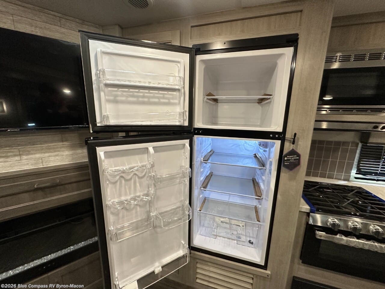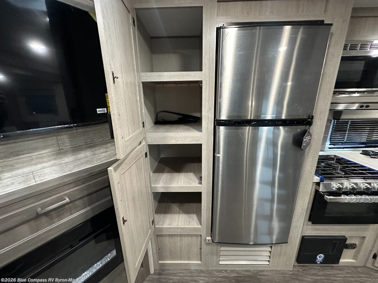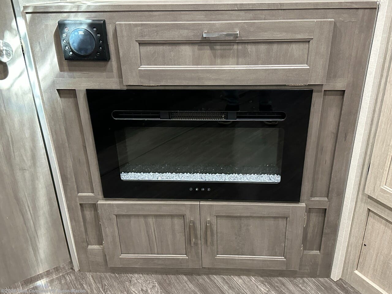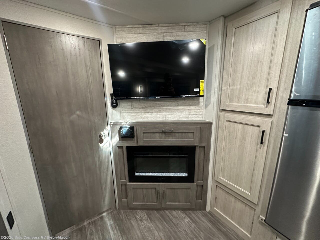 Life is easier in this travel trailer with dual entry doors! One of the entrances leads directly into the front private bedroom which features a 60" x 74" RV queen bed with wardrobes on either side to hang your clothes as well as a coat closet. The second entrance is right by the double-size bed bunks and rear corner bathroom that has a tub/shower combo with skylight above for more natural lighting. The living area has everything you need for a cozy evening indoors between the sofa with arm rests/cupholders to set your drink on while you enjoy the entertainment center, or you can play a few card games at the U-shaped dinette. Cook a sunrise breakfast at the outside camper kitchen with the pull out griddle, a cabinet for storage, and a refrigerator for cold orange juice! You can also add an optional fireplace if you like.