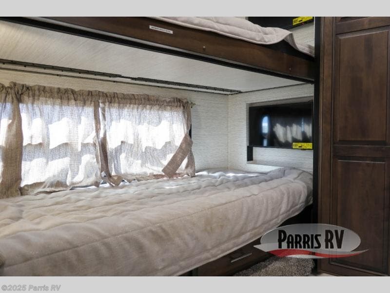 Nothing says comfort like triple slides, two full baths, plus bunk beds! You'll enjoy all that and more in this cozy coach. The large wardrobe/bunk beds are right across from one of the full baths for convenience, and the other full bath is tucked away in the back for privacy. There is a king bed slide out in the master bedroom, as well as a 32'' LED TV and a bedroom ceiling fan to keep the air flowing. The little ones will love the overhead bunk lift, and any other guests can sleep on the hide-a-bed sofa or the booth dinette. When it comes time to cook meals, the two burner electric induction cooktop and convection microwave will get the job done, and the residential refrigerator can store all the perishables.