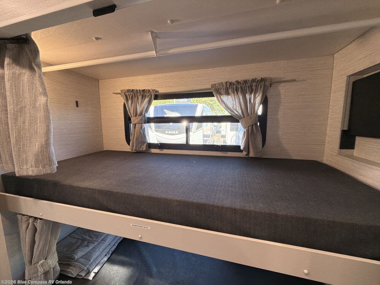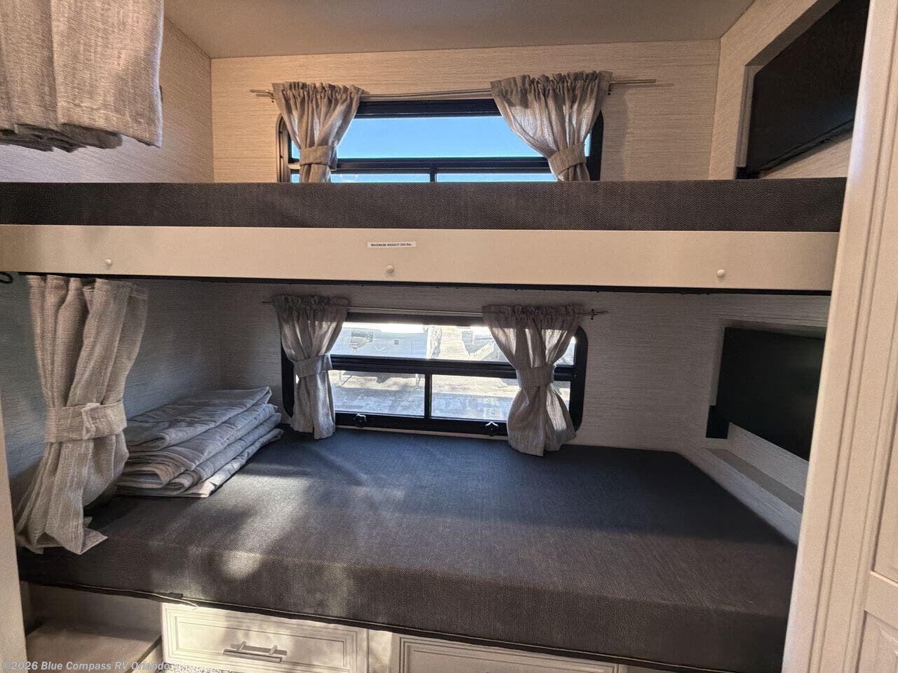 Experience a home away from home with this motorhome! The whole family will have a comfortable place to sleep between the bunk lift above the cab, the 72" x 80" king bed, the set of 30" x 73" bunk beds, the jackknife sofa, and even the booth dinette once converted. Storage space isn't lacking with overhead cabinets throughout, kitchen pantry, and bedroom wardrobe. The full rear bathroom has a shower and a washer and dryer, and the second full bathroom also has a shower so everyone can get ready two times faster. The porcelain tile flooring throughout will be easy to clean and the fireplace creates the perfect relaxing evening indoors. Watch the big game at the exterior entertainment center while staying protected by the 18' Carefree latitude awning with LED lights and wind sensor!