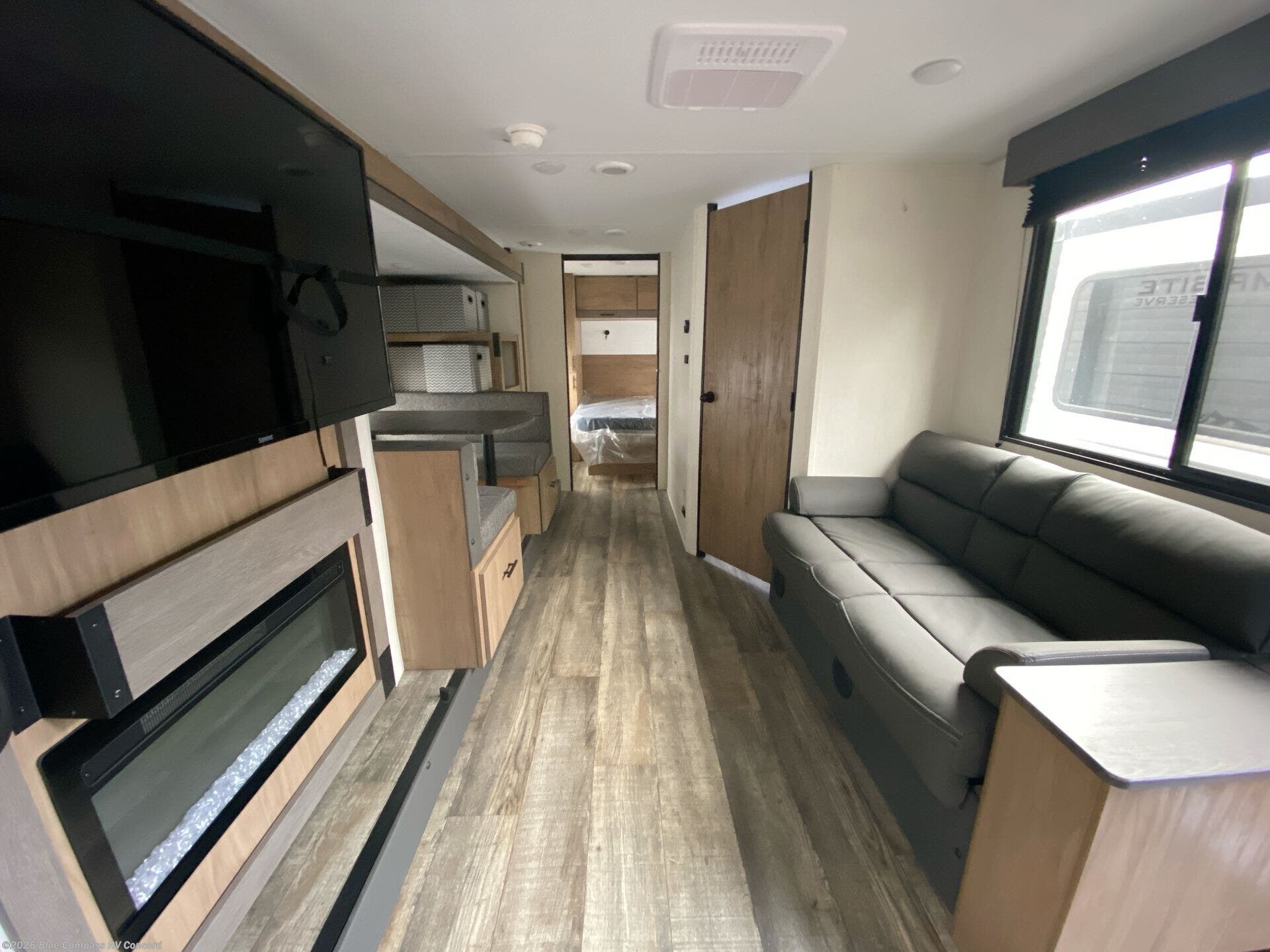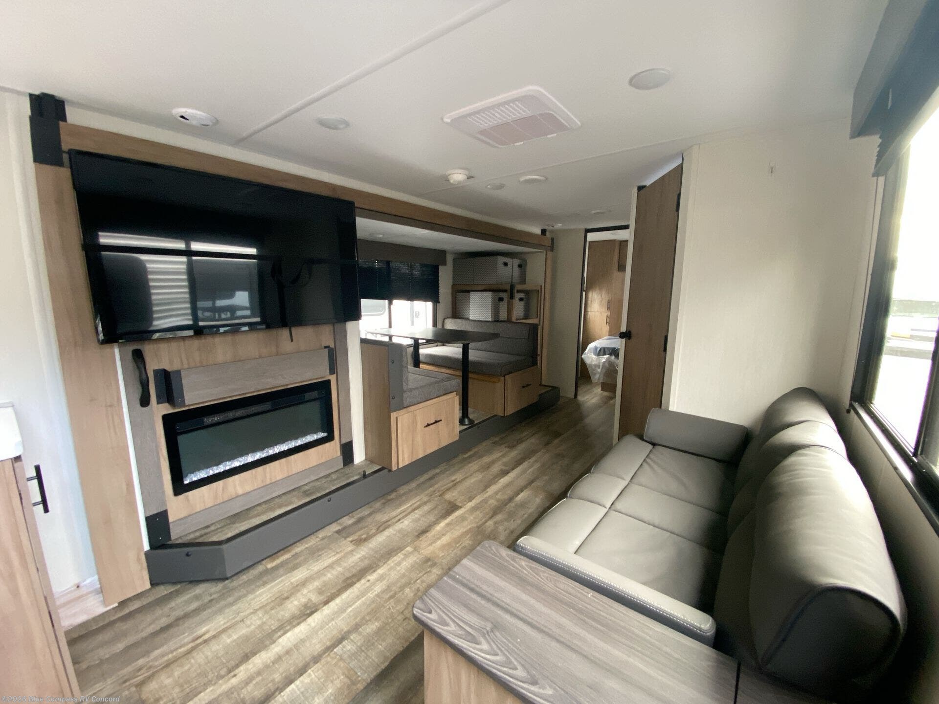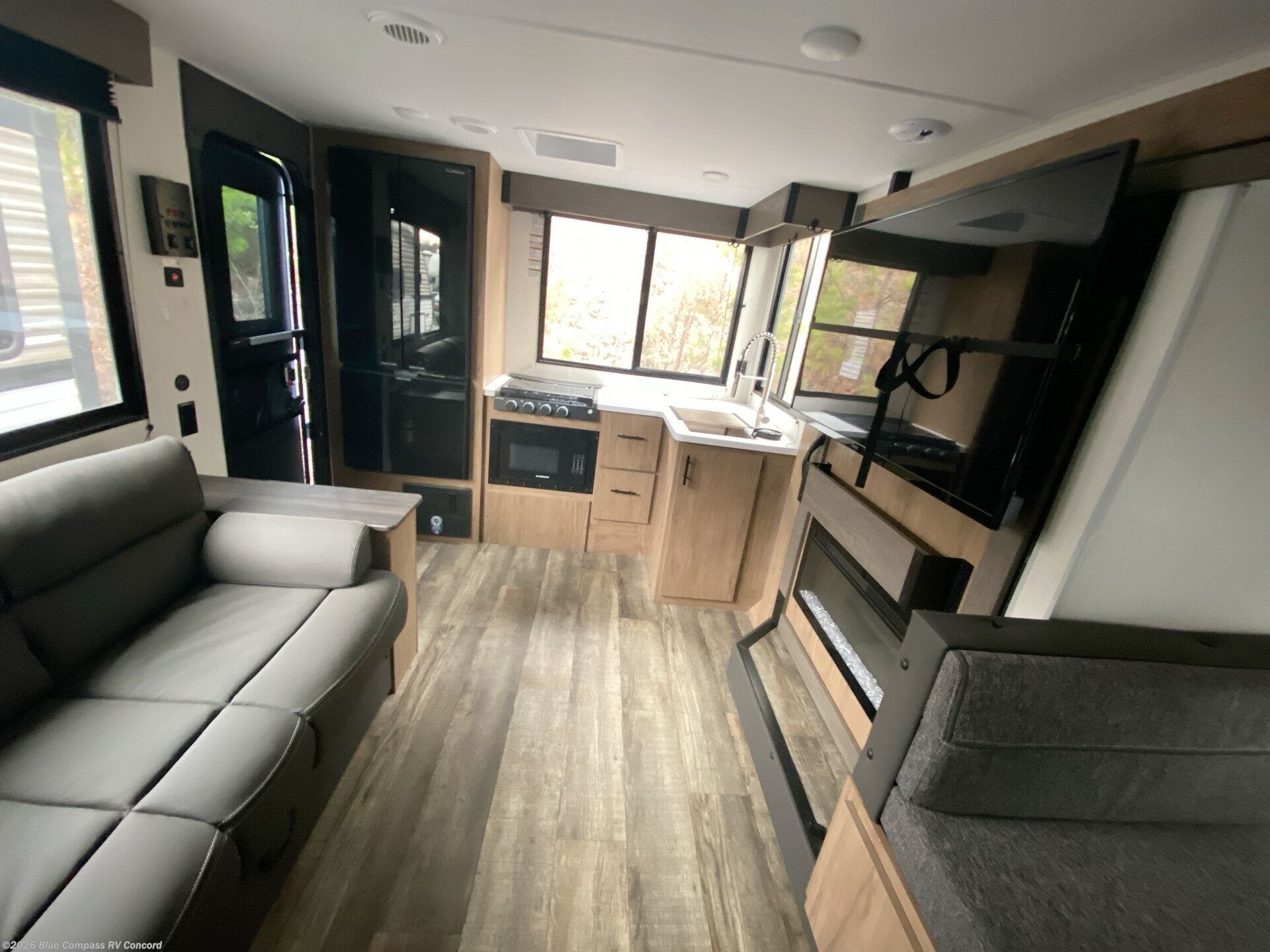 It won't be hard to find comfort in this spacious travel trailer! A front private bedroom is sure to make you feel right at home, and you'll find a bedside wardrobe, overhead cabinets, plus a TV mount if you choose to add entertainment here. In the main living area, your crew can relax on the sofa with panoramic windows behind it for great outdoor views. There is also a booth dinette within the large slide out. Ample storage is also found here, including hidden shelves behind the entertainment center with a fireplace. Head to the rear kitchen where you'll find generous counter space and all the appliances needed to make meals each day!